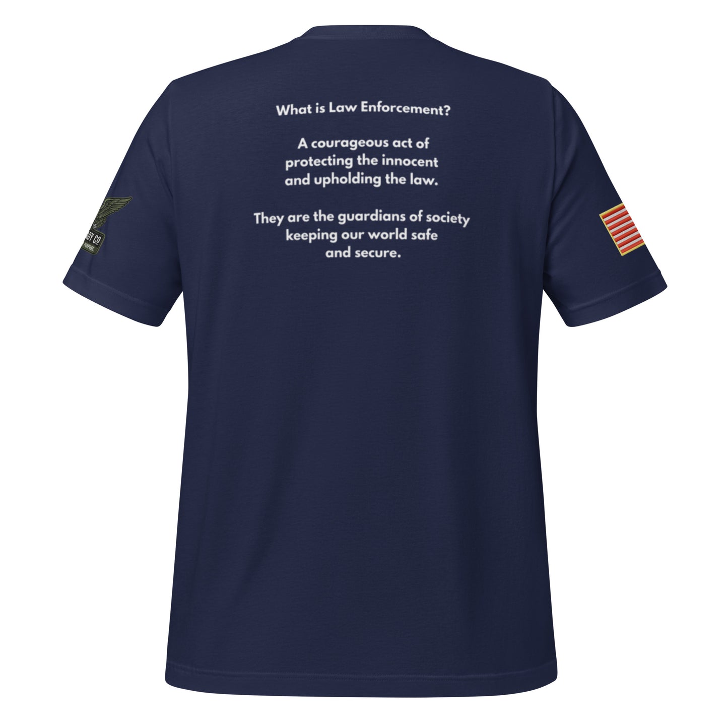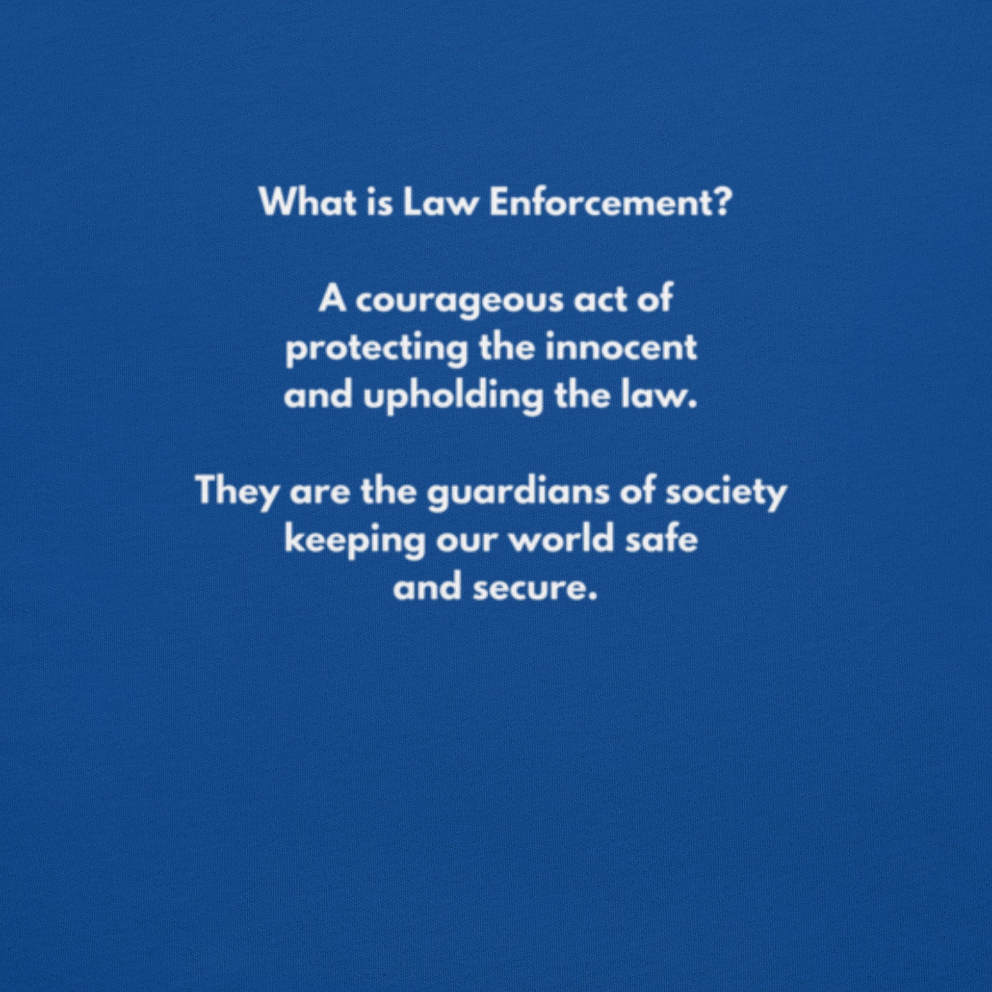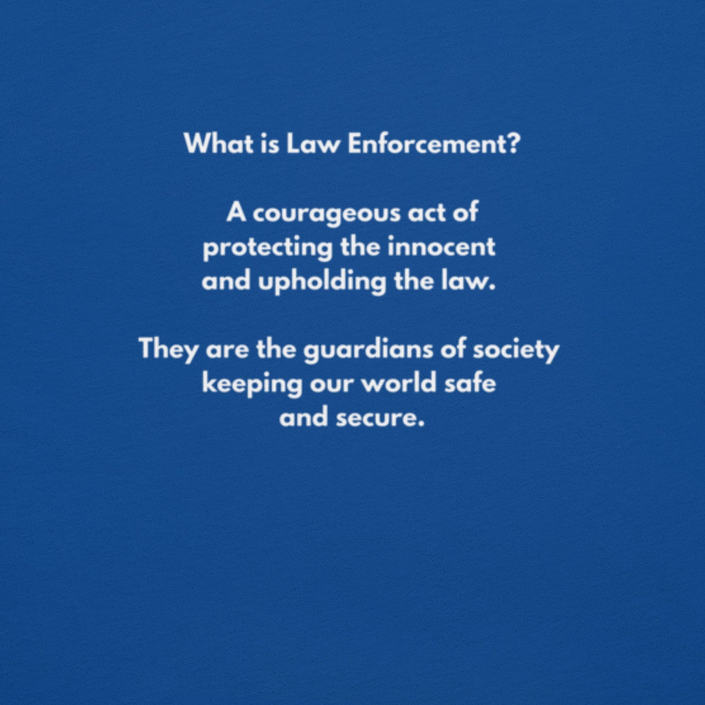 Turn the shirt around, and you'll find the deeper meaning behind the call to action. The question, "What is Law Enforcement?" is answered with a profound truth: "A courageous act of protecting the innocent and upholding the law. They are the guardians of society, keeping our world safe and secure."