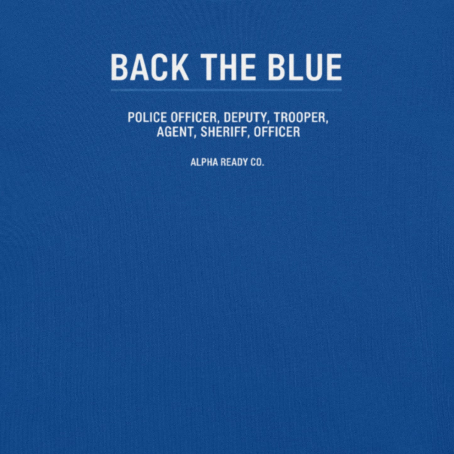 The front features a clear, bold message: "Back The Blue," accompanied by a roll call of those who serve: Police Officer, Deputy, Trooper, Agent, and Officer.