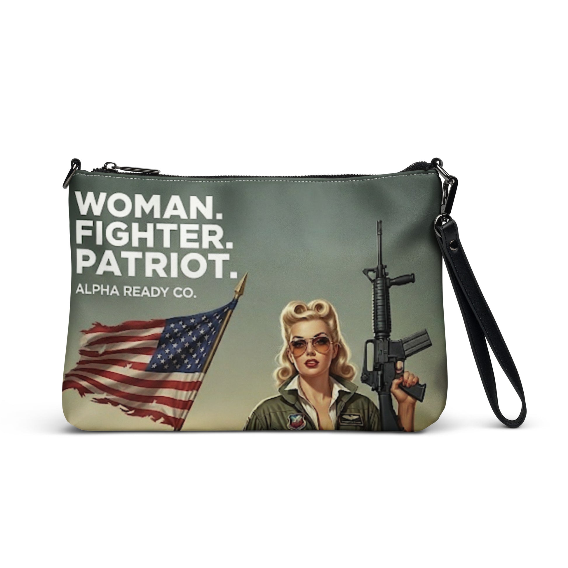 The front features a striking image of a blonde fighter pilot pin-up girl, boldly carrying your creed: "Woman. Fighter. Patriot." This image is a tribute to the resilient spirit and enduring legacy of our nation's heroes.