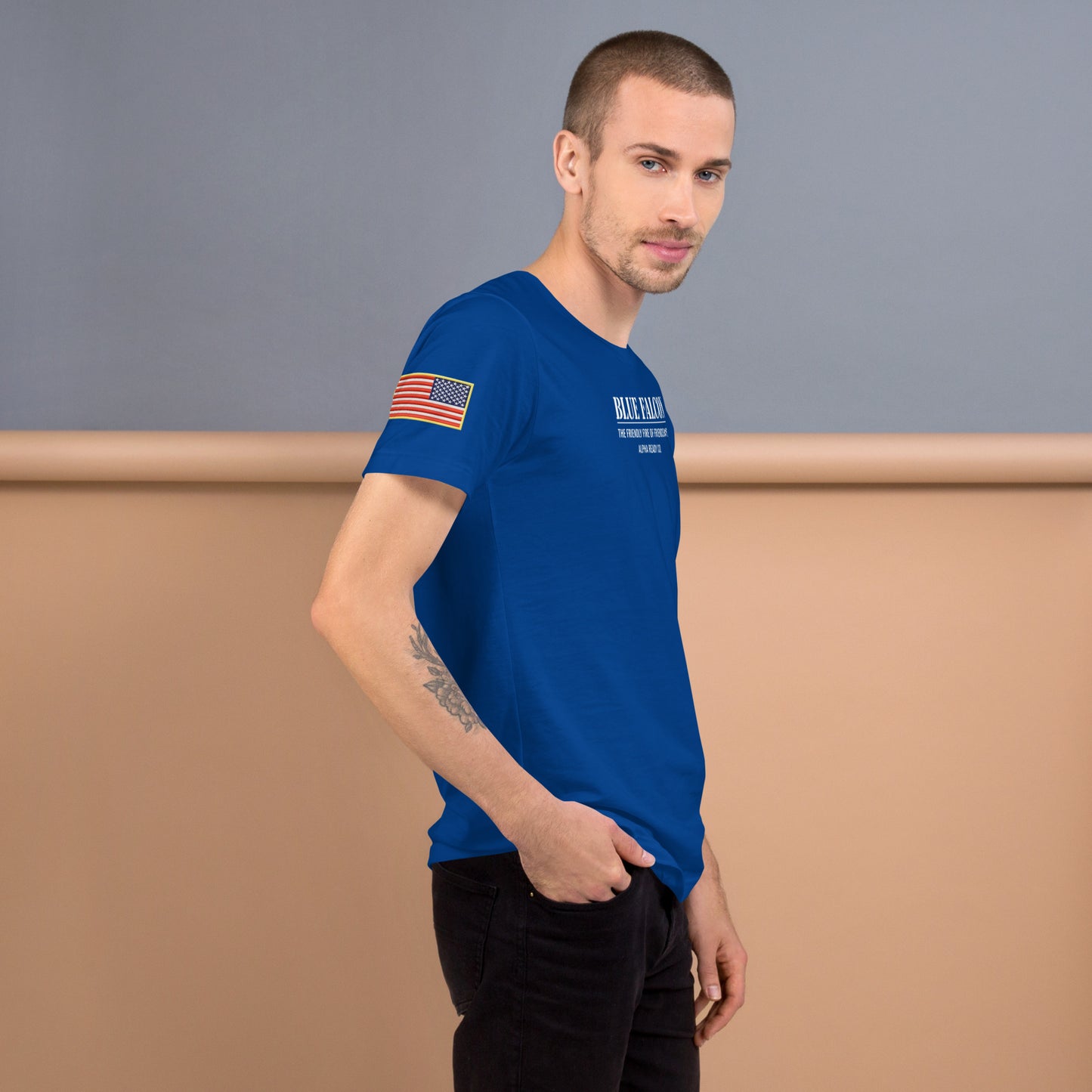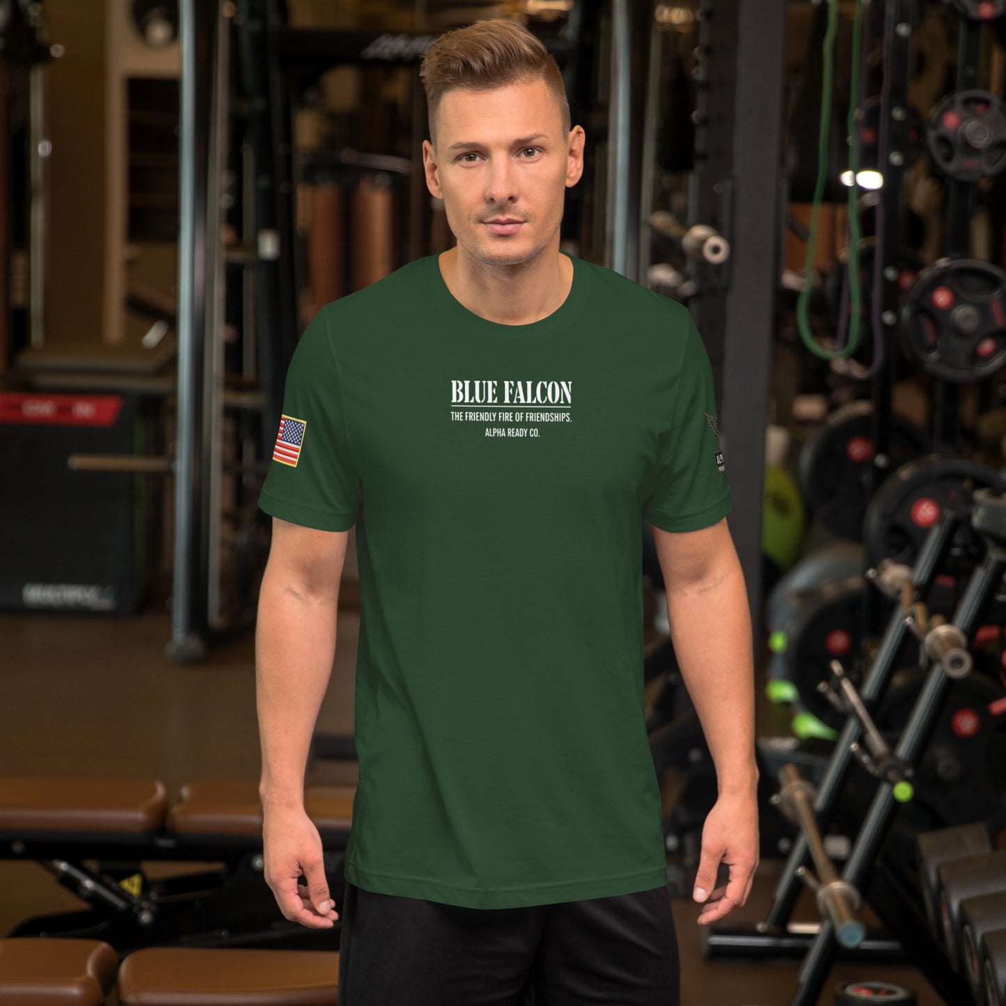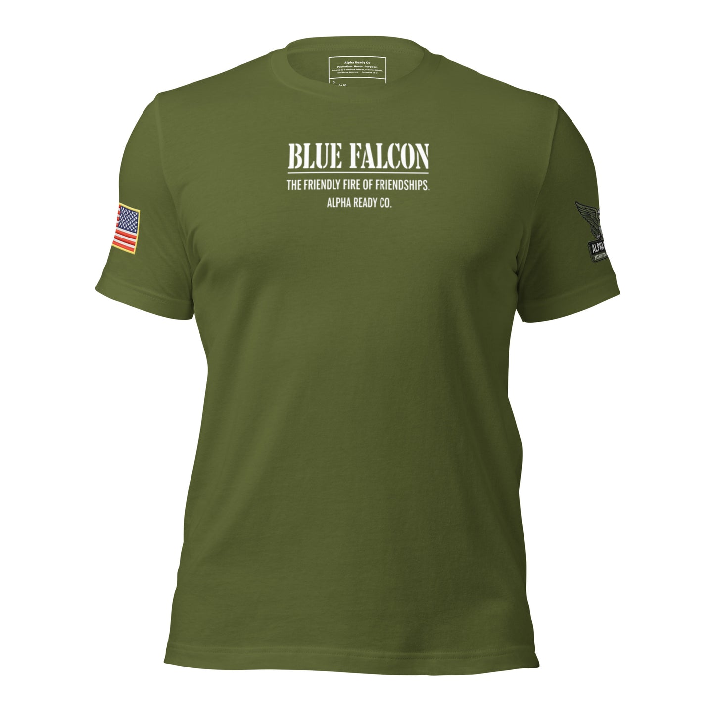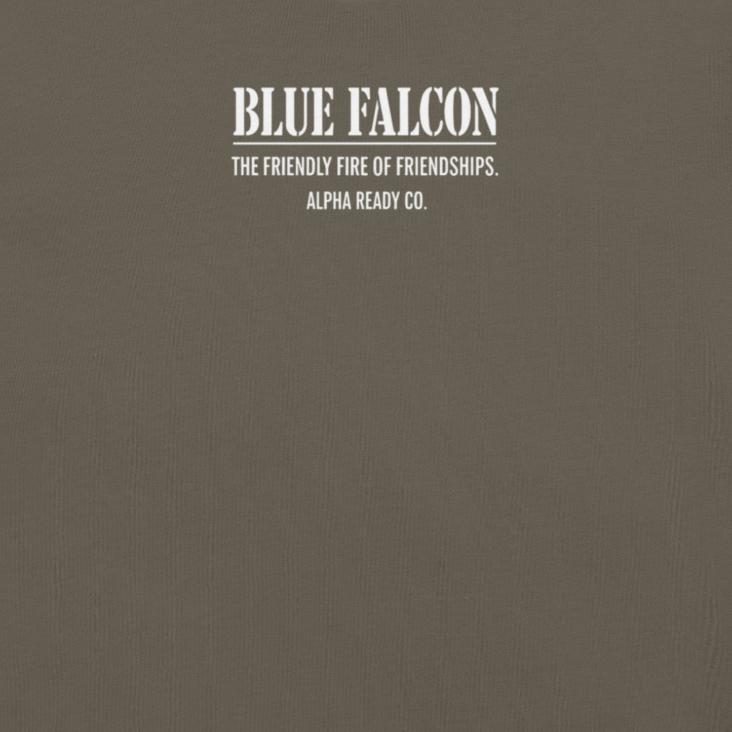 Introducing the Blue Falcon Shirt, a tribute to the hilarious, sometimes frustrating, but always memorable "friendly fire of friendships." With "Blue Falcon" front and center and "The friendly fire of friendships" underneath, this shirt is a knowing wink to those unforgettable moments.