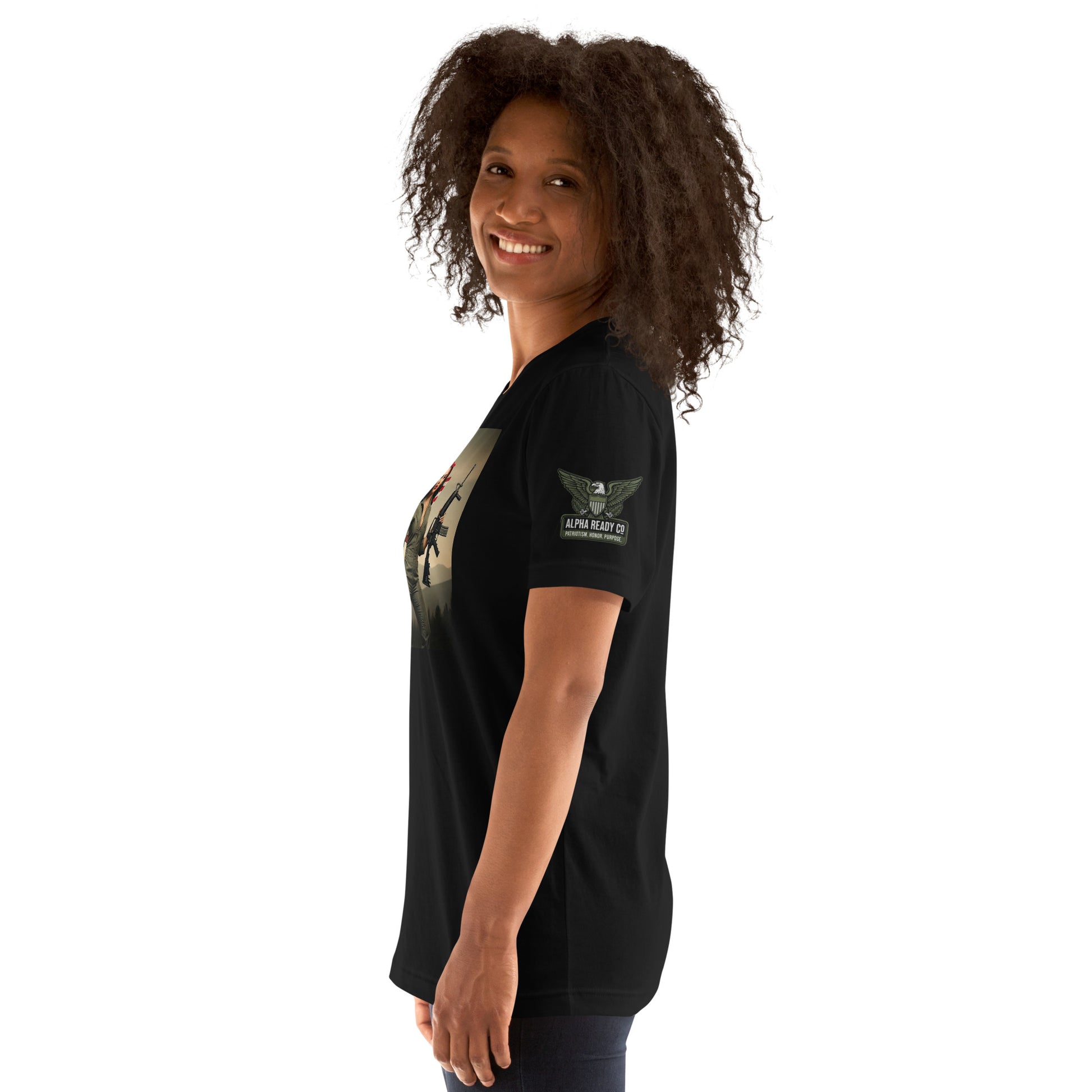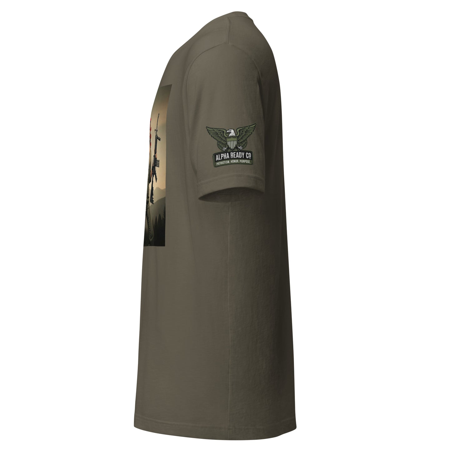 To further amplify its patriotic spirit, the American flag is boldly printed in color on the right sleeve, while our distinctive Alpha Ready Co. logo adorns the left.