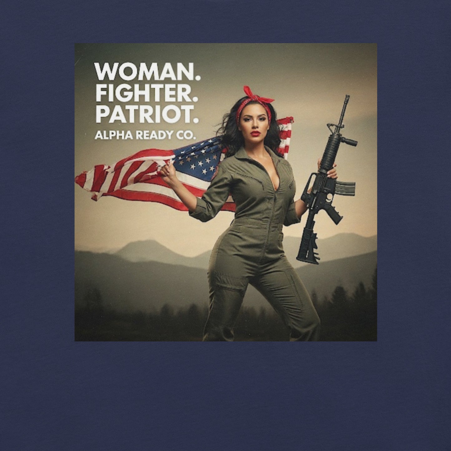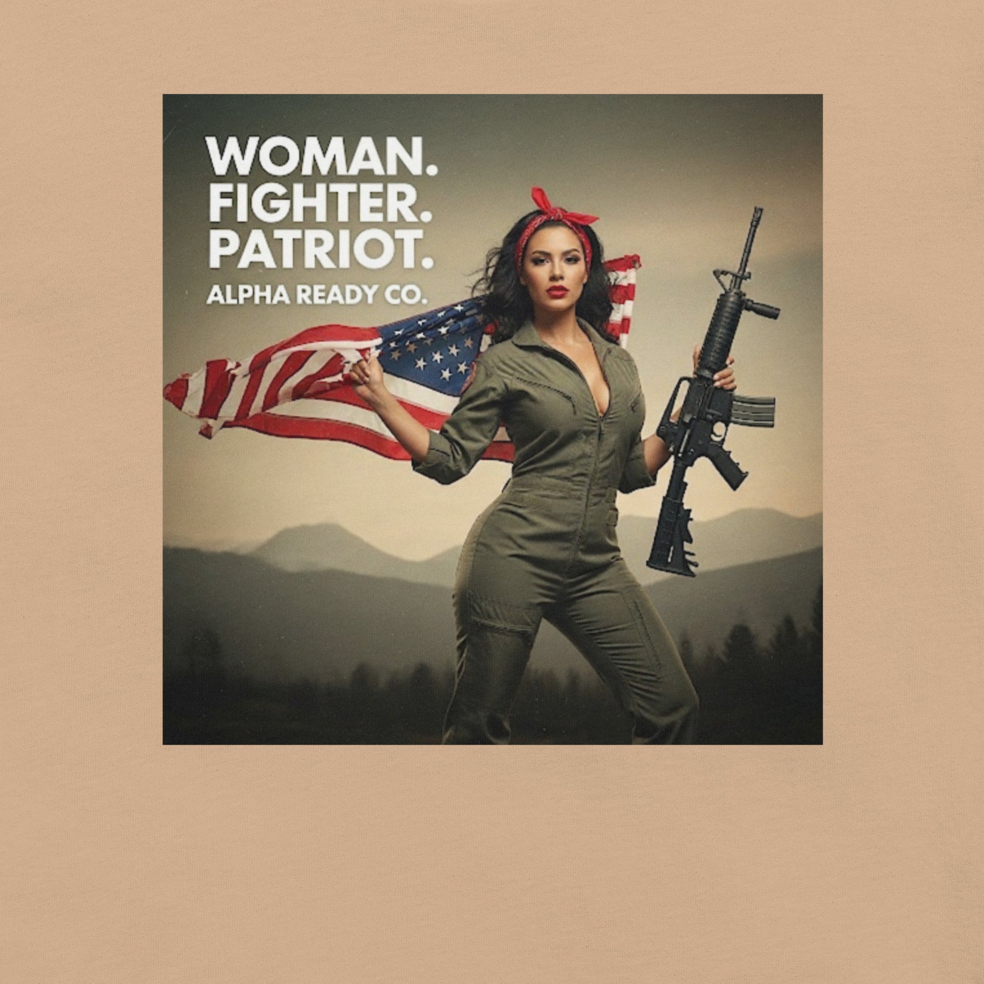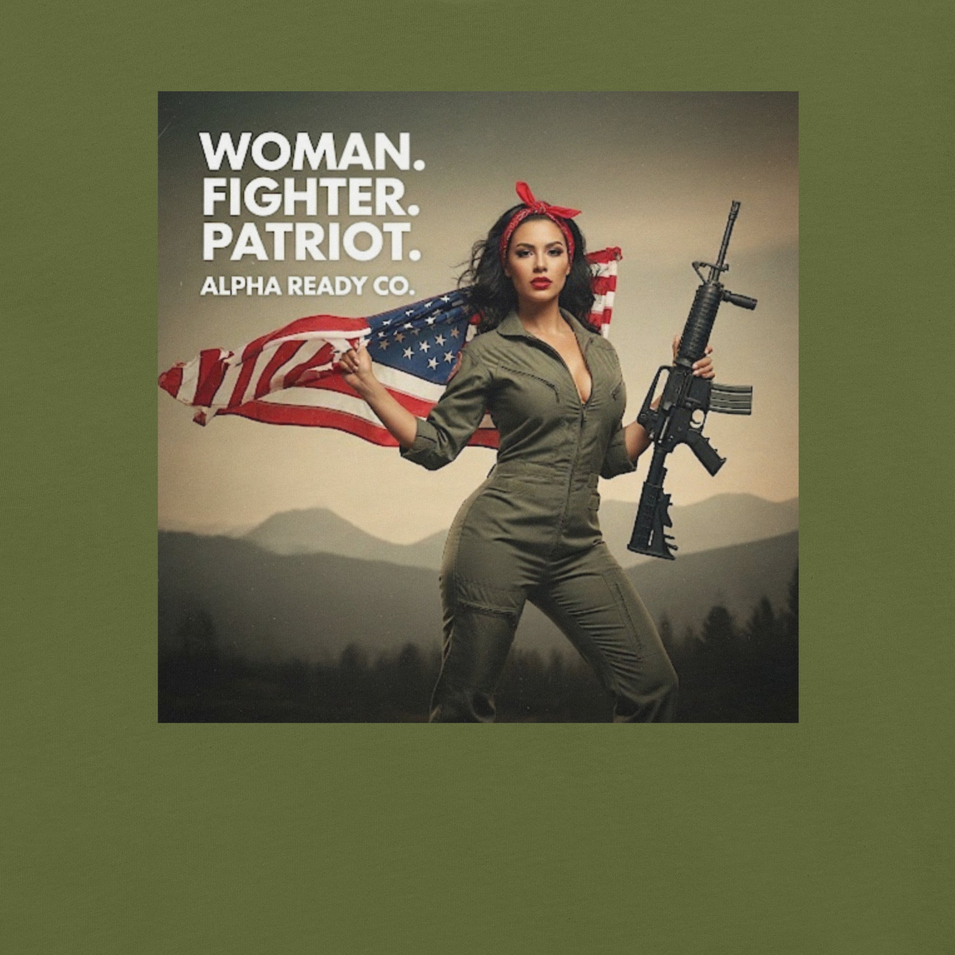 This shirt is a symbol of a warrior who is ready for anything. The words "Woman. Fighter. Patriot." stand beside the design, a testament to the strength and unwavering dedication of those who answer the call of duty.