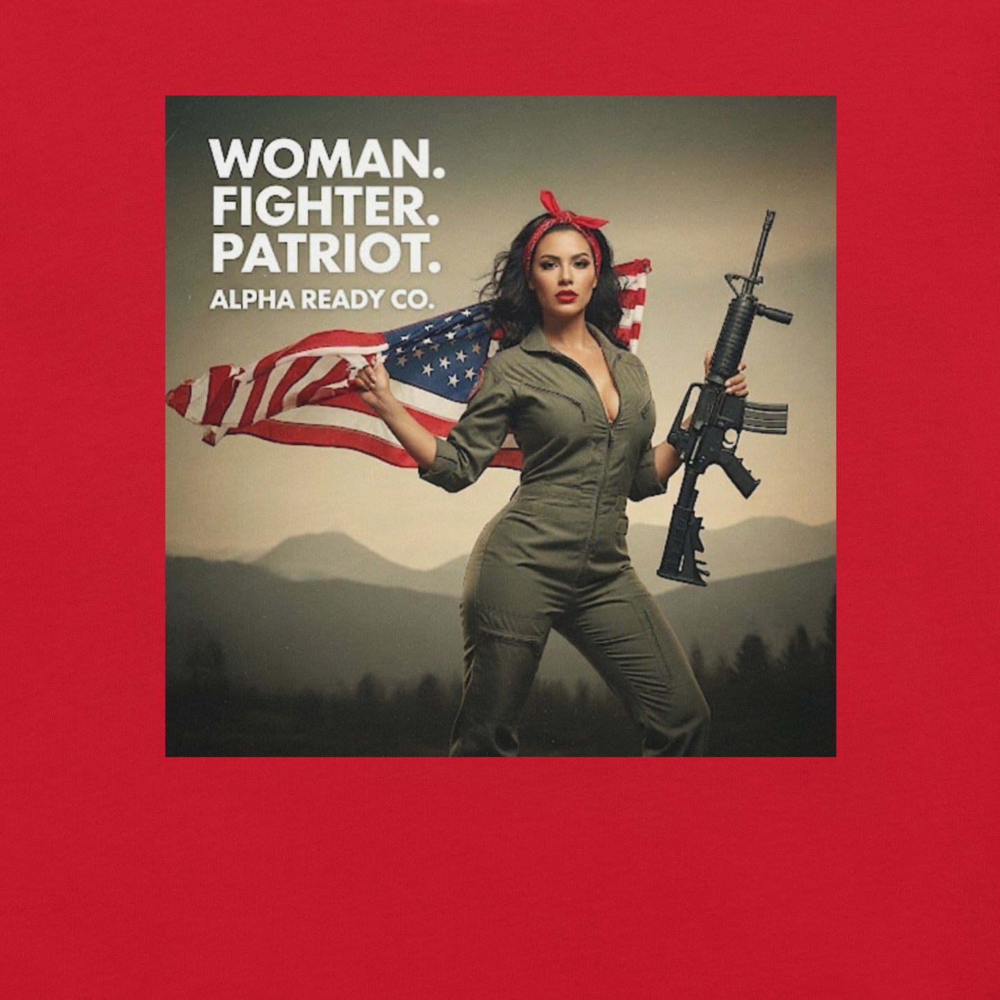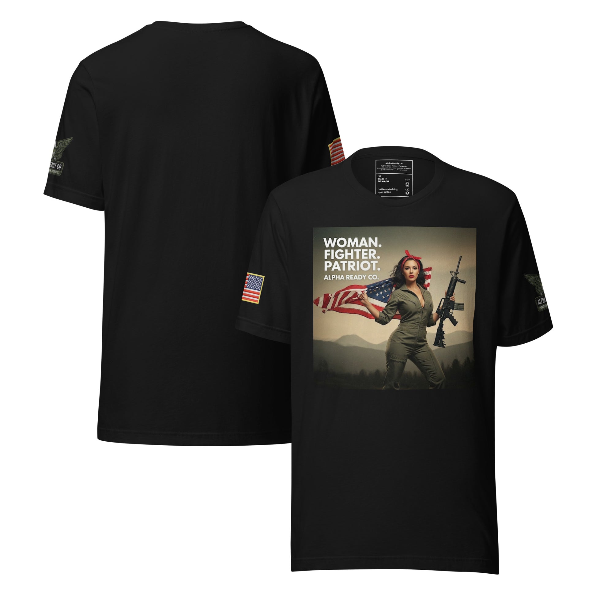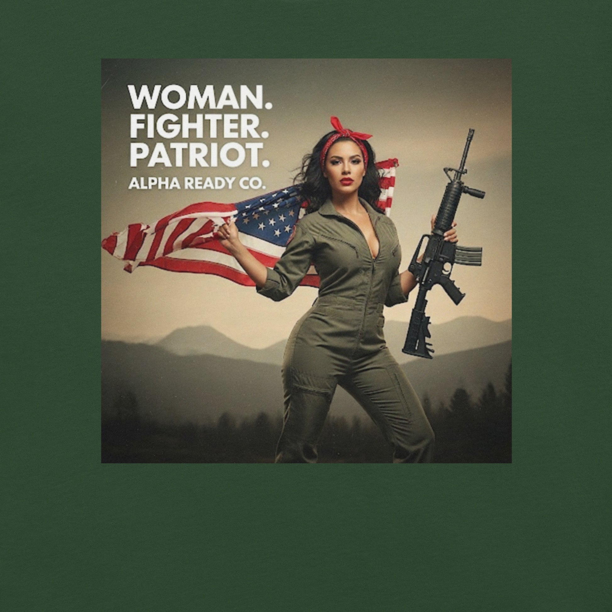 This shirt is a symbol of a warrior who is ready for anything. The words "Woman. Fighter. Patriot." stand beside the design, a testament to the strength and unwavering dedication of those who answer the call of duty.