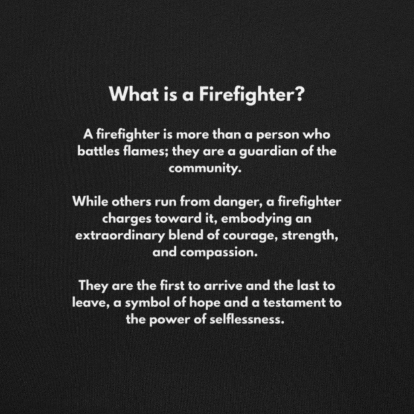 "What is a firefighter? A firefighter is more than a person who battles flames; they are a guardian of the community. While others run from danger, a firefighter charges towards it, embodying an extraordinary blend of courage, strength, and compassion. They are the first to arrive and the last to leave, a symbol of hope and a testament to the power of selflessness."