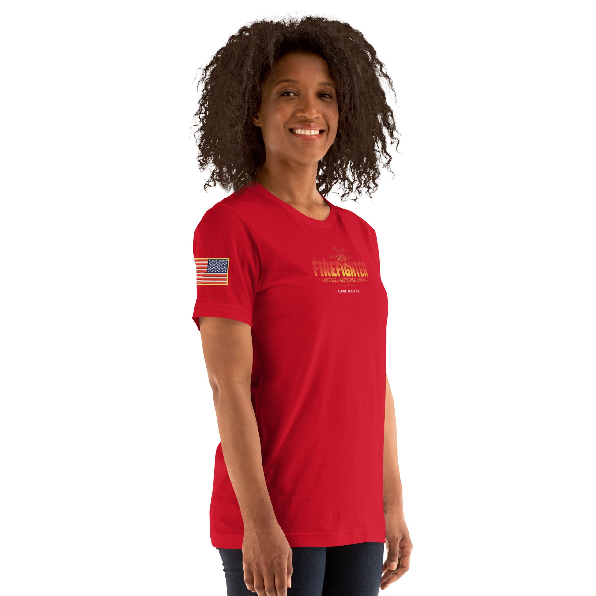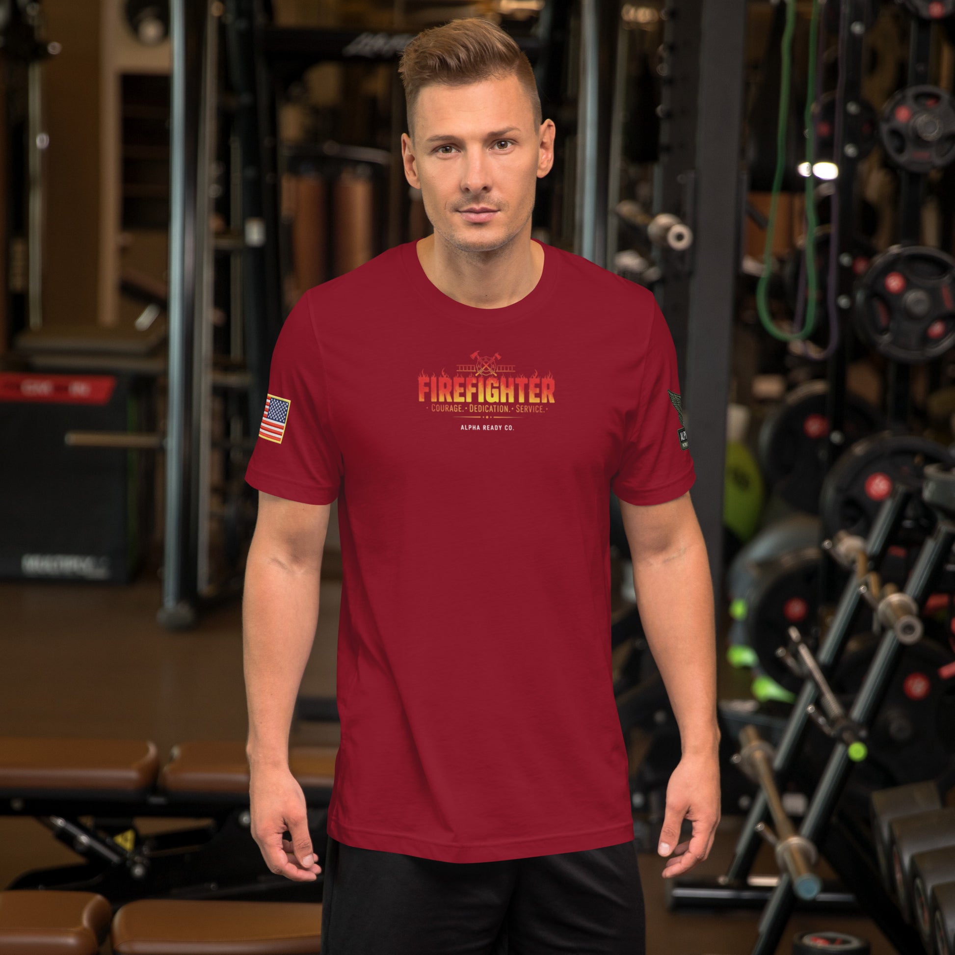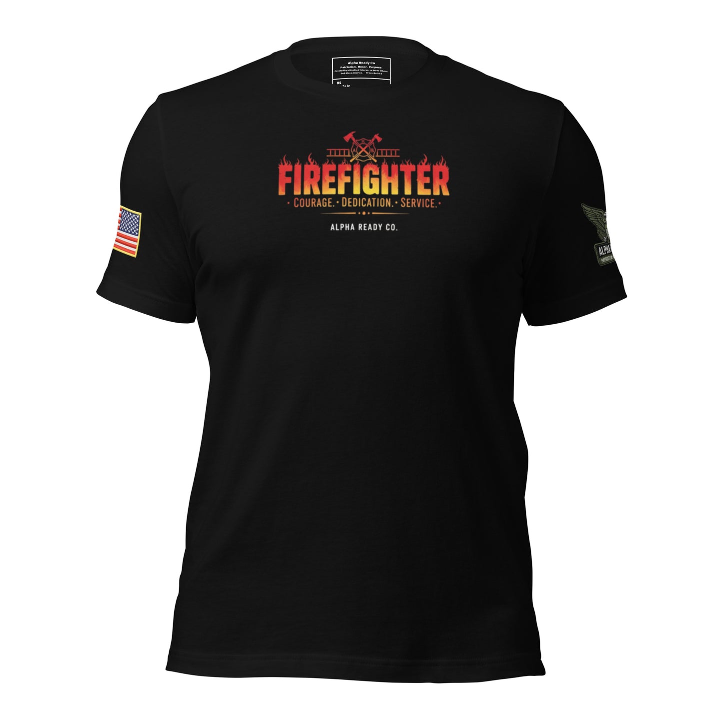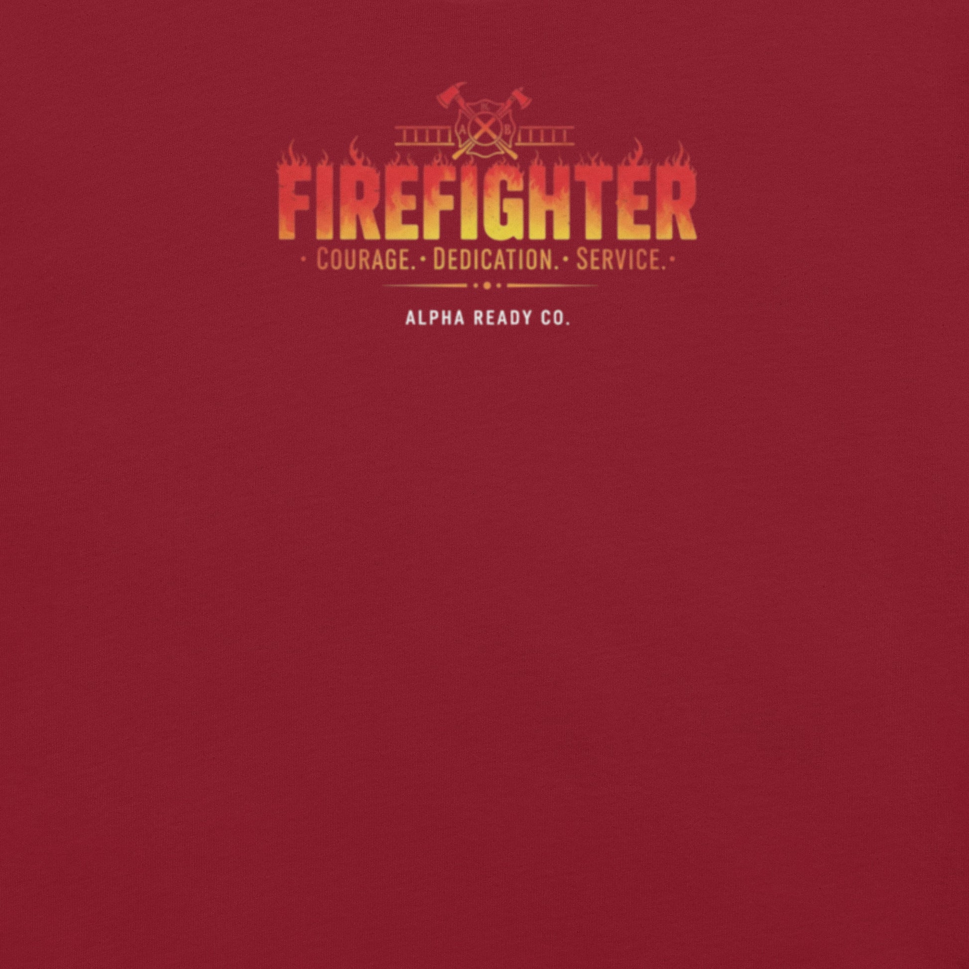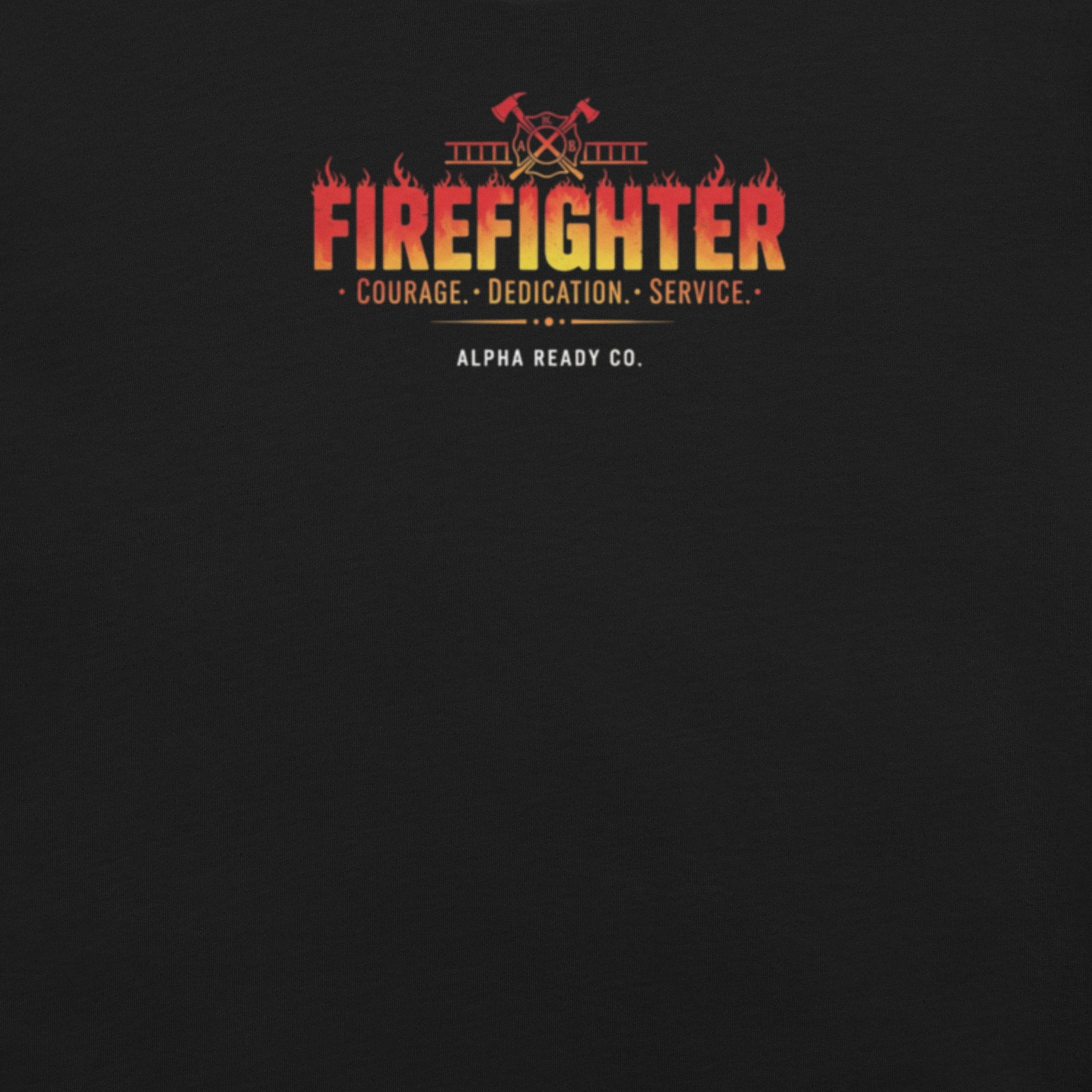 On the front, the word FIREFIGHTER is boldly rendered in a stylized flame design, topped with an iconic logo of crossed axes and a ladder. Below, three powerful words—COURAGE. DEDICATION. SERVICE.—capture the unwavering spirit of these heroes. The front is completed with our company name, ALPHA READY CO.