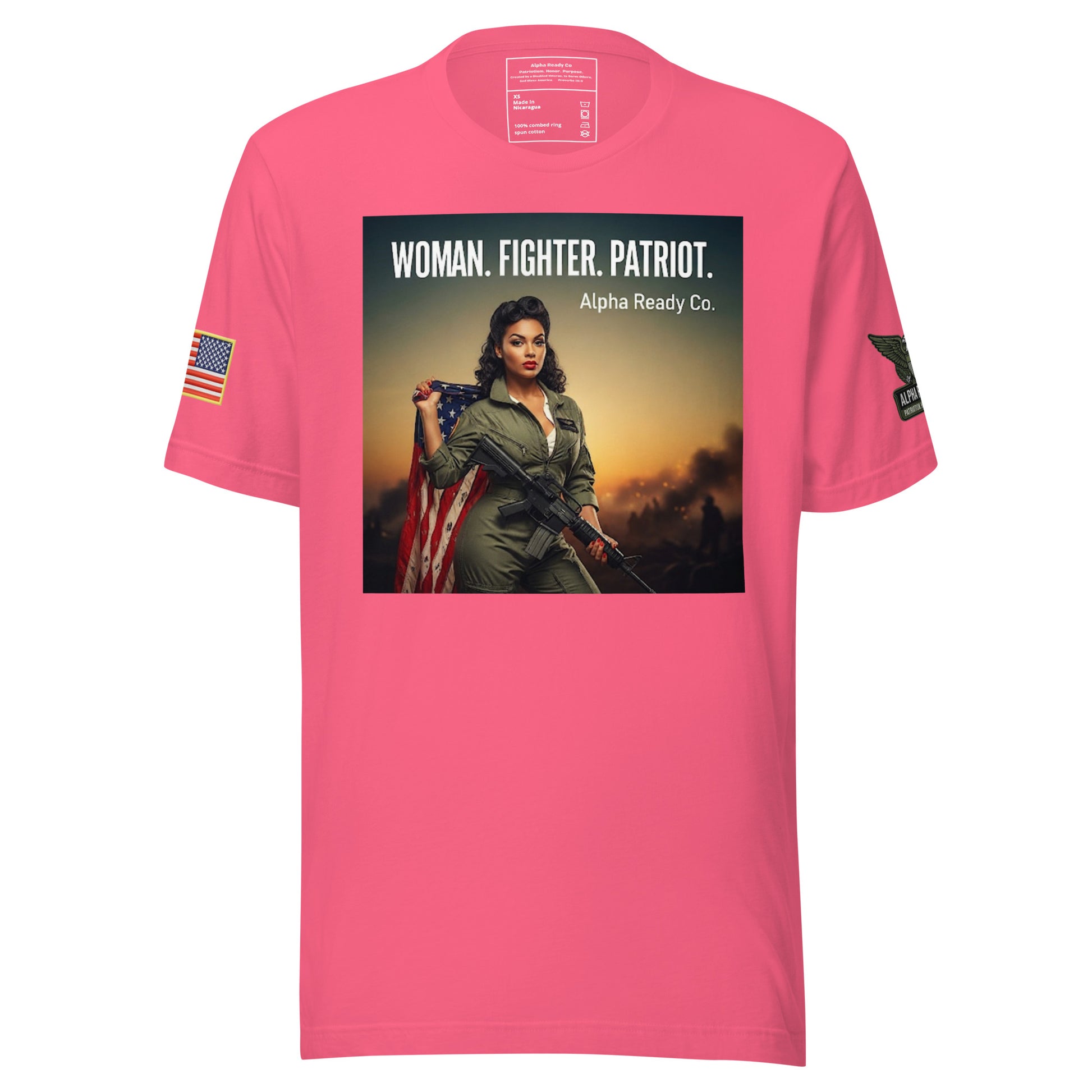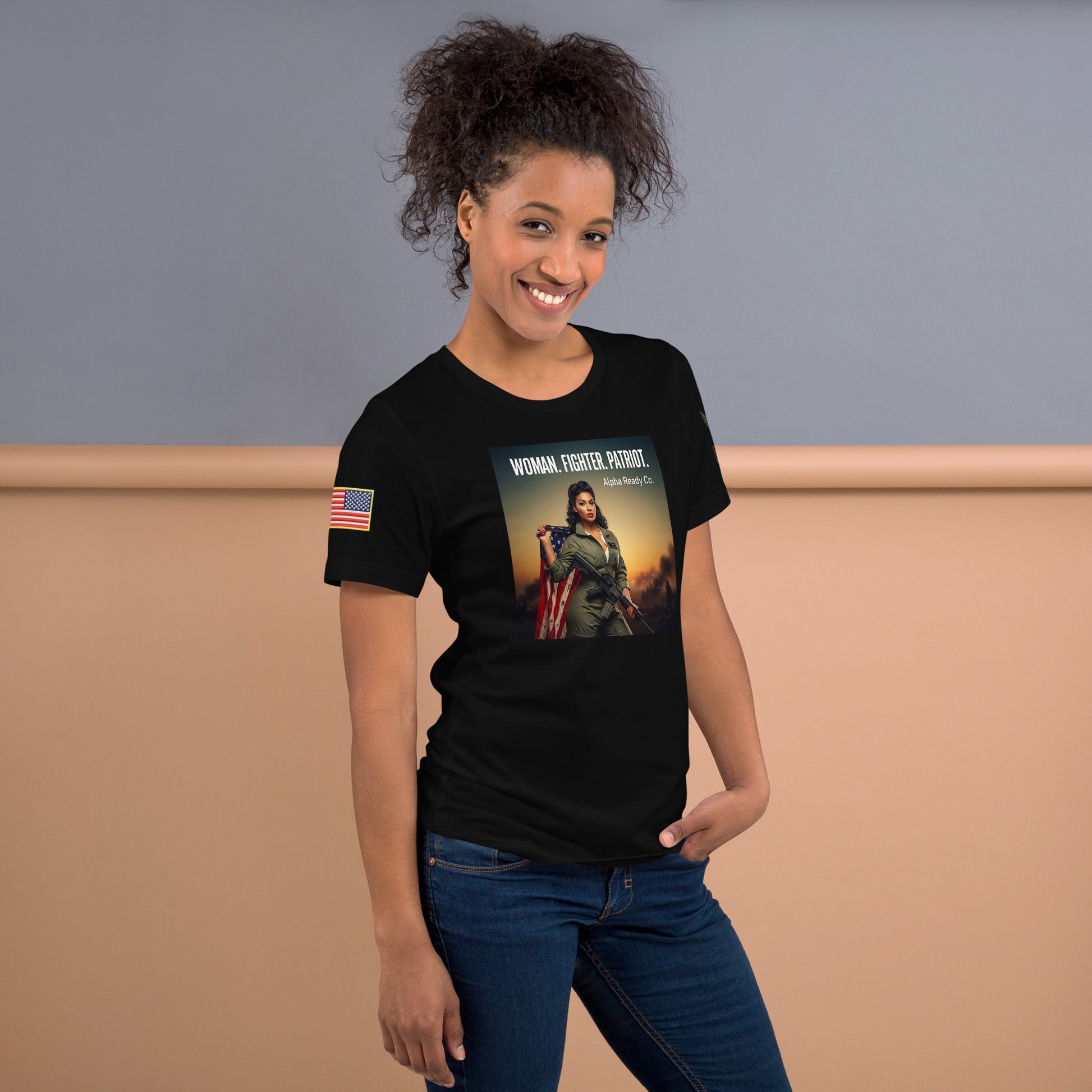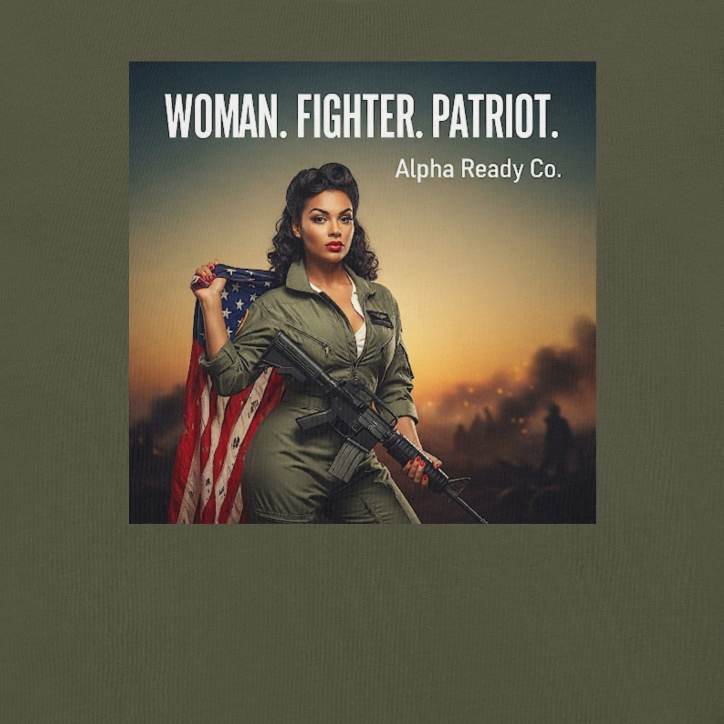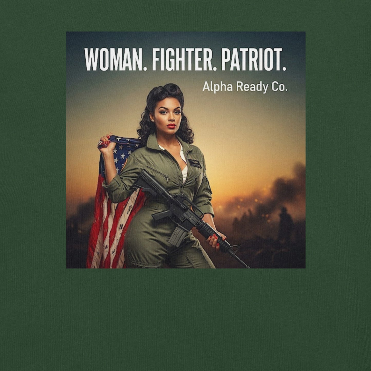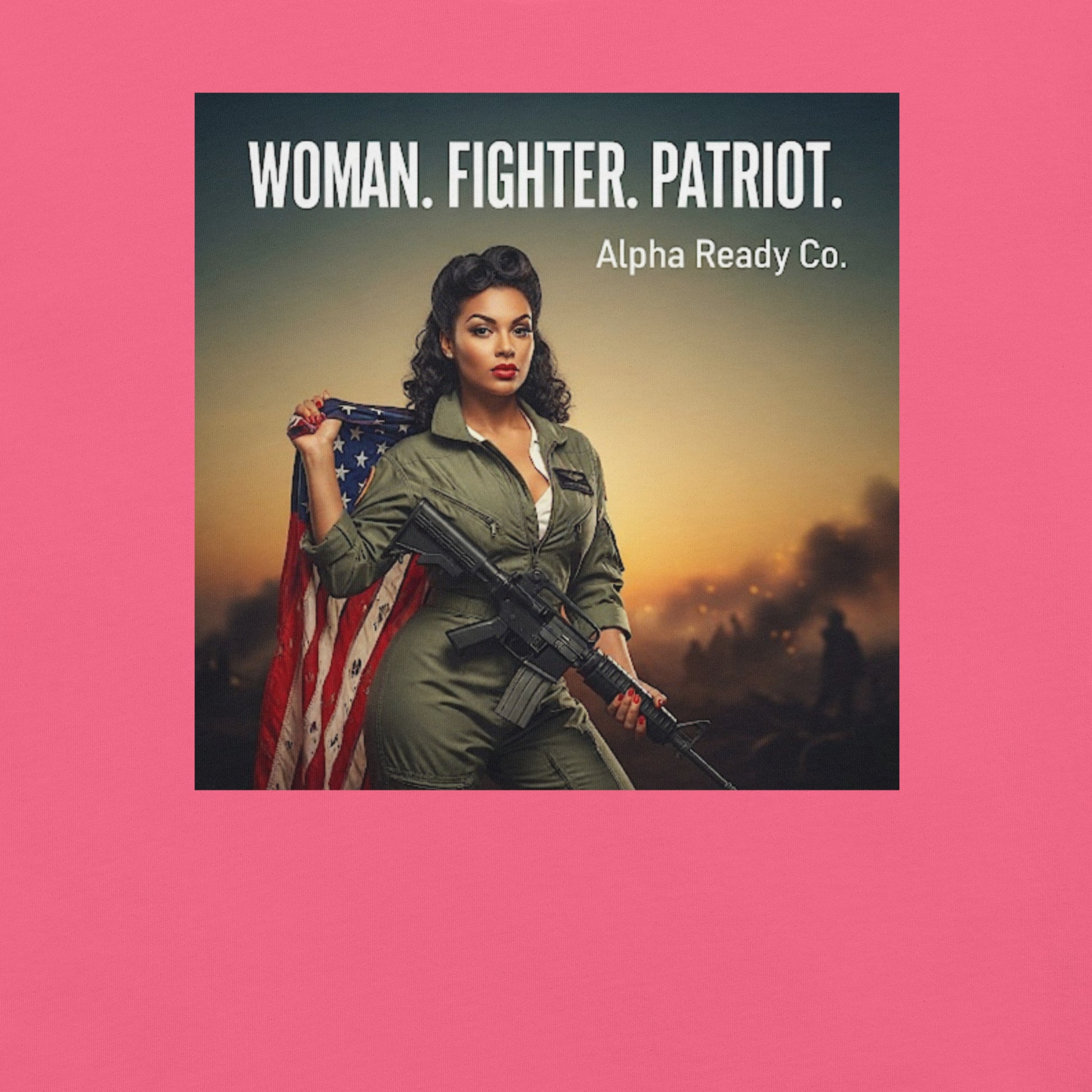 Embody the spirit of a true patriot with this striking graphic tee. The design captures a powerful African American woman, draped in the American flag holding an M-16 Rifle, standing with purpose and resolve. She is a symbol of strength and defiance, with the phrase "WOMAN. FIGHTER. PATRIOT." boldly declared across the top. This shirt is for those who live with courage and stand proudly for their beliefs.