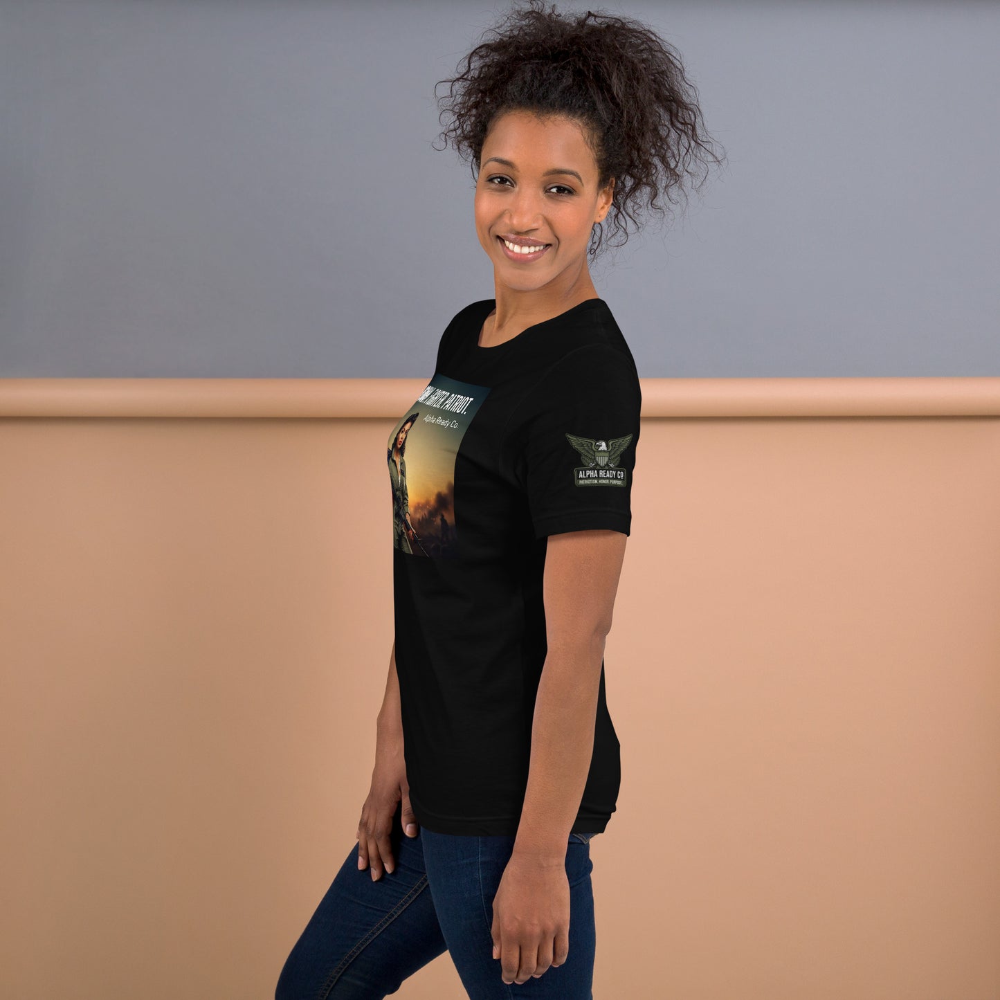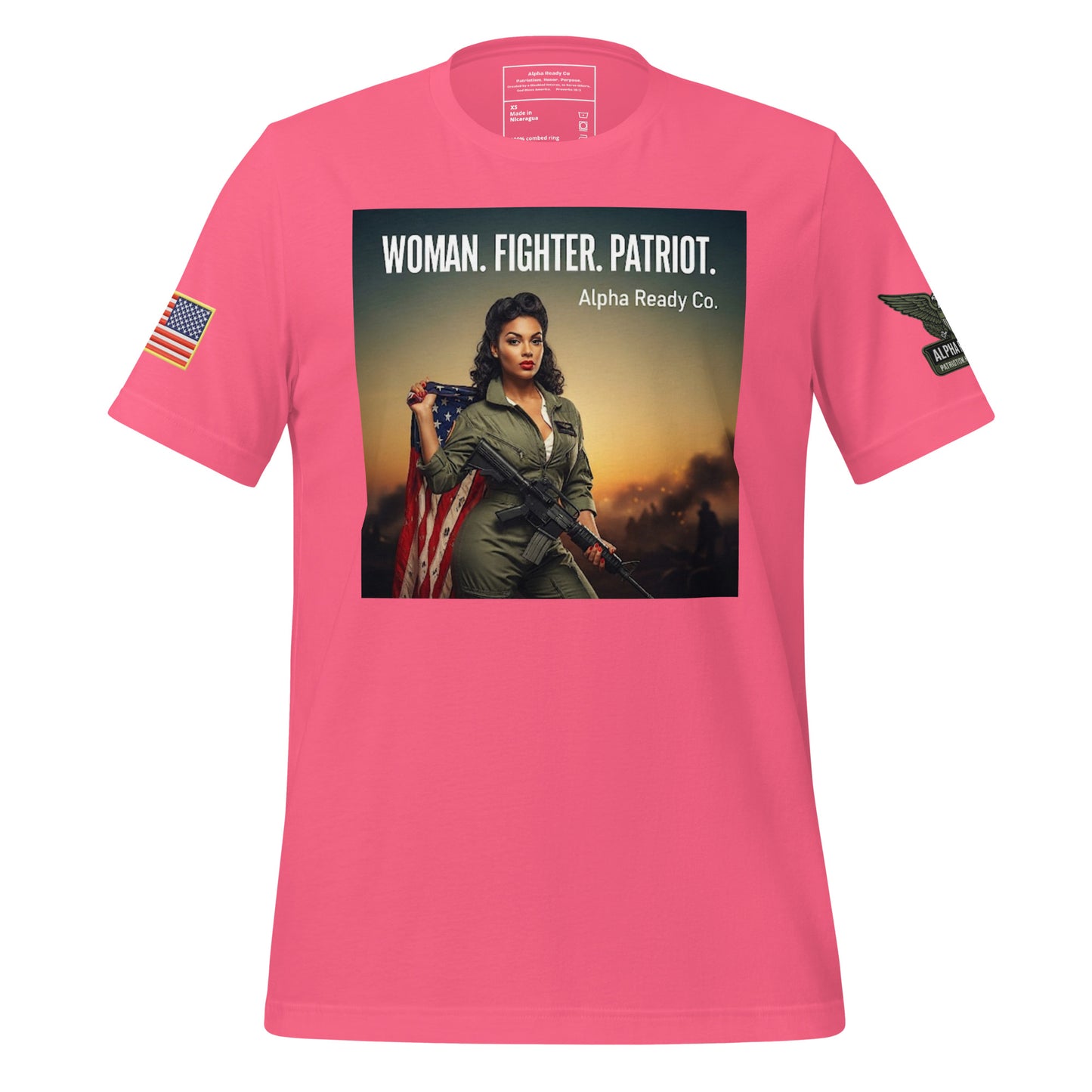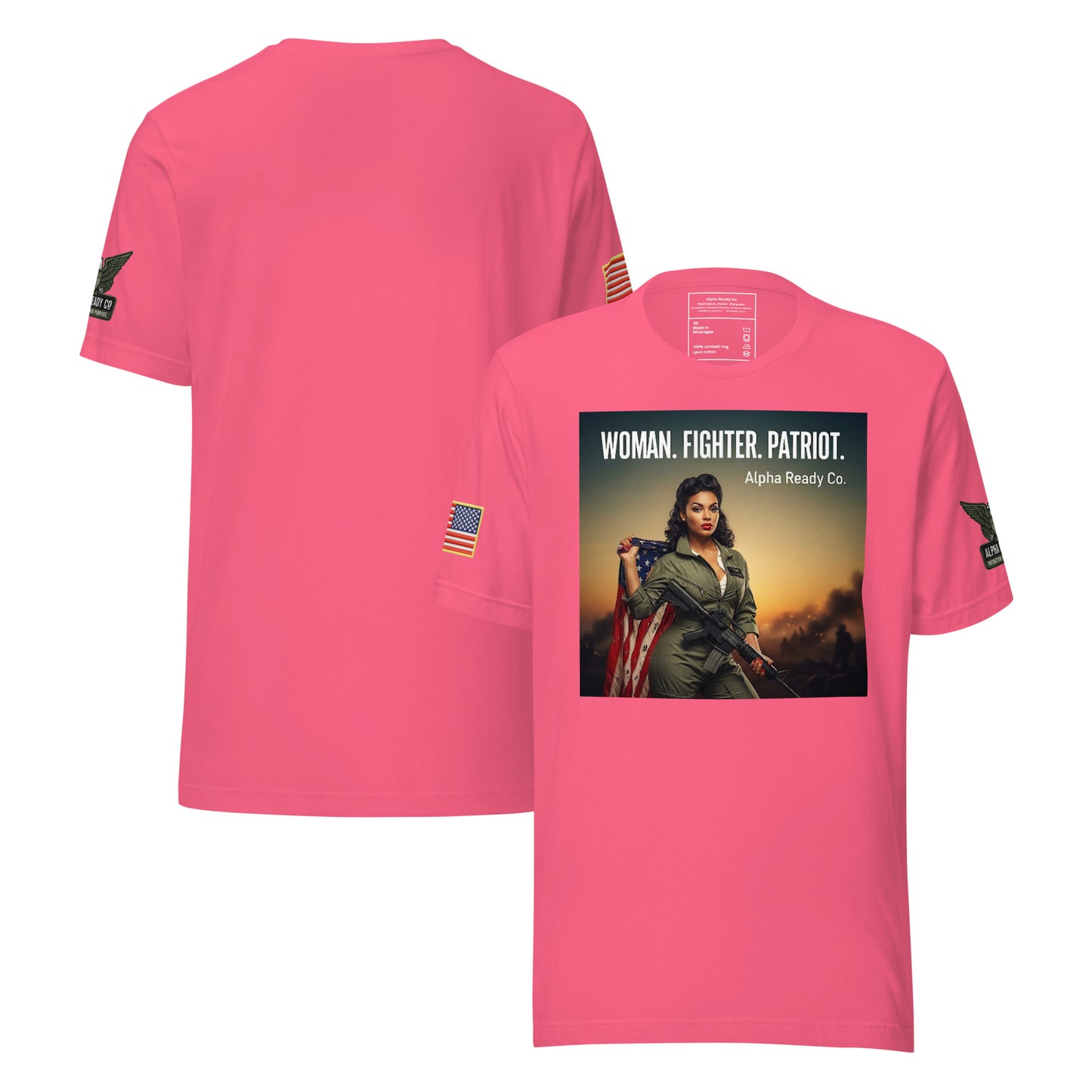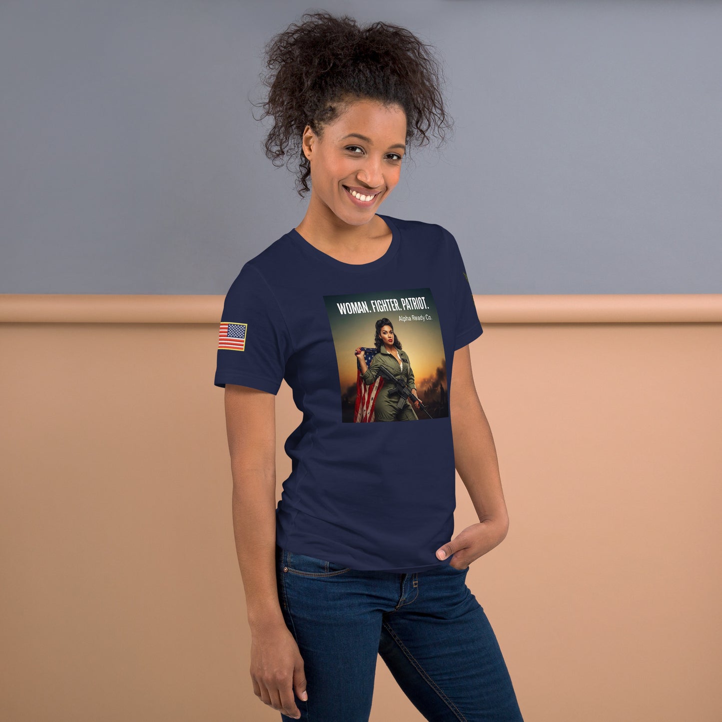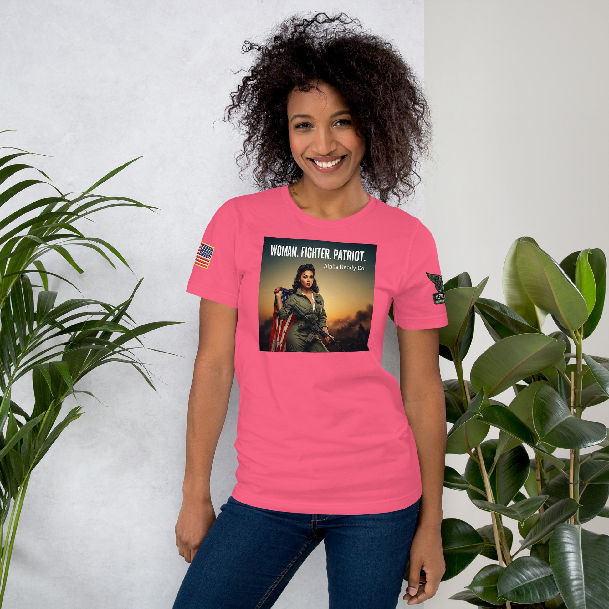 Embody the spirit of a true patriot with this striking graphic tee. The design captures a powerful African American woman, draped in the American flag holding an M-16 Rifle, standing with purpose and resolve. She is a symbol of strength and defiance, with the phrase "WOMAN. FIGHTER. PATRIOT." boldly declared across the top. This shirt is for those who live with courage and stand proudly for their beliefs.