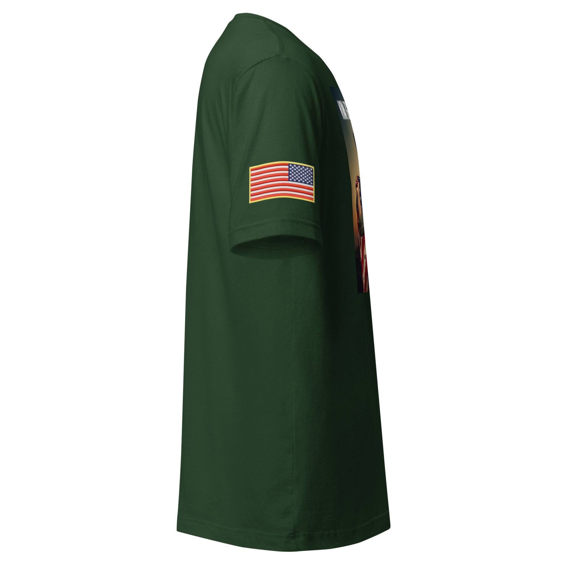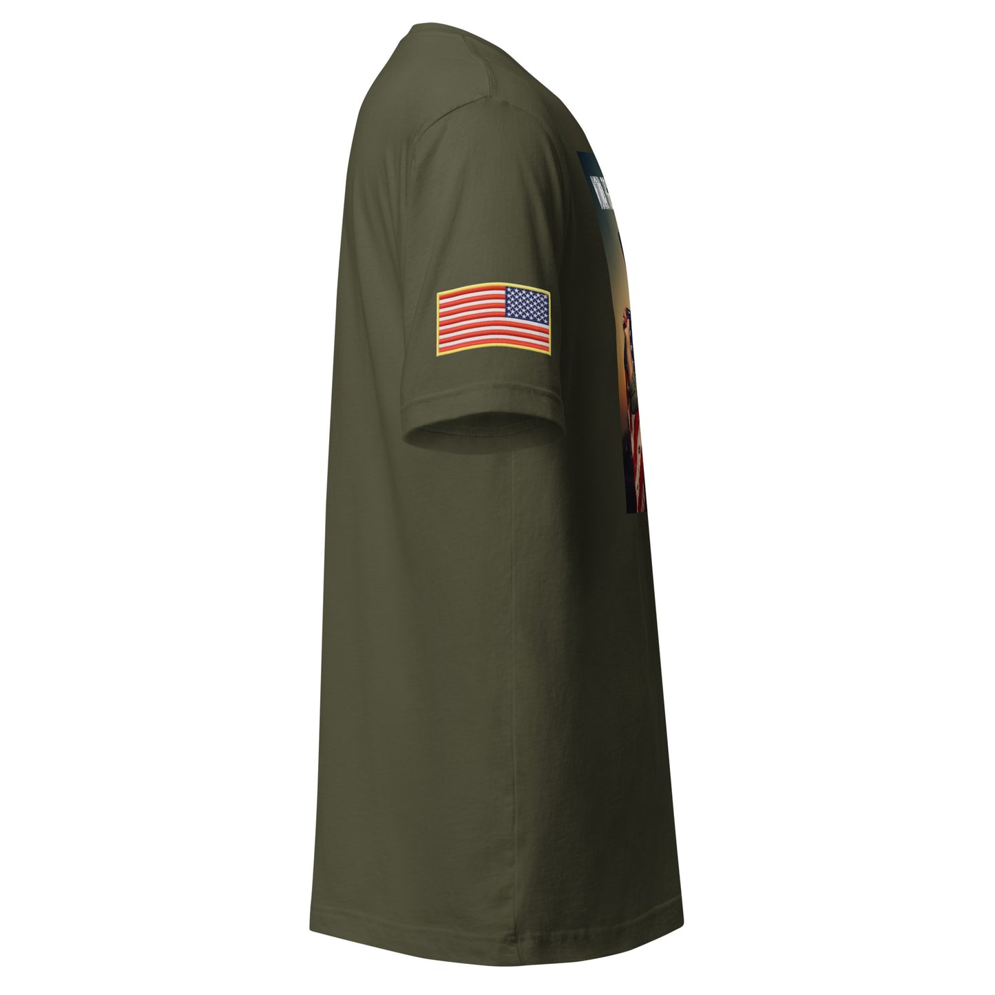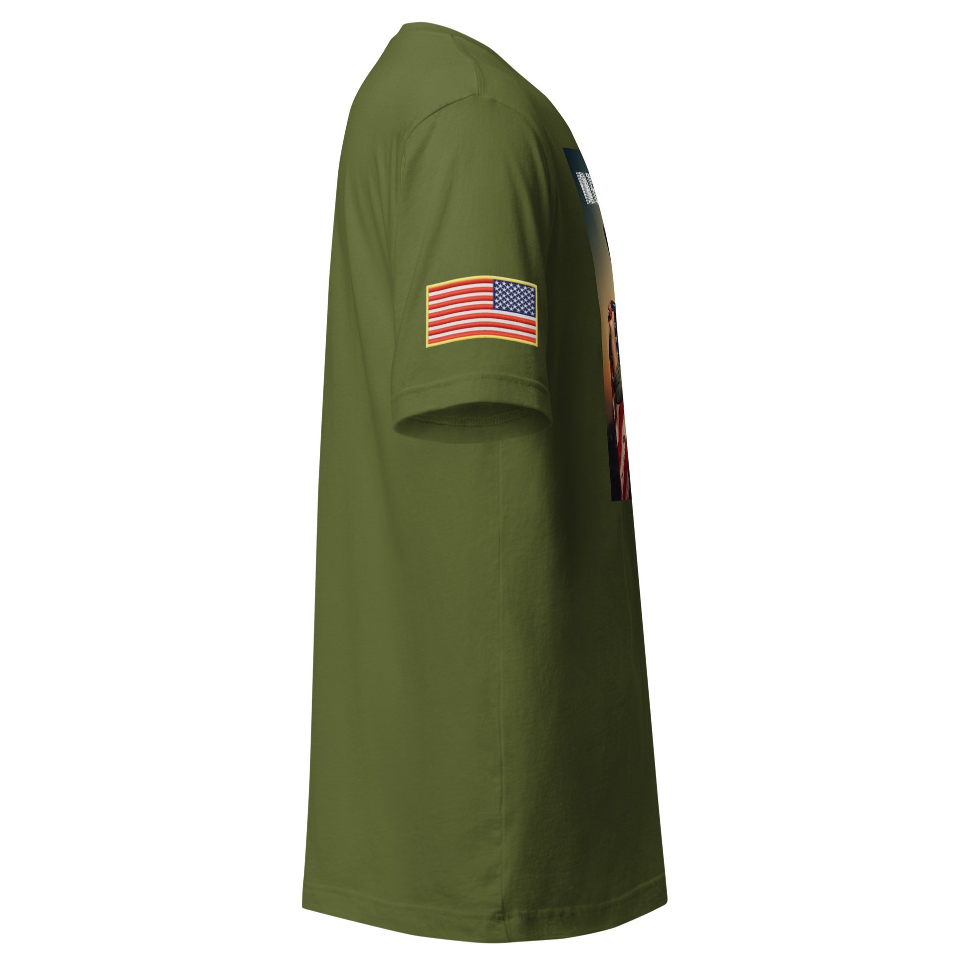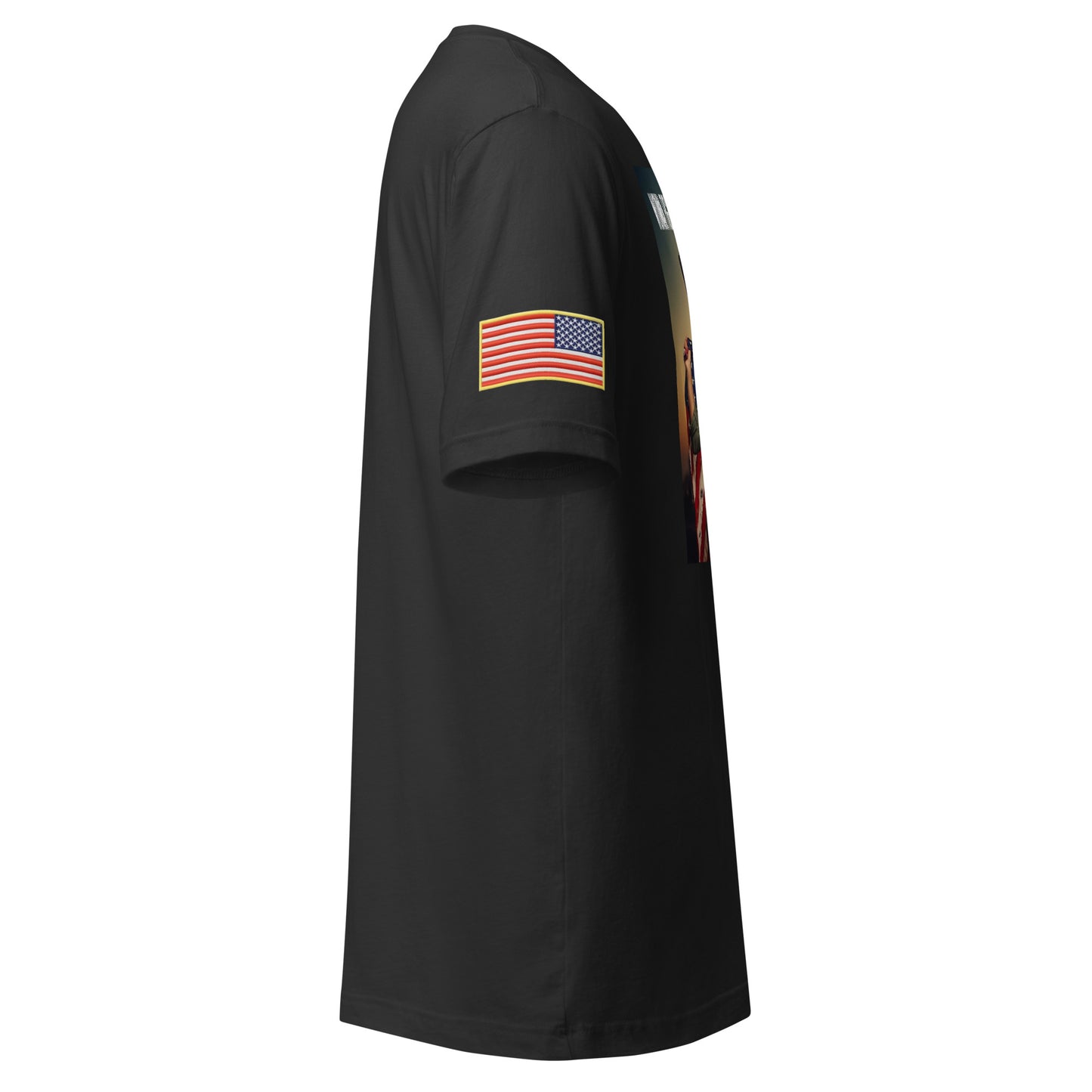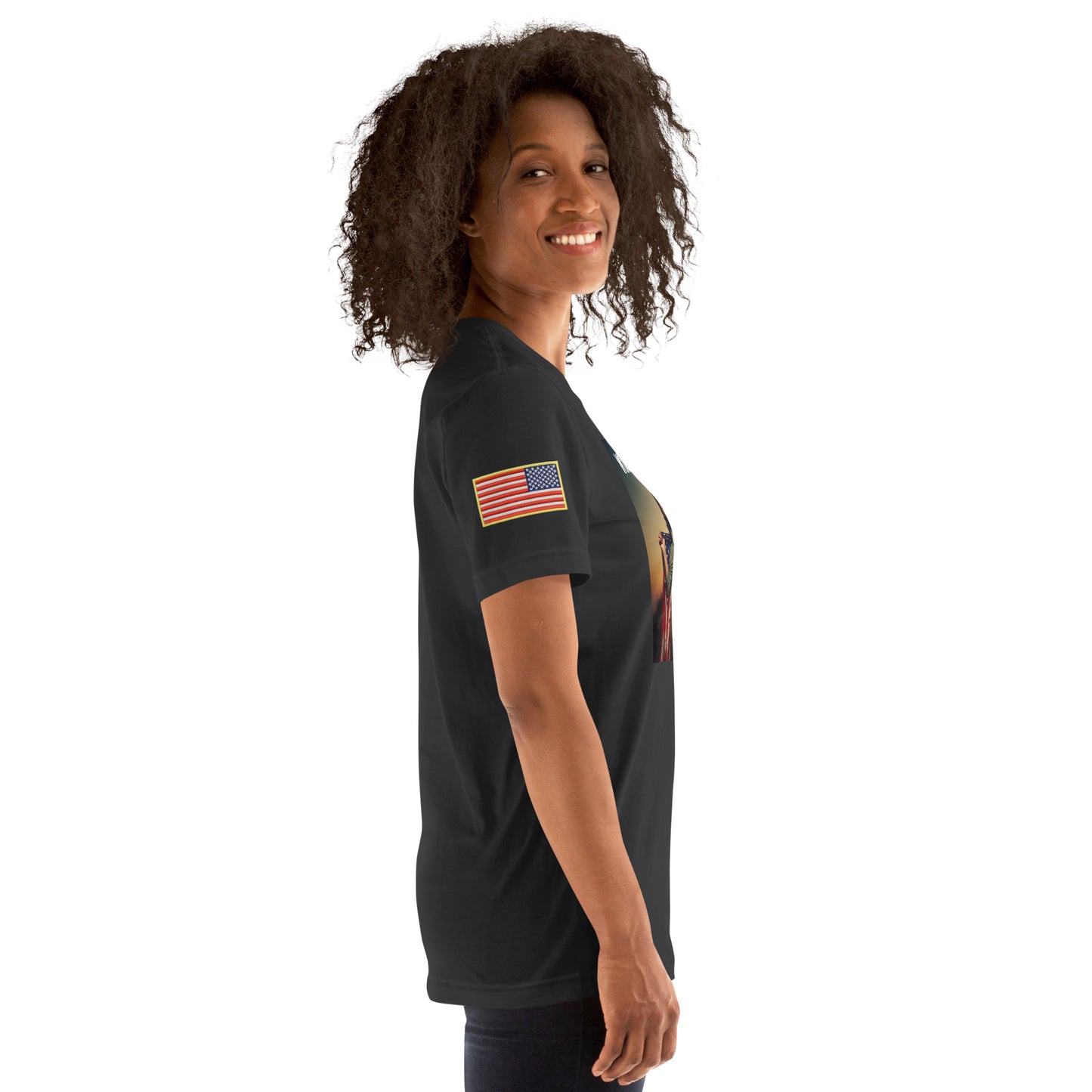 Embody the spirit of a true patriot with this striking graphic tee. The design captures a powerful African American woman, draped in the American flag holding an M-16 Rifle, standing with purpose and resolve. She is a symbol of strength and defiance, with the phrase "WOMAN. FIGHTER. PATRIOT." boldly declared across the top. This shirt is for those who live with courage and stand proudly for their beliefs.