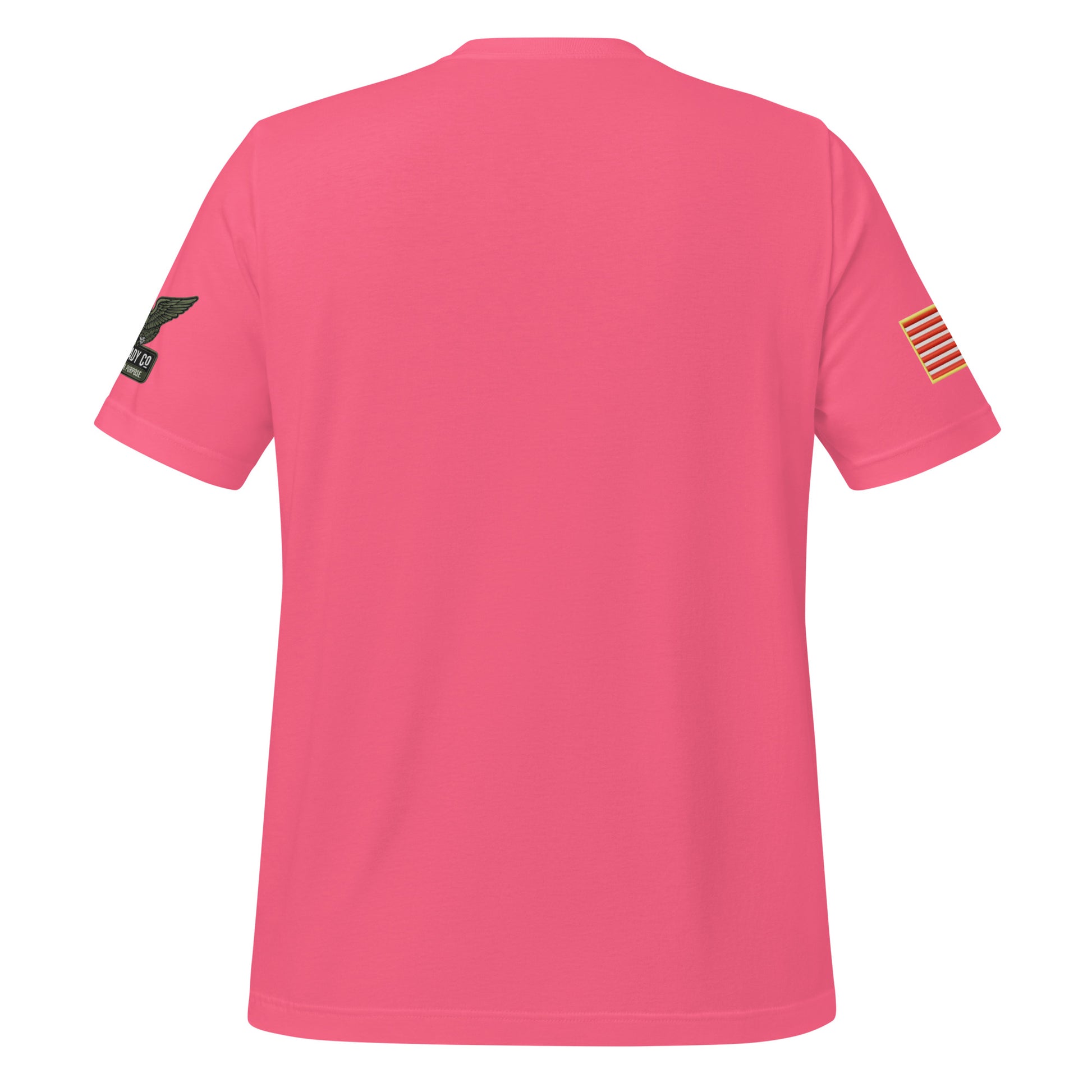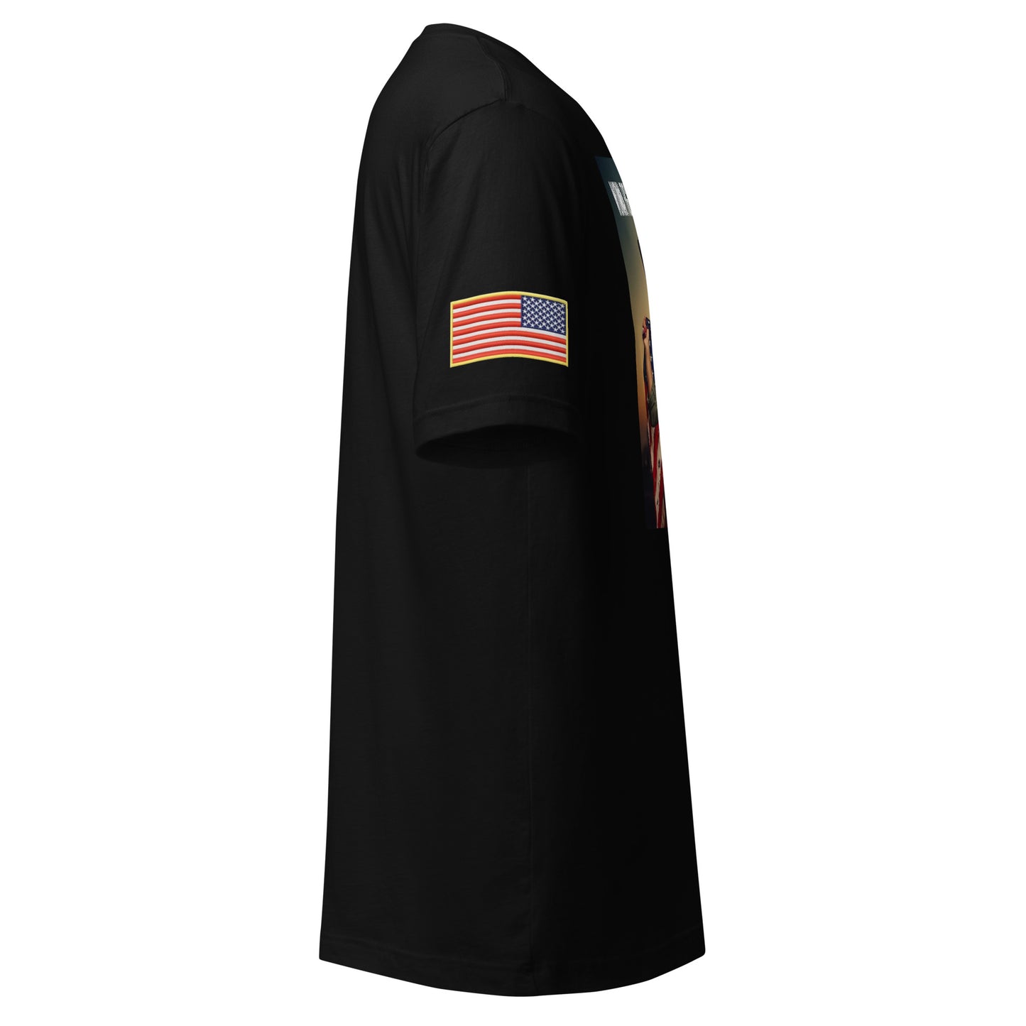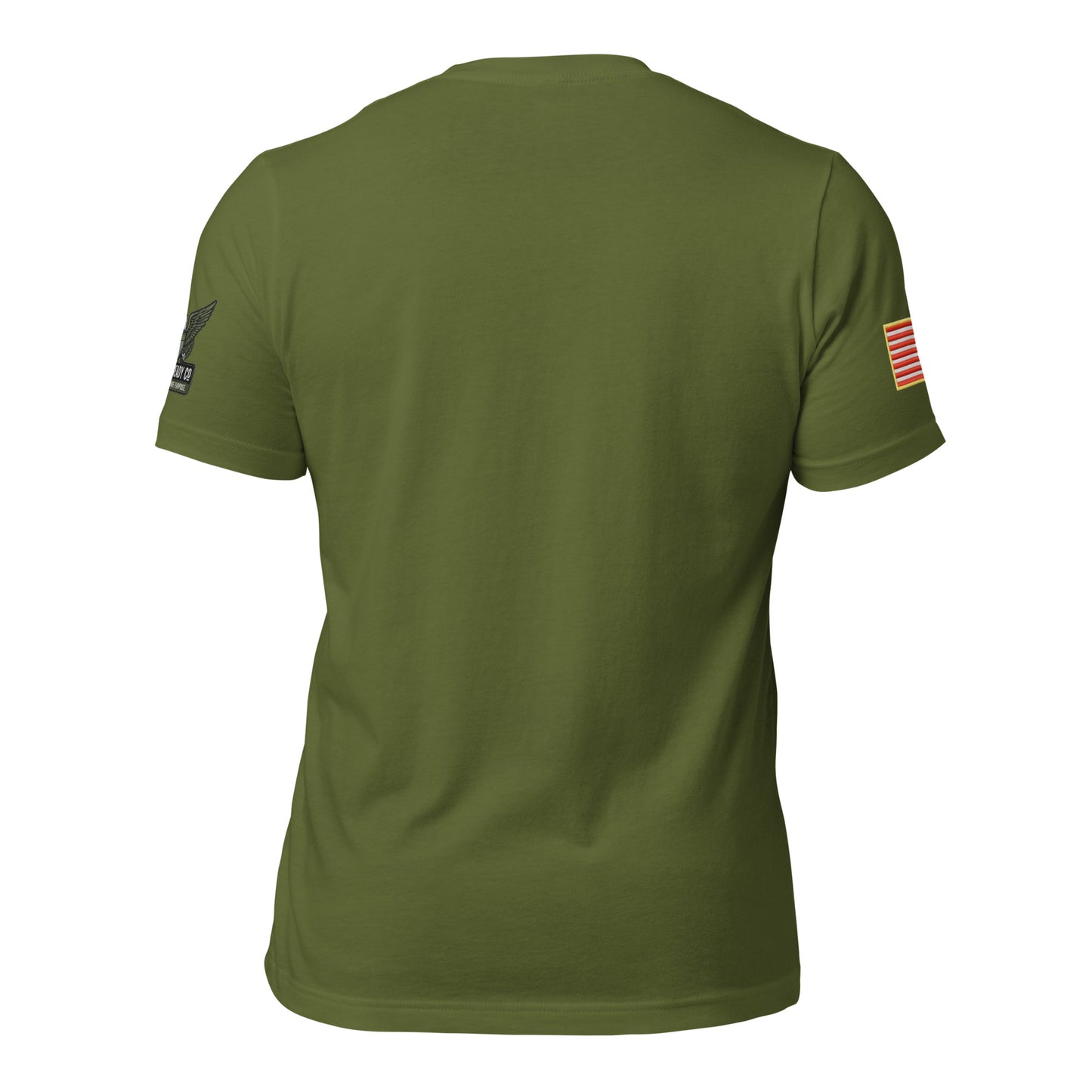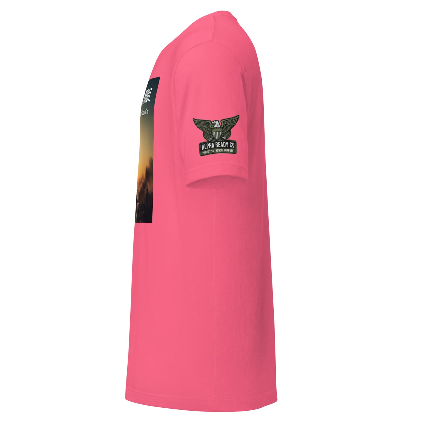 To further amplify its patriotic spirit, the American flag is boldly printed in color on the right sleeve, while our distinctive Alpha Ready Co. logo adorns the left.