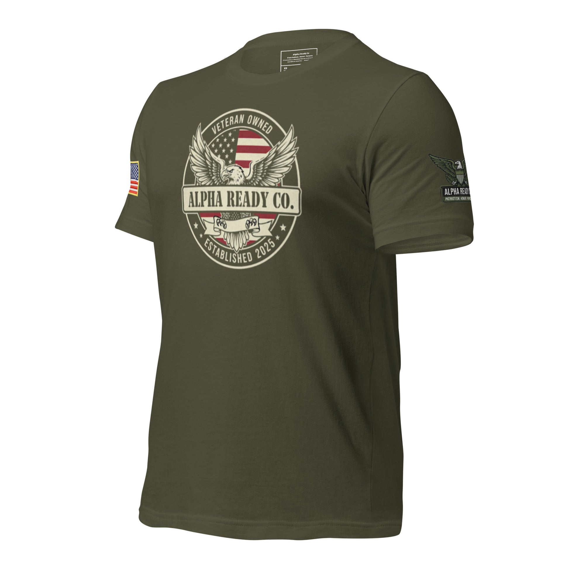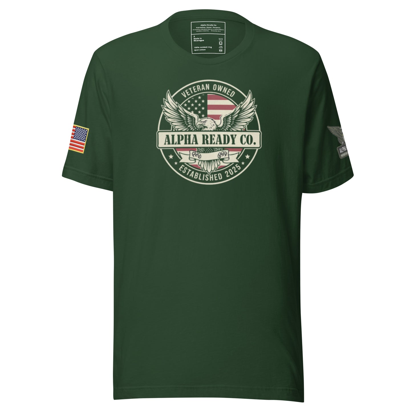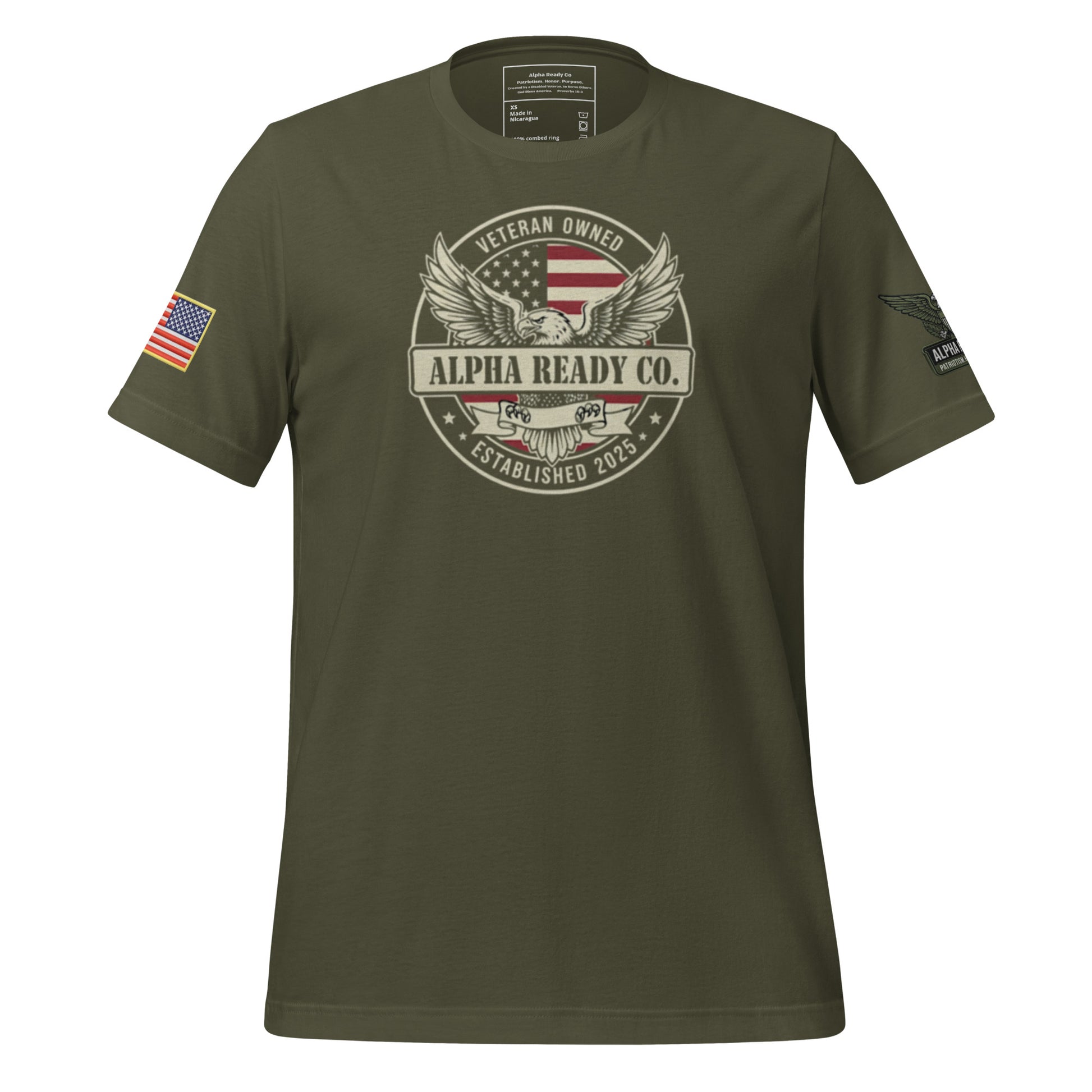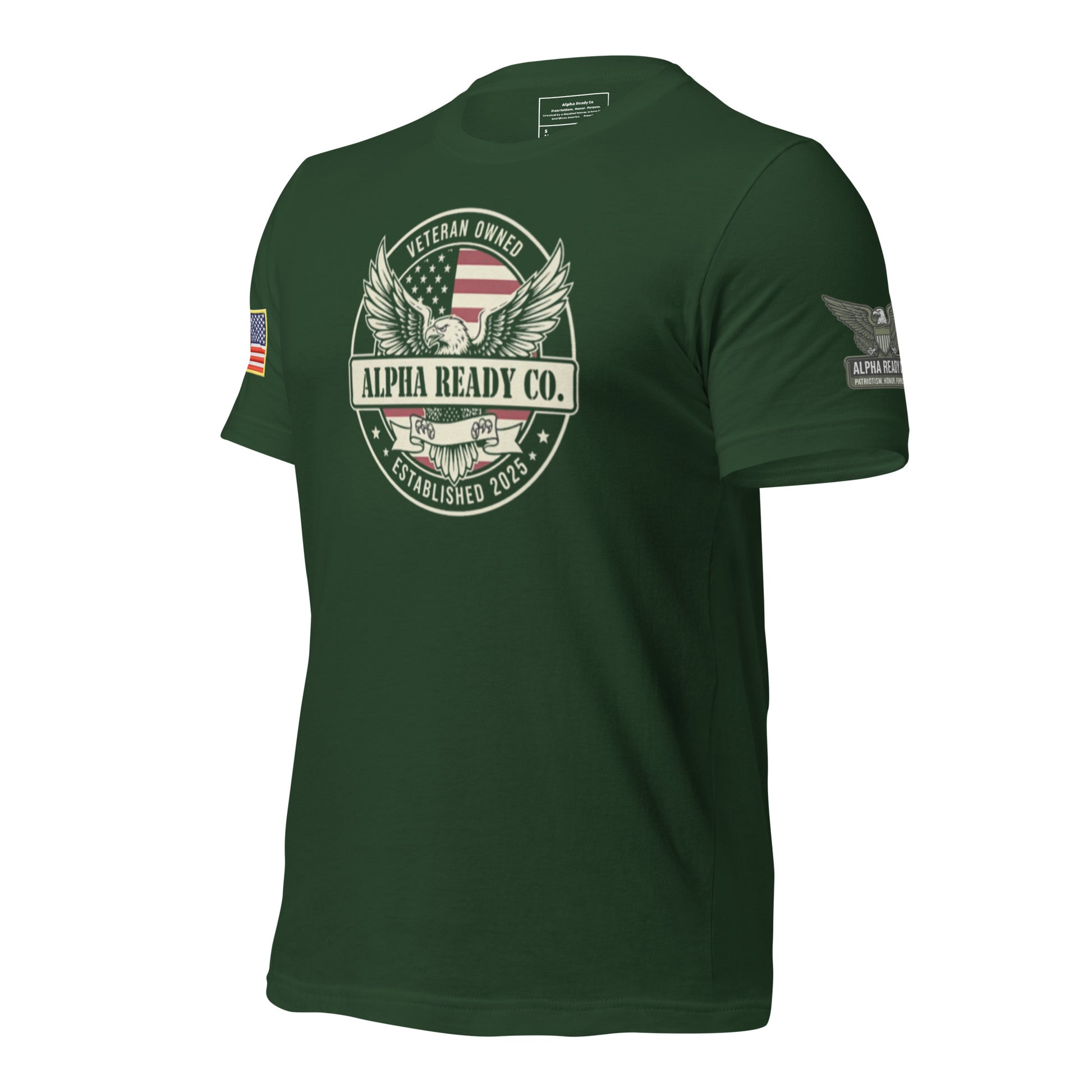 The front of the shirt features a circular logo that acts as a brand seal. A powerful eagle with wings spread wide is set against a backdrop of the American flag, symbolizing our nation's enduring strength and spirit. At the top of the circle, the words “Veteran Owned” stand as a mark of honor, while the bottom is marked with “Established 2025,” our founding year.