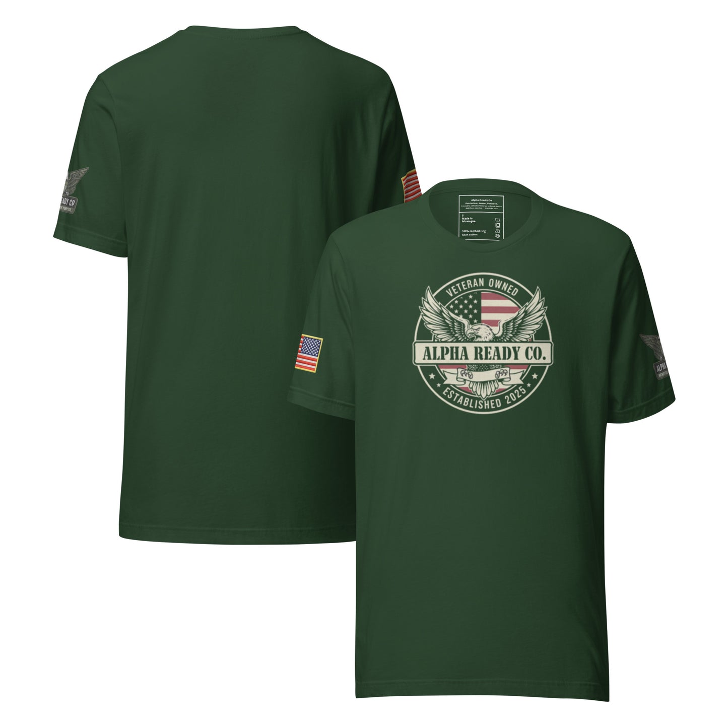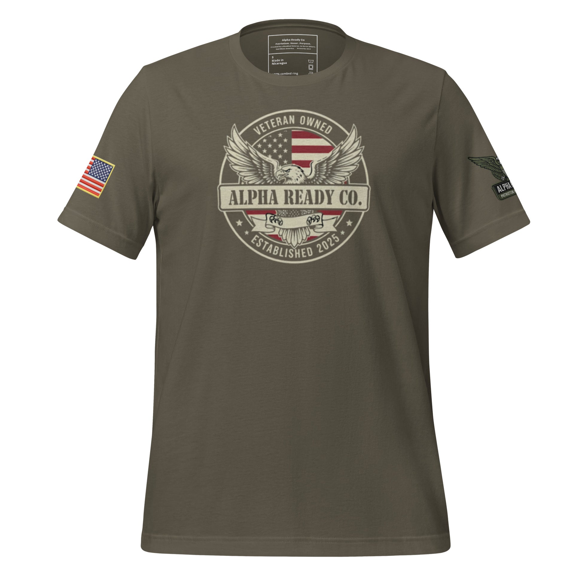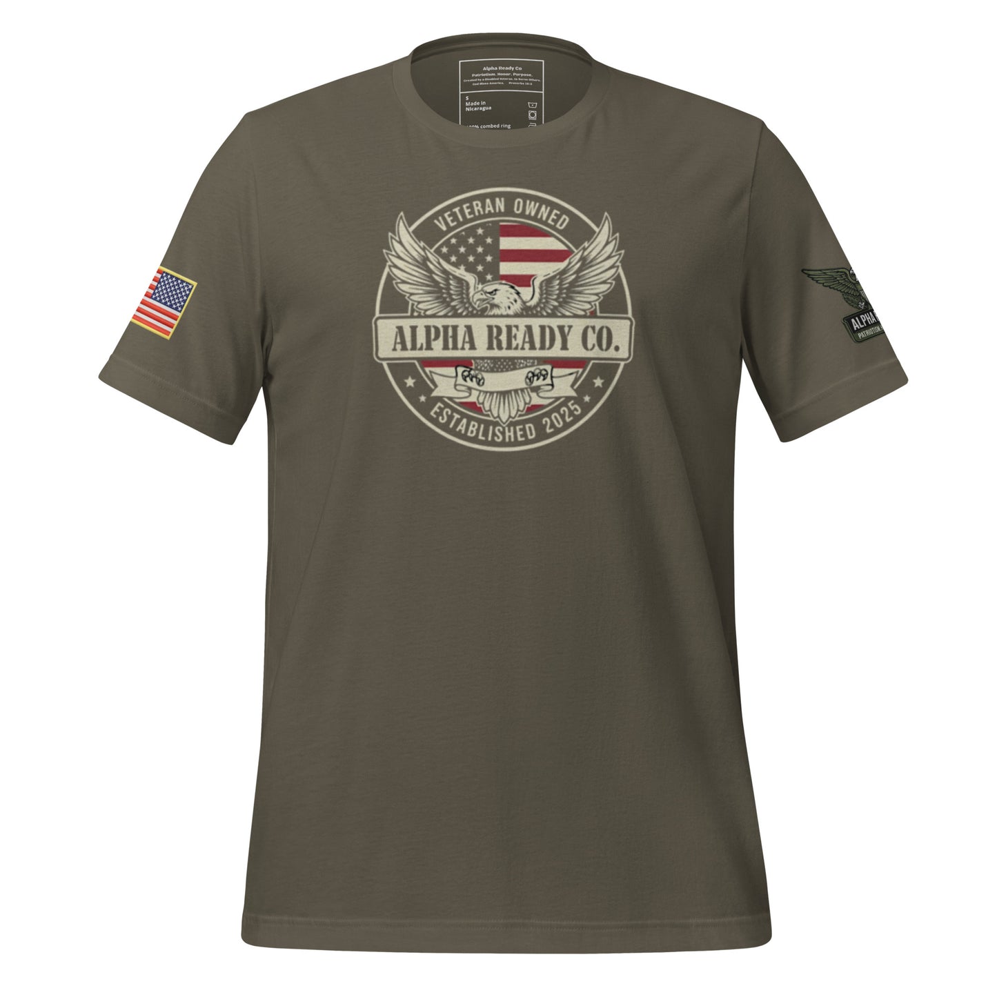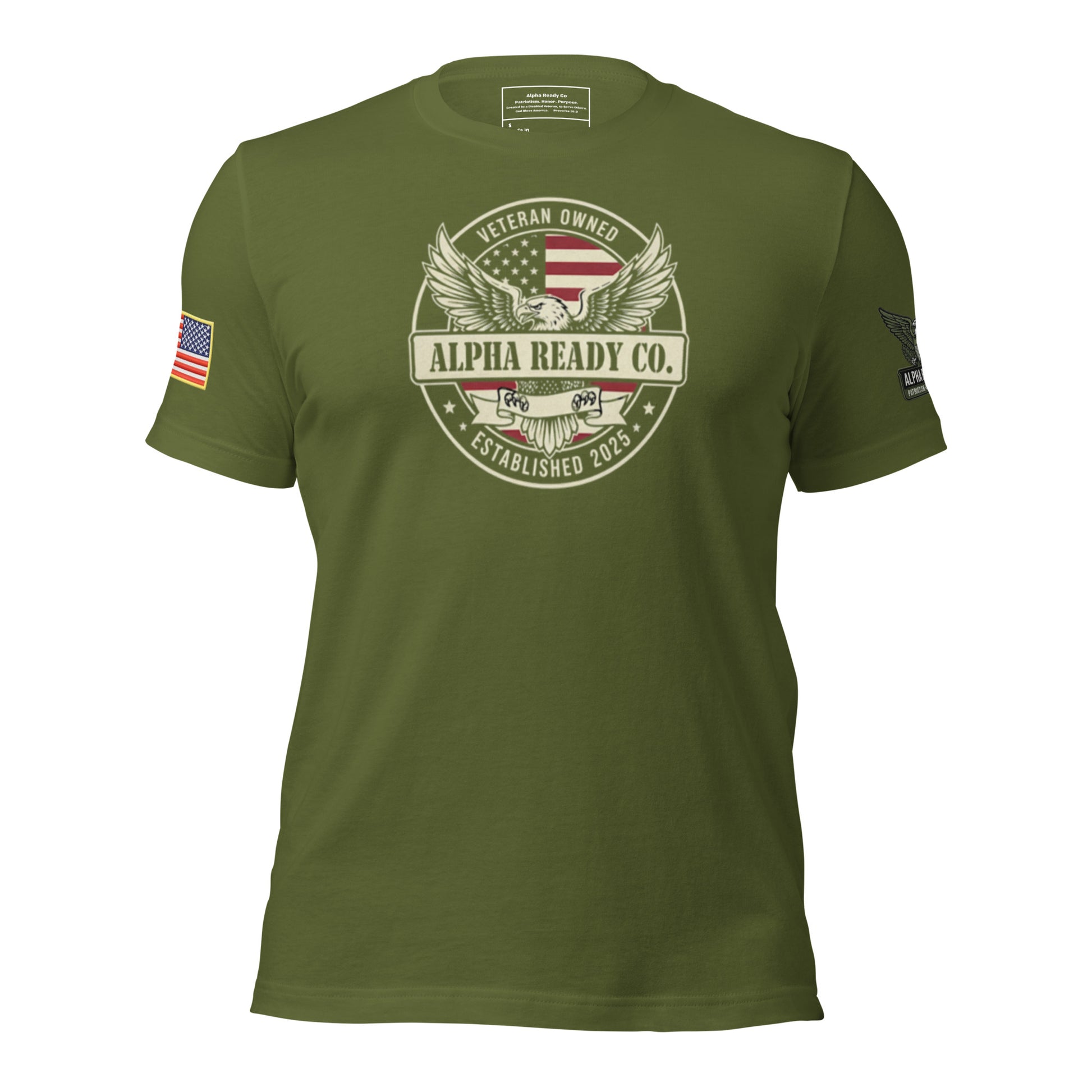 The front of the shirt features a circular logo that acts as a brand seal. A powerful eagle with wings spread wide is set against a backdrop of the American flag, symbolizing our nation's enduring strength and spirit. At the top of the circle, the words “Veteran Owned” stand as a mark of honor, while the bottom is marked with “Established 2025,” our founding year.