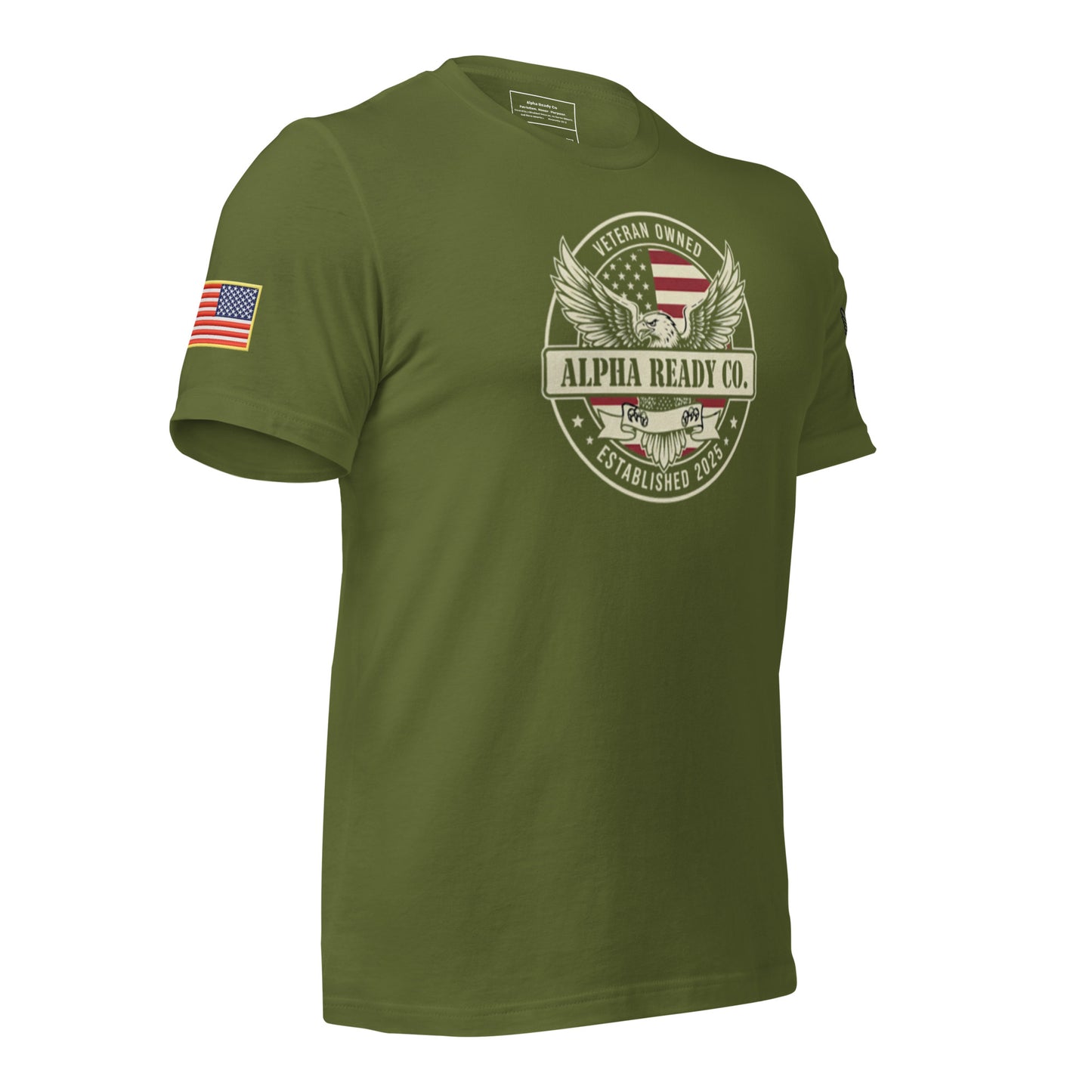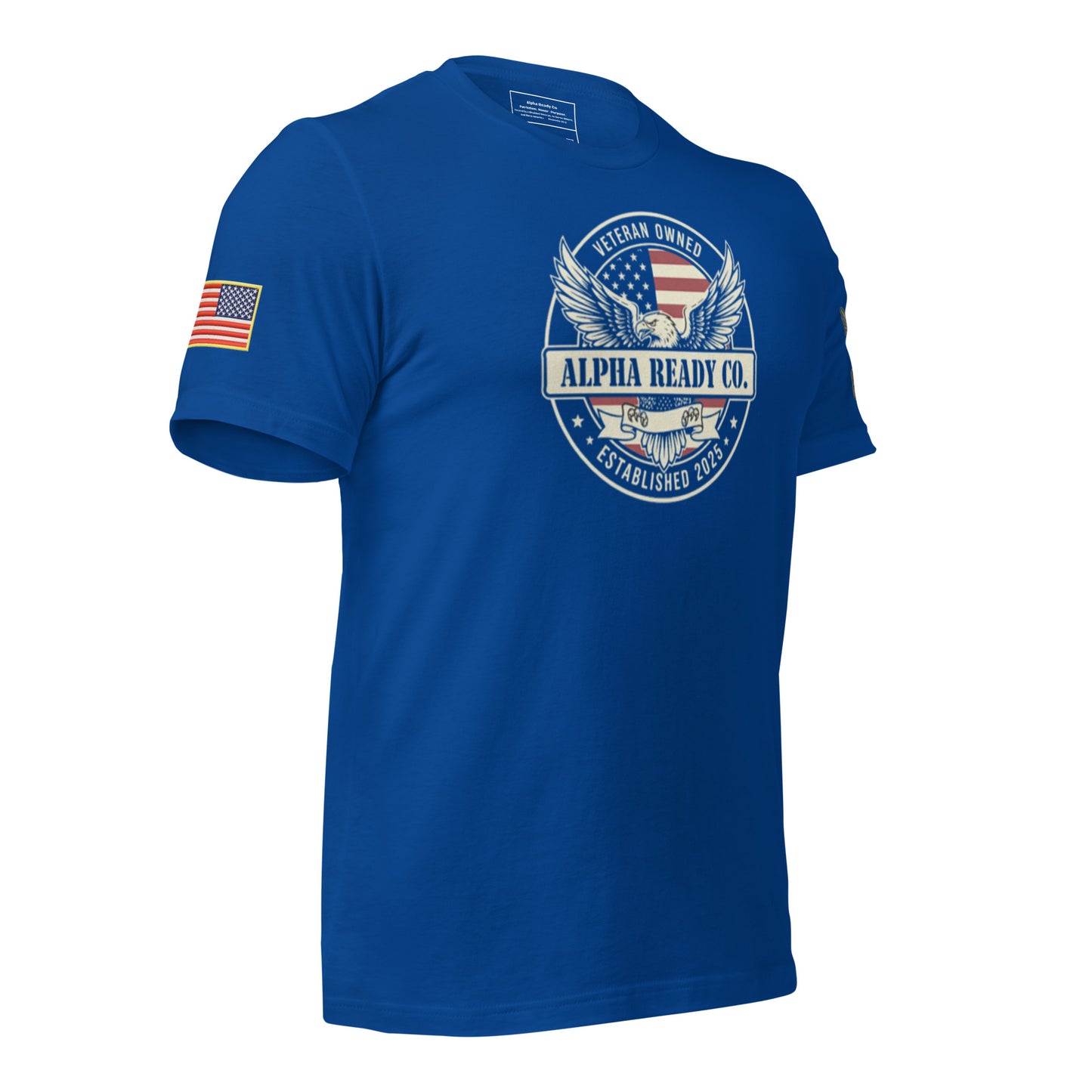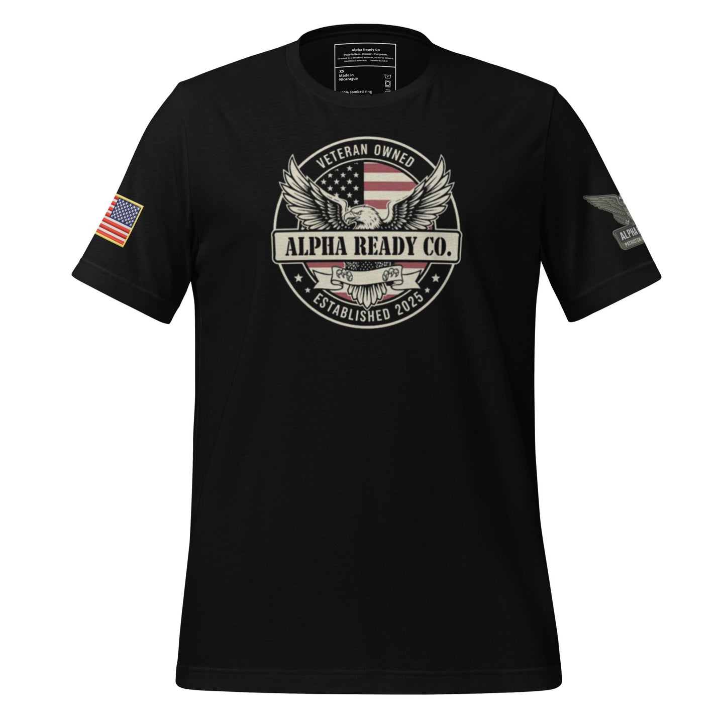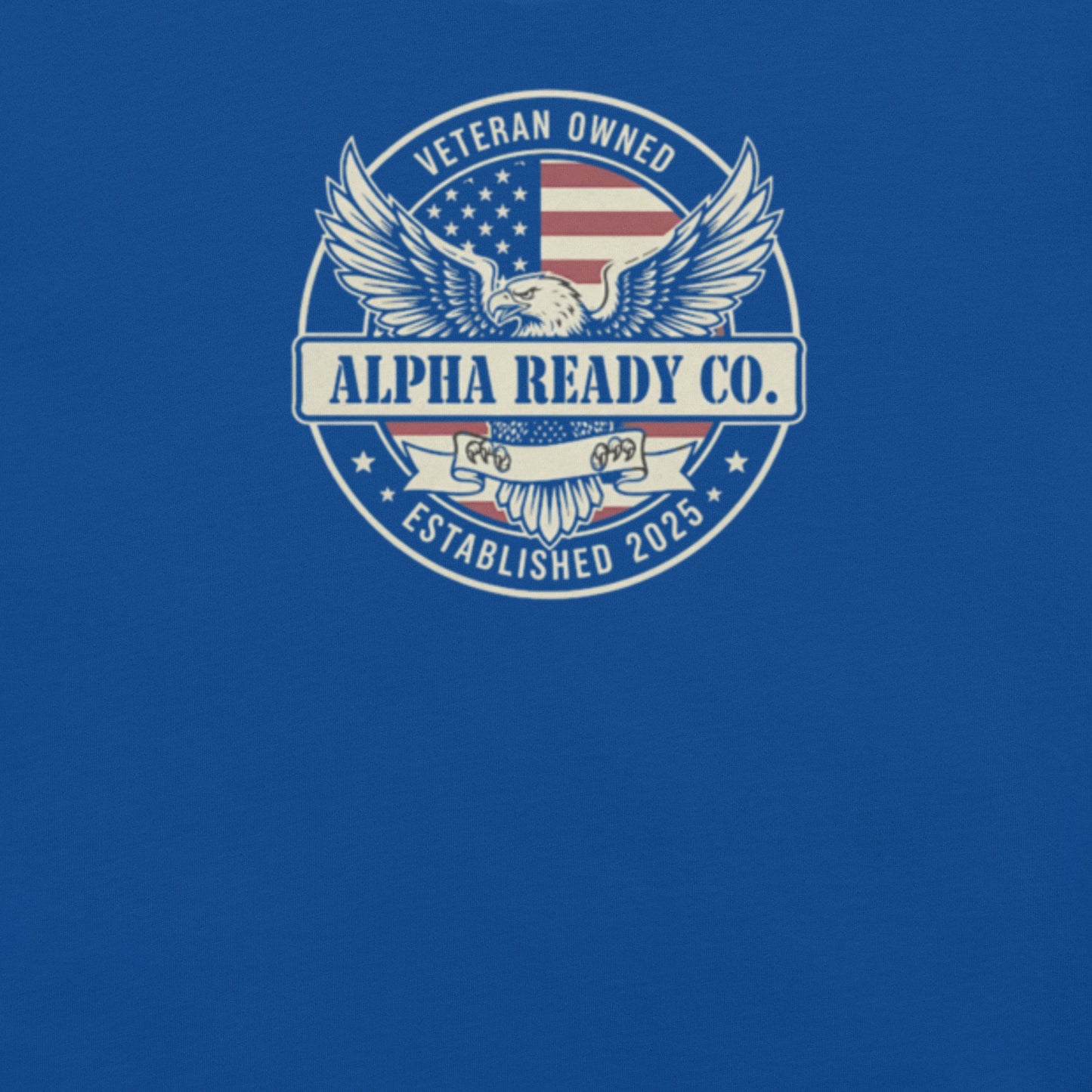 To further amplify its patriotic spirit, the American flag is boldly printed in color on the right sleeve, while our distinctive Alpha Ready Co. logo adorns the left.