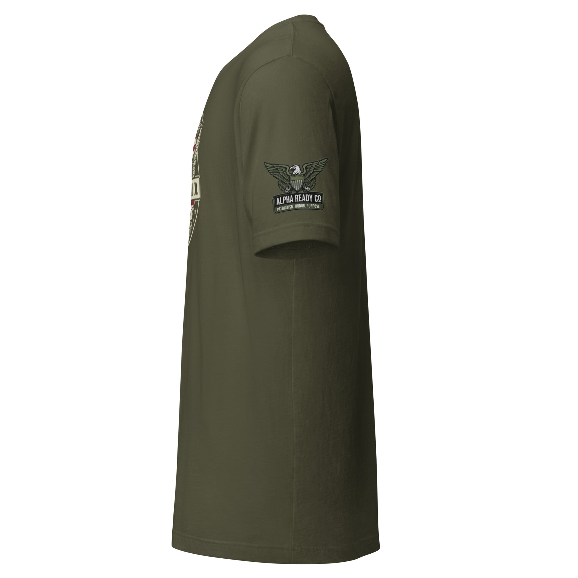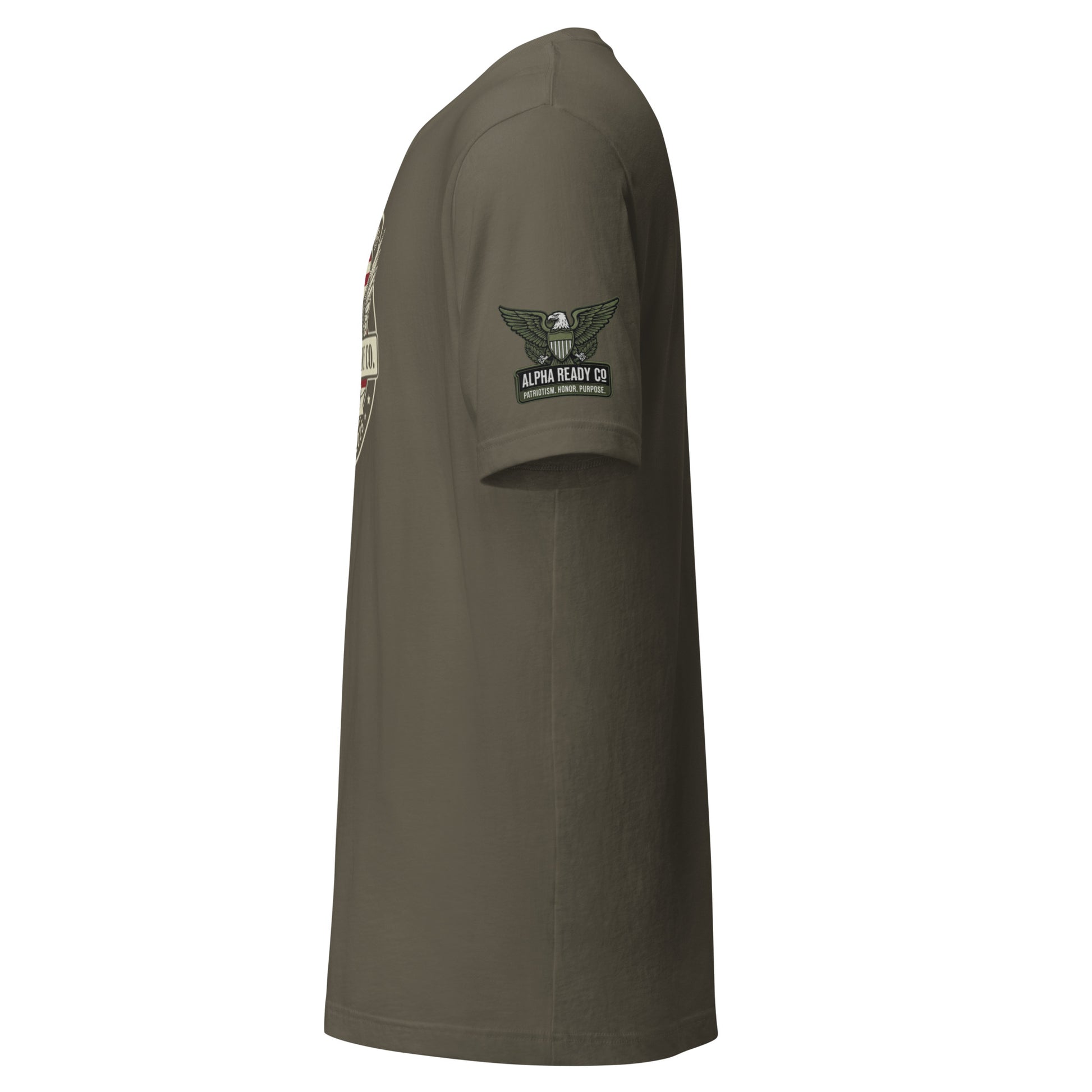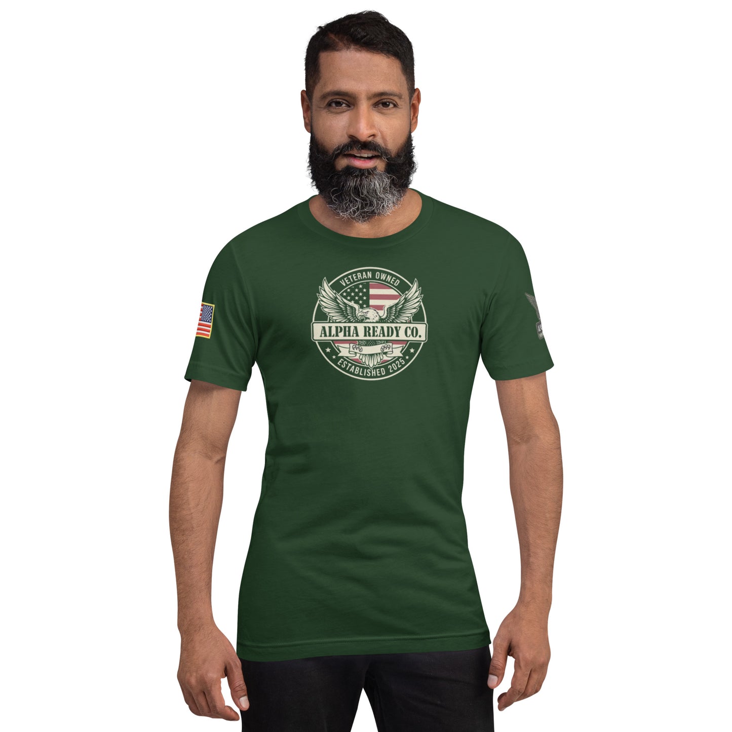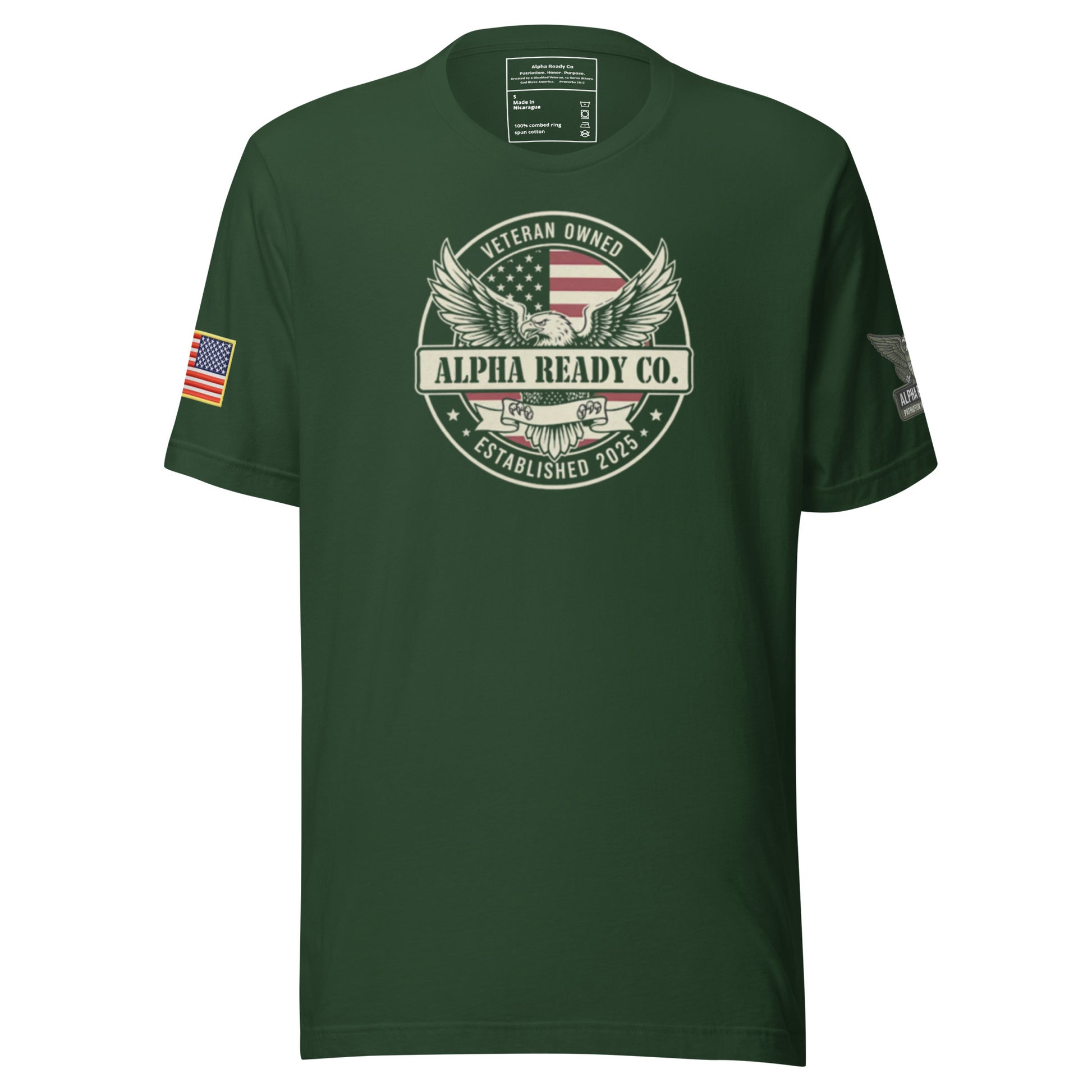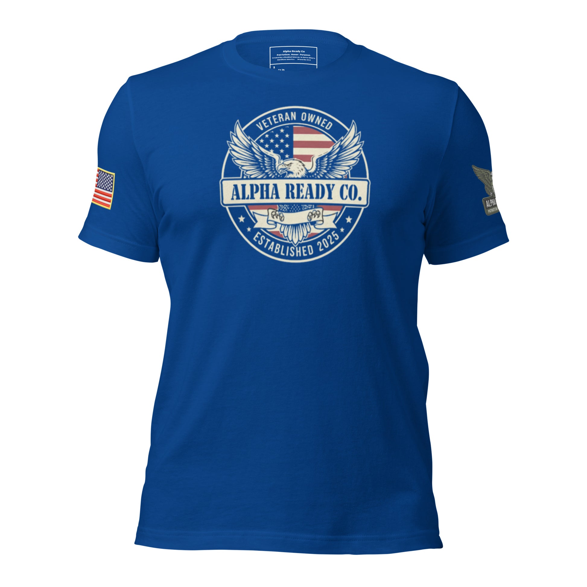 To further amplify its patriotic spirit, the American flag is boldly printed in color on the right sleeve, while our distinctive Alpha Ready Co. logo adorns the left.