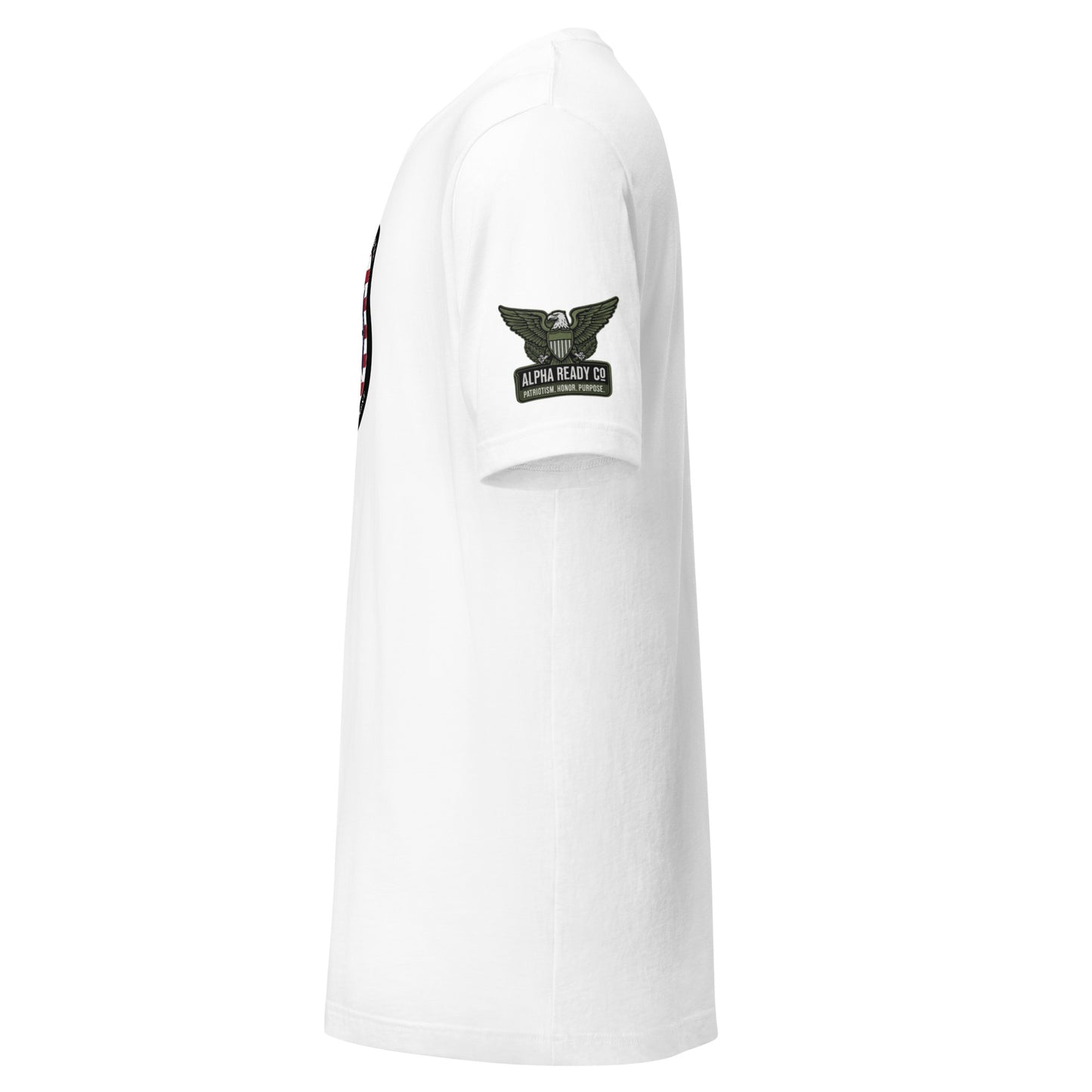 To further amplify its patriotic spirit, the American flag is boldly printed in color on the right sleeve, while our distinctive Alpha Ready Co. logo adorns the left.