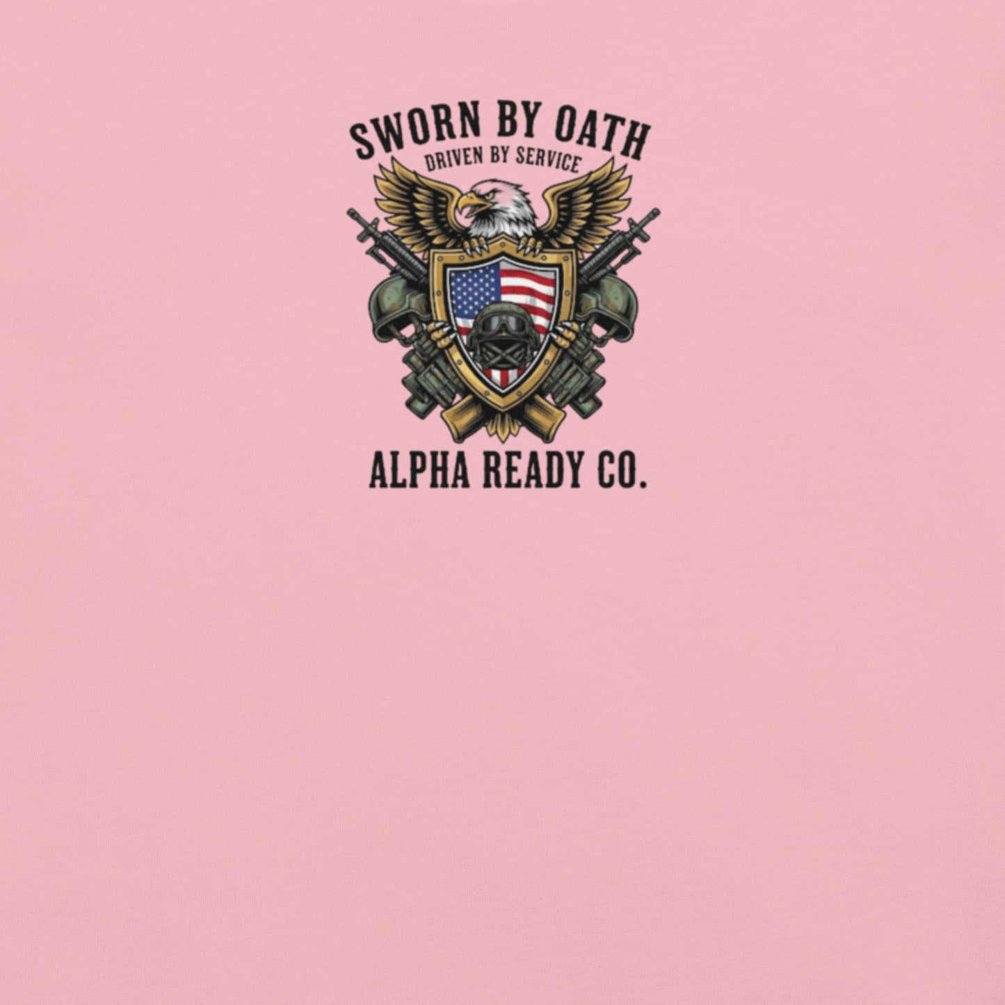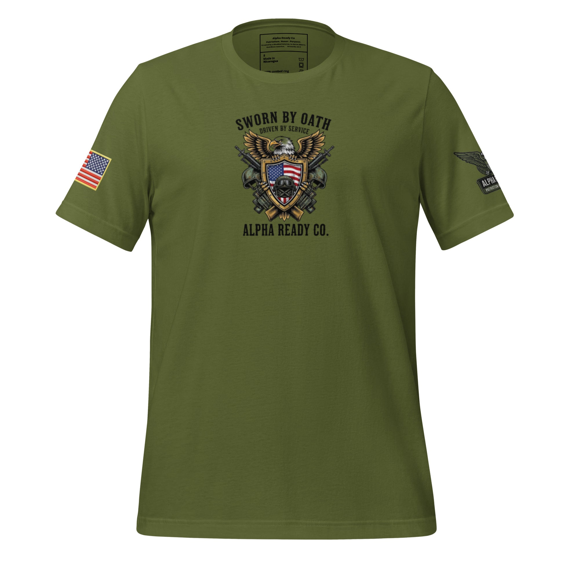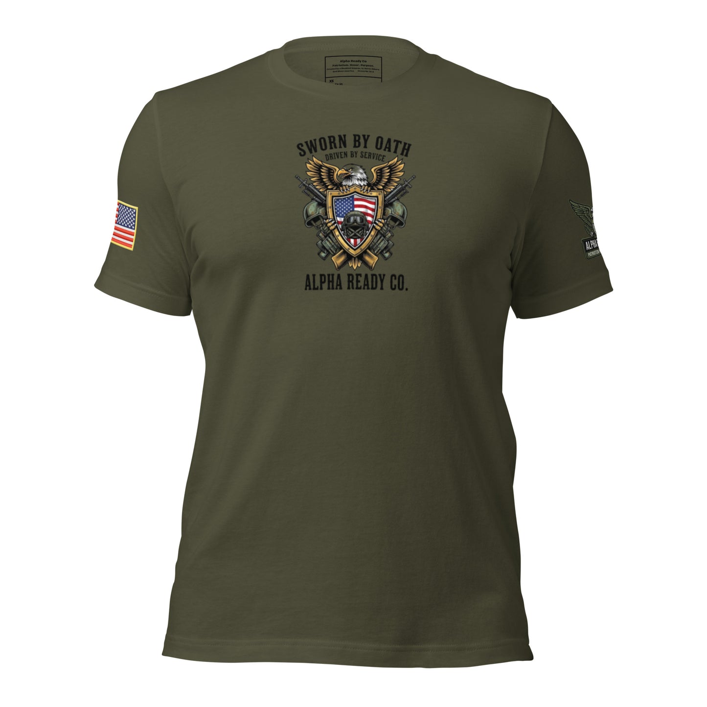 The front of this shirt is a striking testament to military dedication, featuring a shield clutched by a powerful eagle, surrounded by symbols of valor and duty. The phrases "Sworn by oath driven by service" and "Alpha Ready Co." frame the central design.