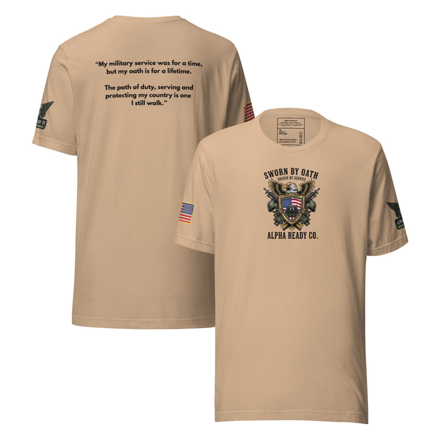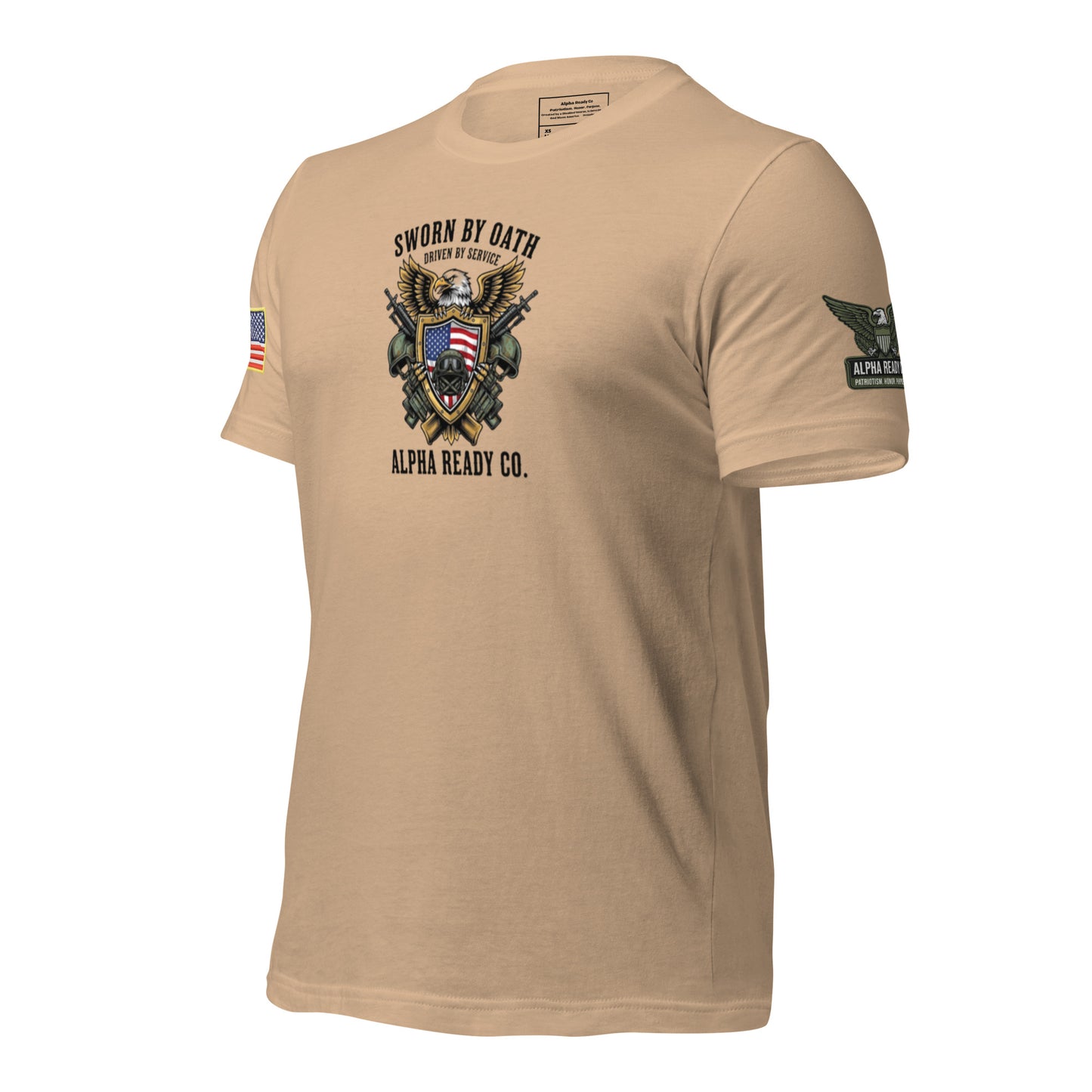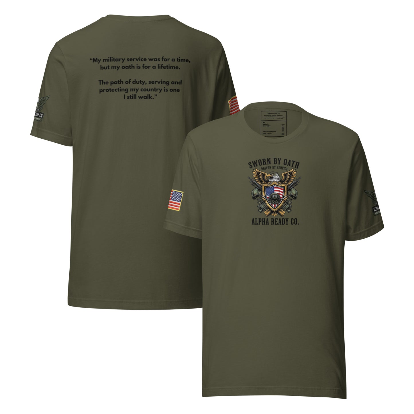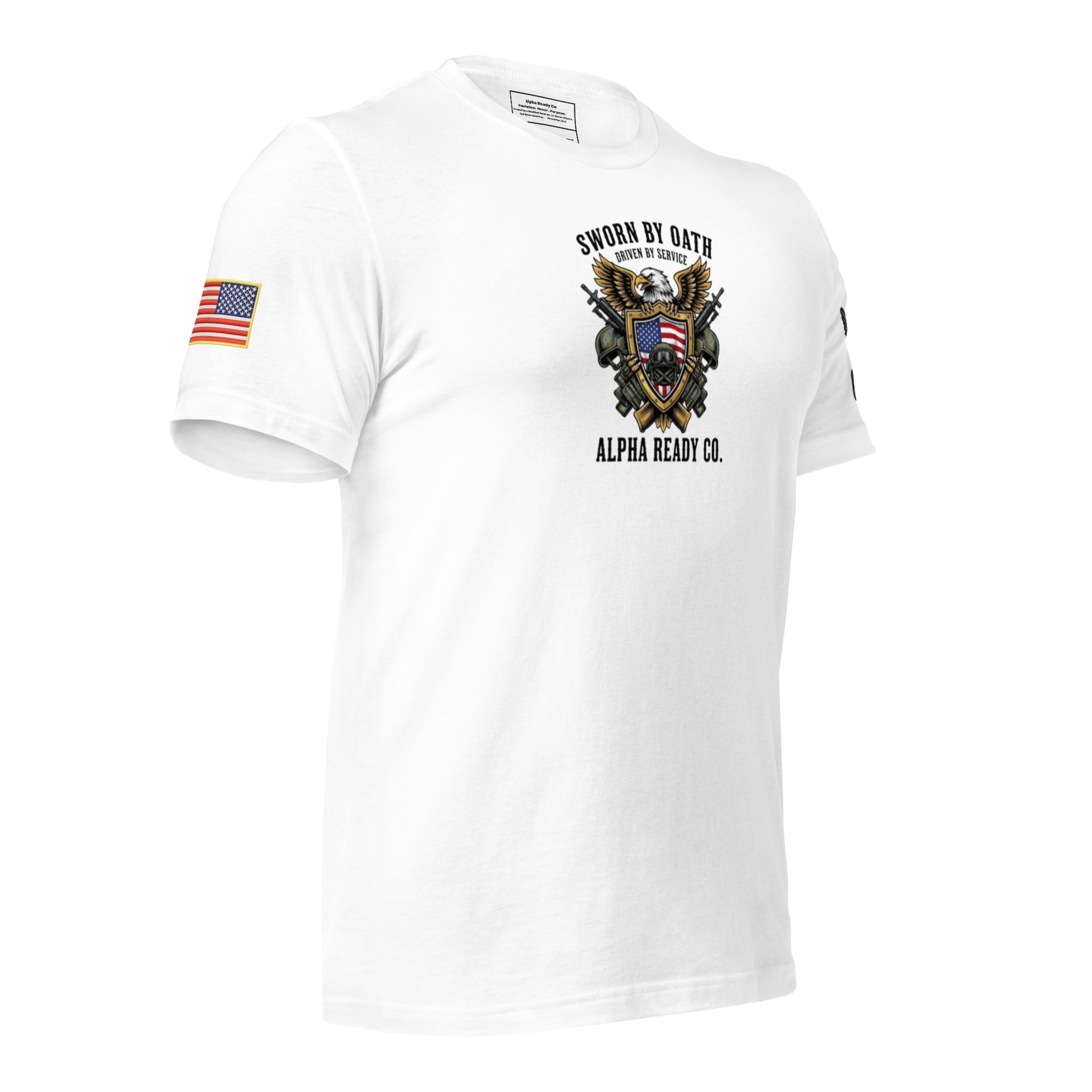 The front of this shirt is a striking testament to military dedication, featuring a shield clutched by a powerful eagle, surrounded by symbols of valor and duty. The phrases "Sworn by oath driven by service" and "Alpha Ready Co." frame the central design.