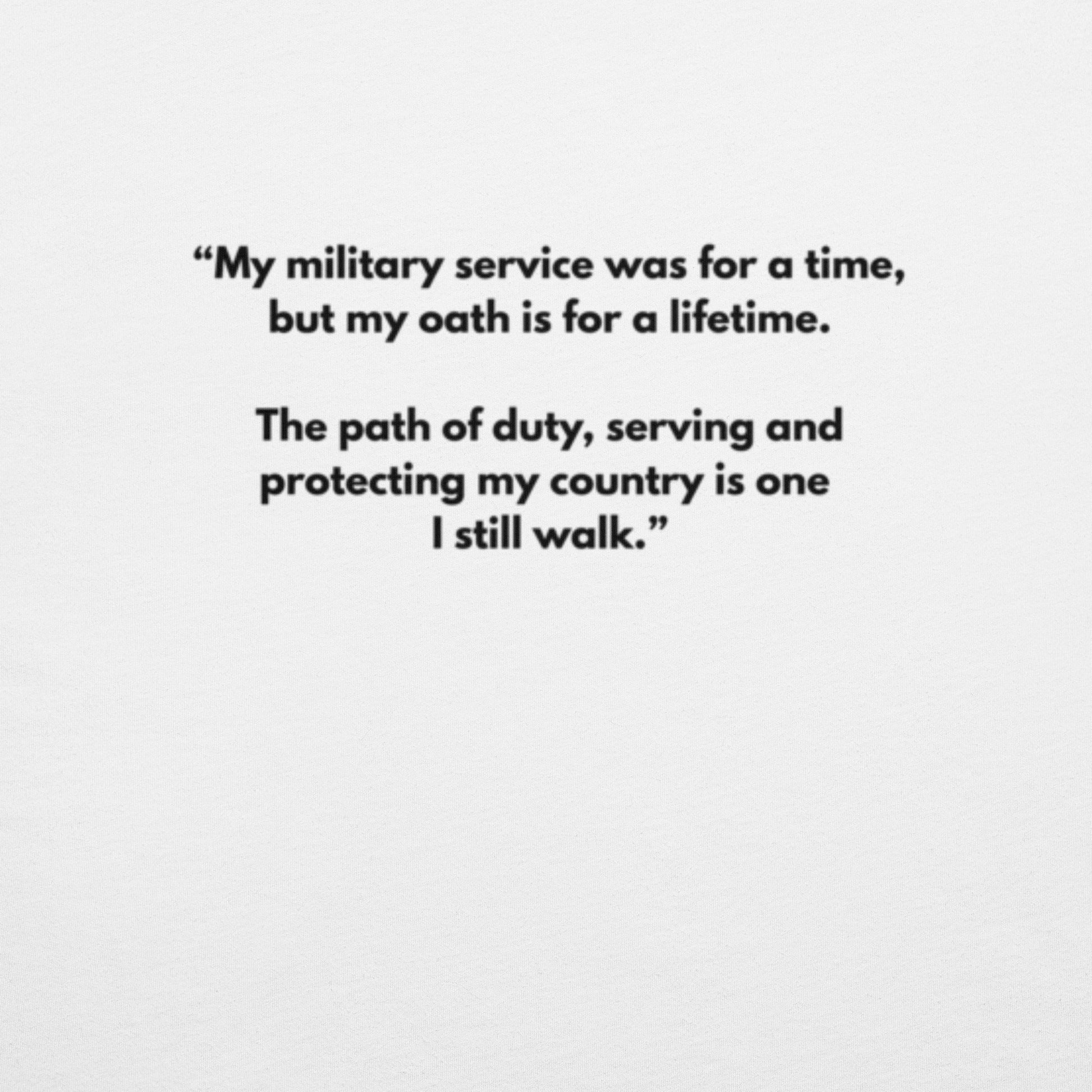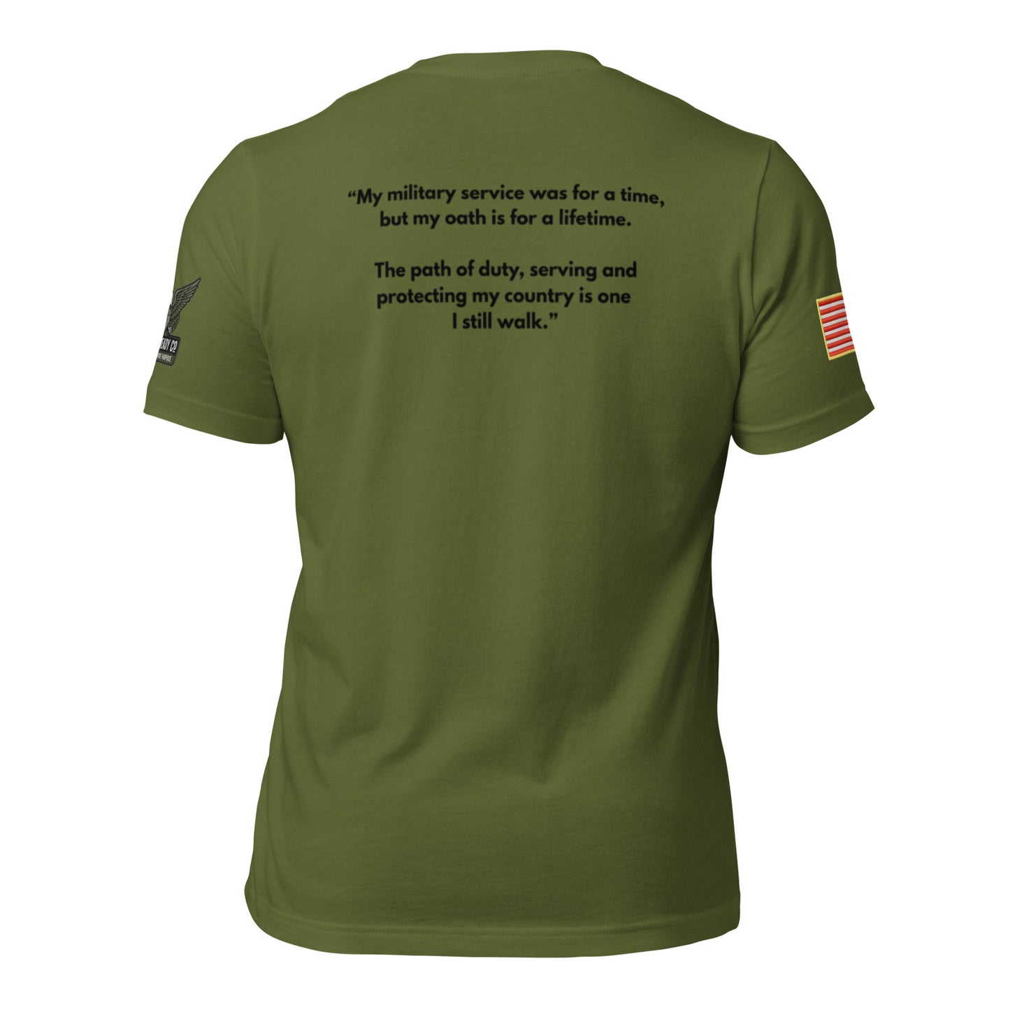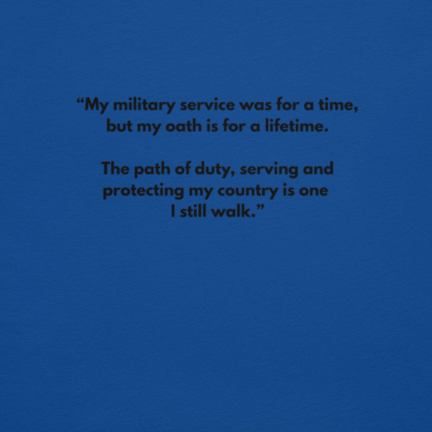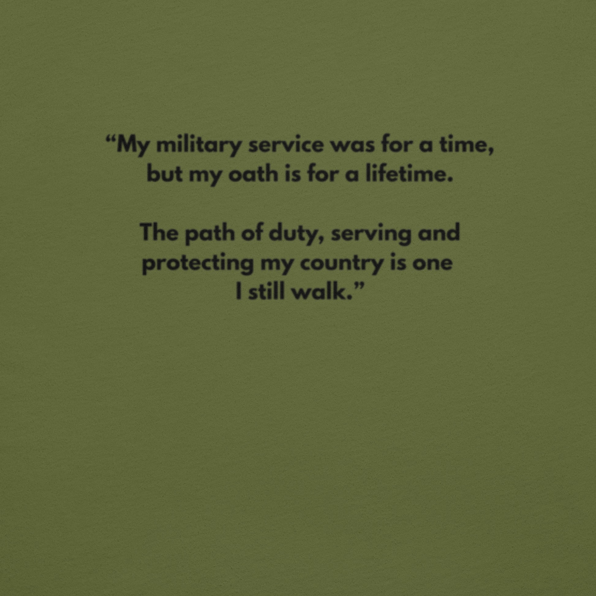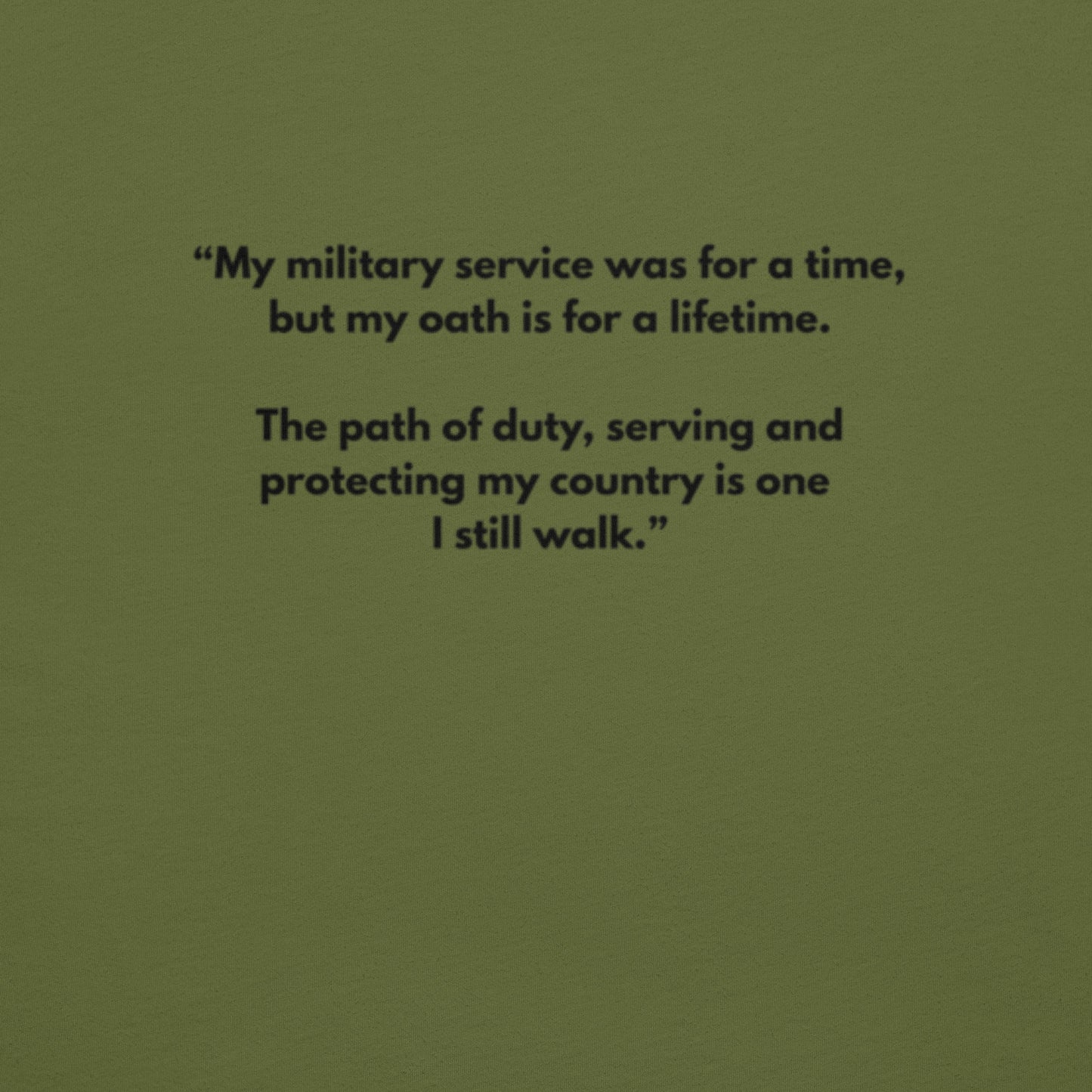 On the back, a powerful message speaks to the heart of every veteran: "My military service was for a time, but my oath is for a lifetime. The path of duty, serving and protecting my country is one I still walk." This shirt is a tribute to the lasting legacy of service.