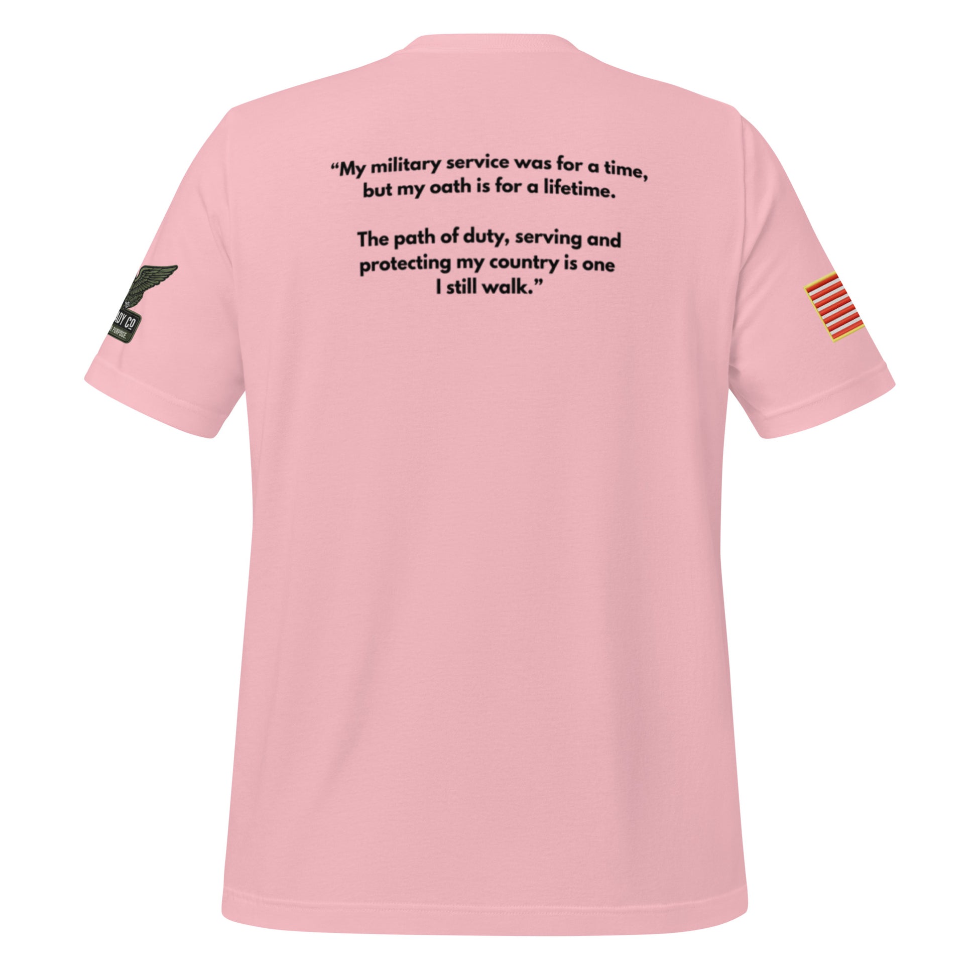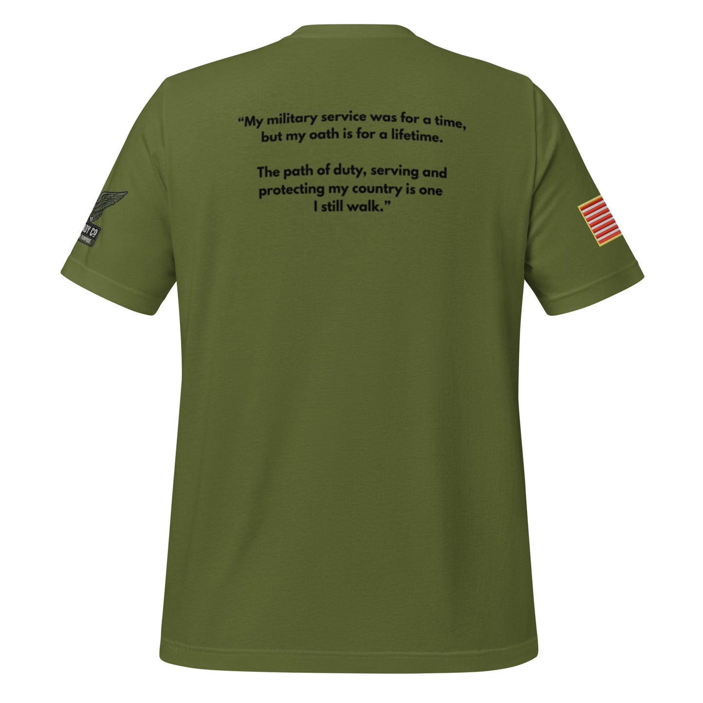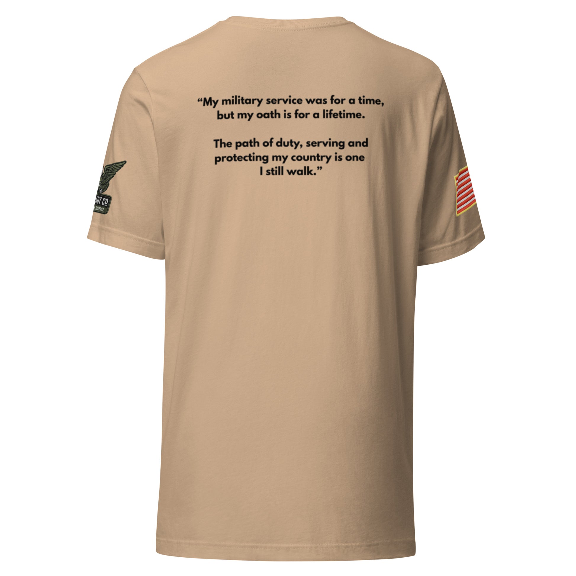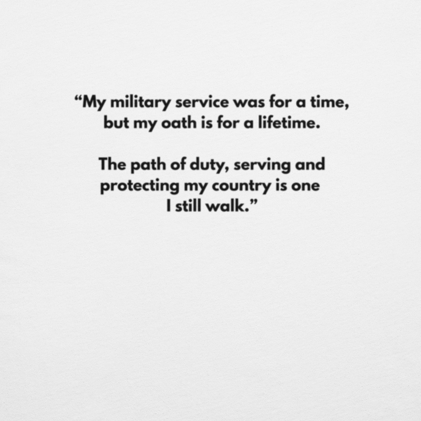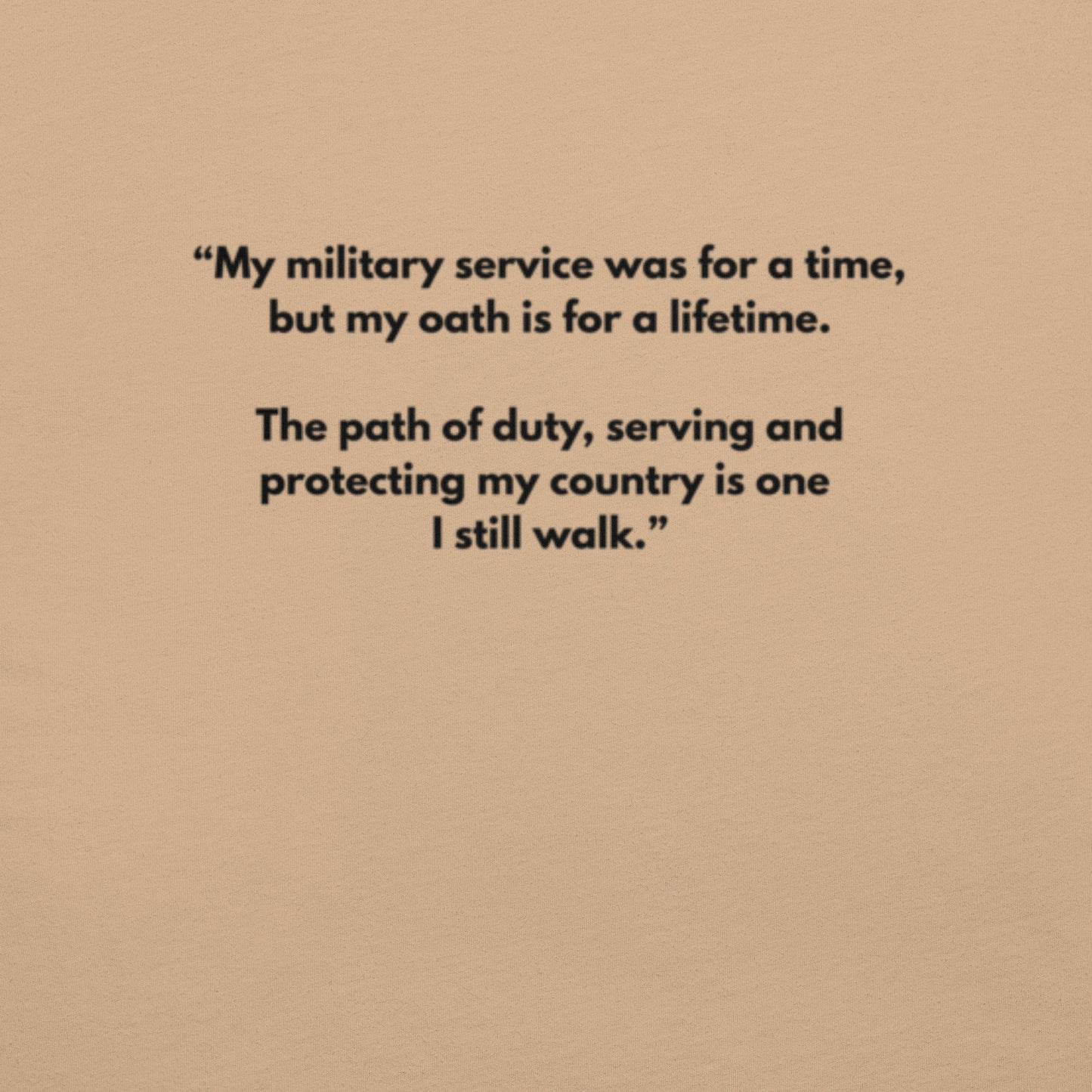 On the back, a powerful message speaks to the heart of every veteran: "My military service was for a time, but my oath is for a lifetime. The path of duty, serving and protecting my country is one I still walk." This shirt is a tribute to the lasting legacy of service.