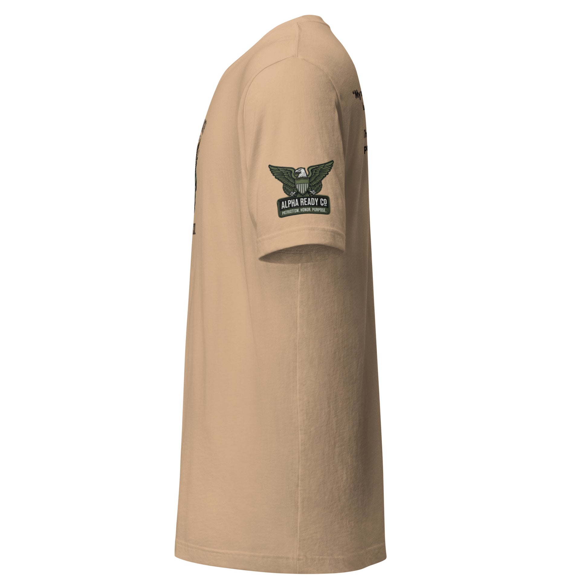 To further amplify its patriotic spirit, the American flag is boldly printed in color on the right sleeve, while our distinctive Alpha Ready Co. logo adorns the left.
