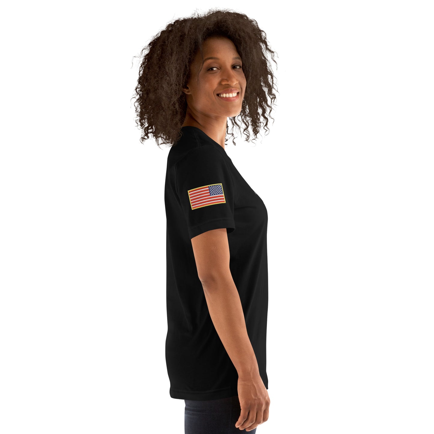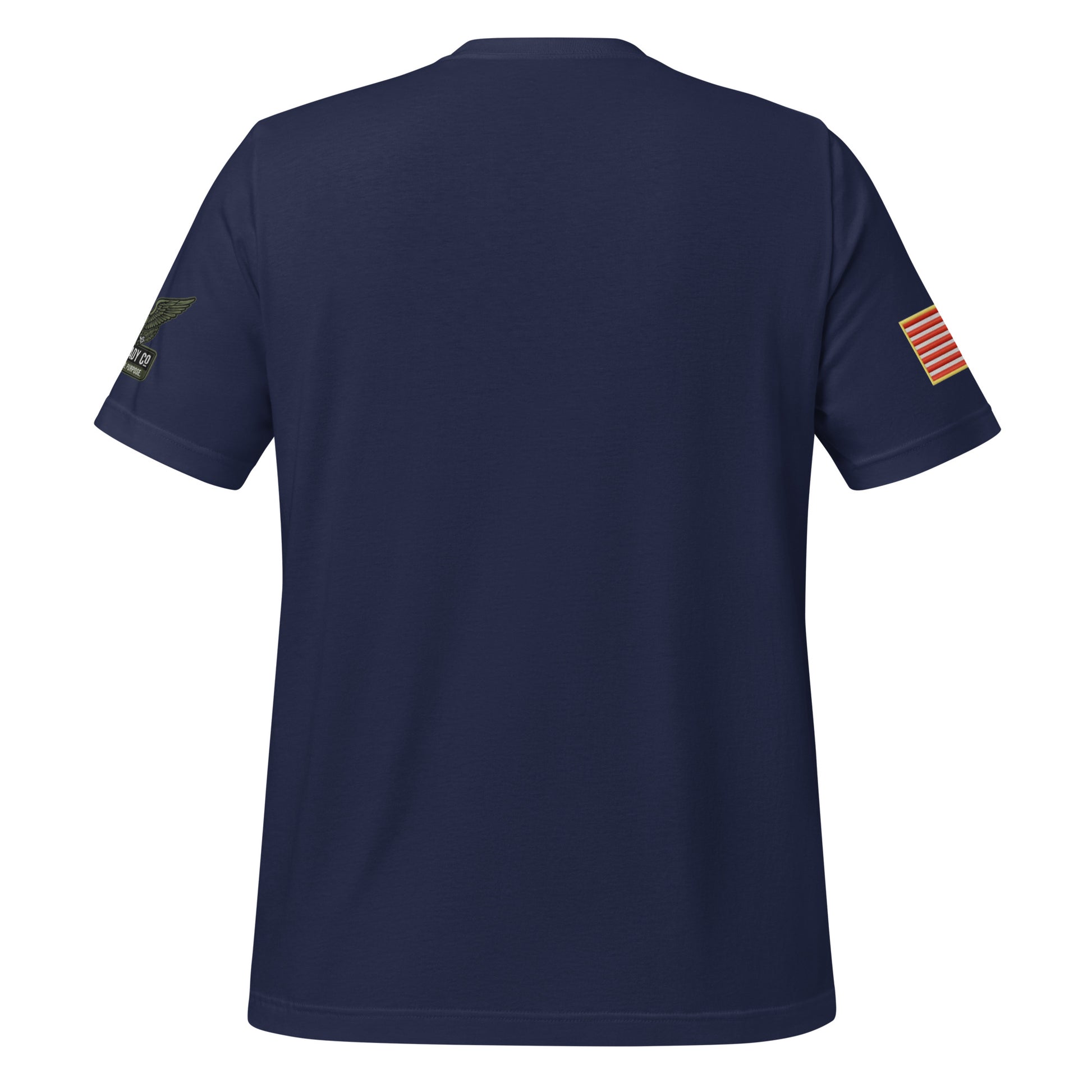 To further amplify its patriotic spirit, the American flag is boldly printed in color on the right sleeve, while our distinctive Alpha Ready Co. logo adorns the left.