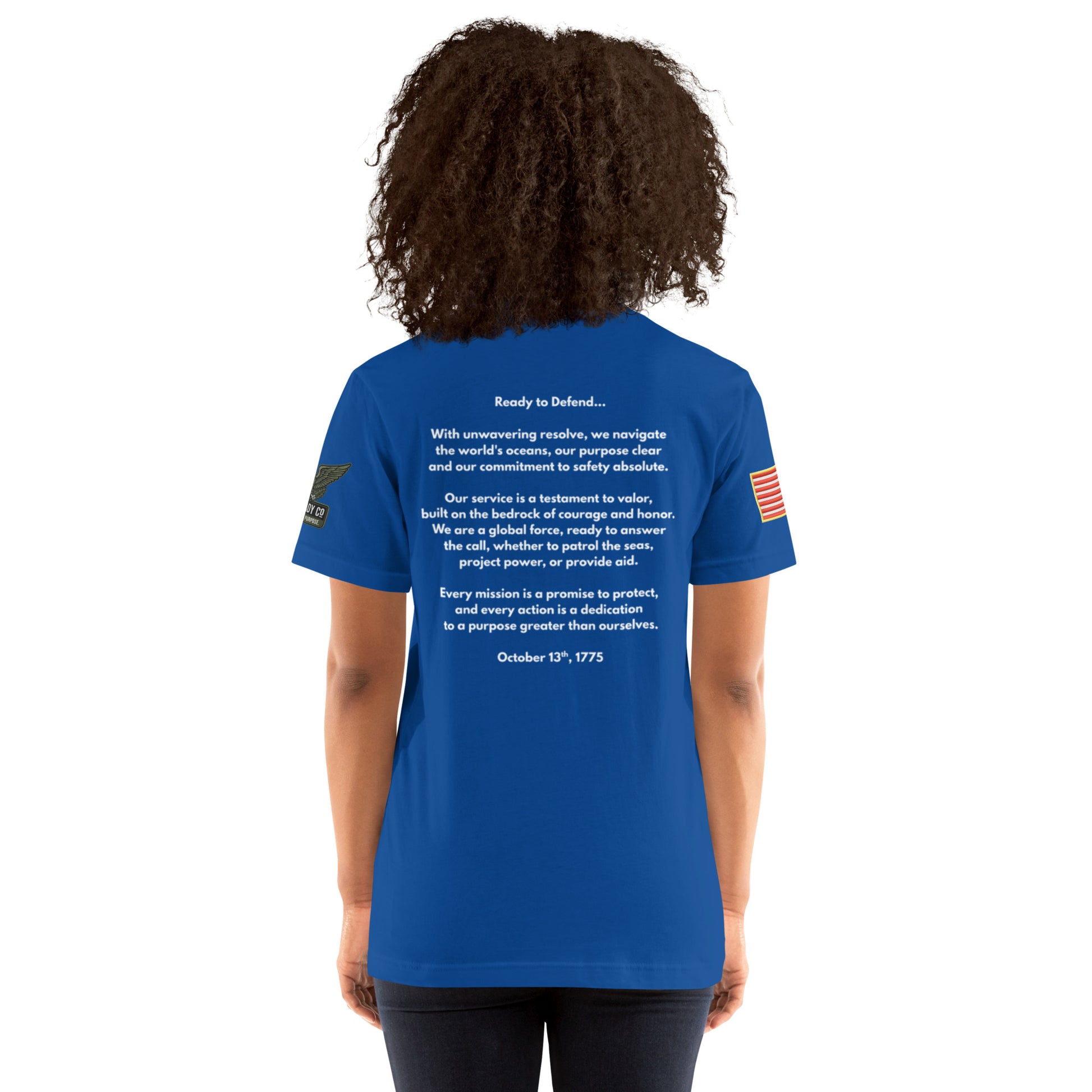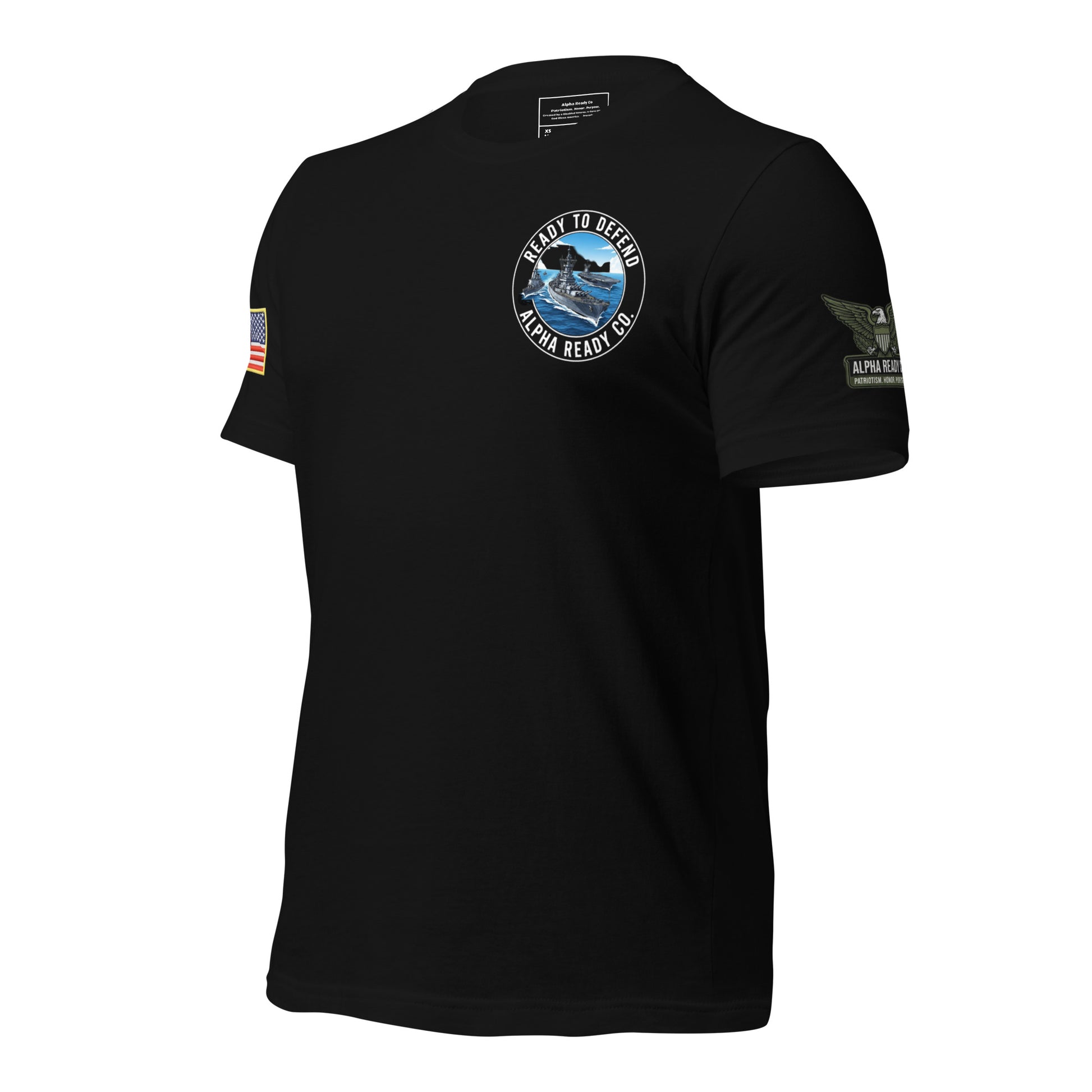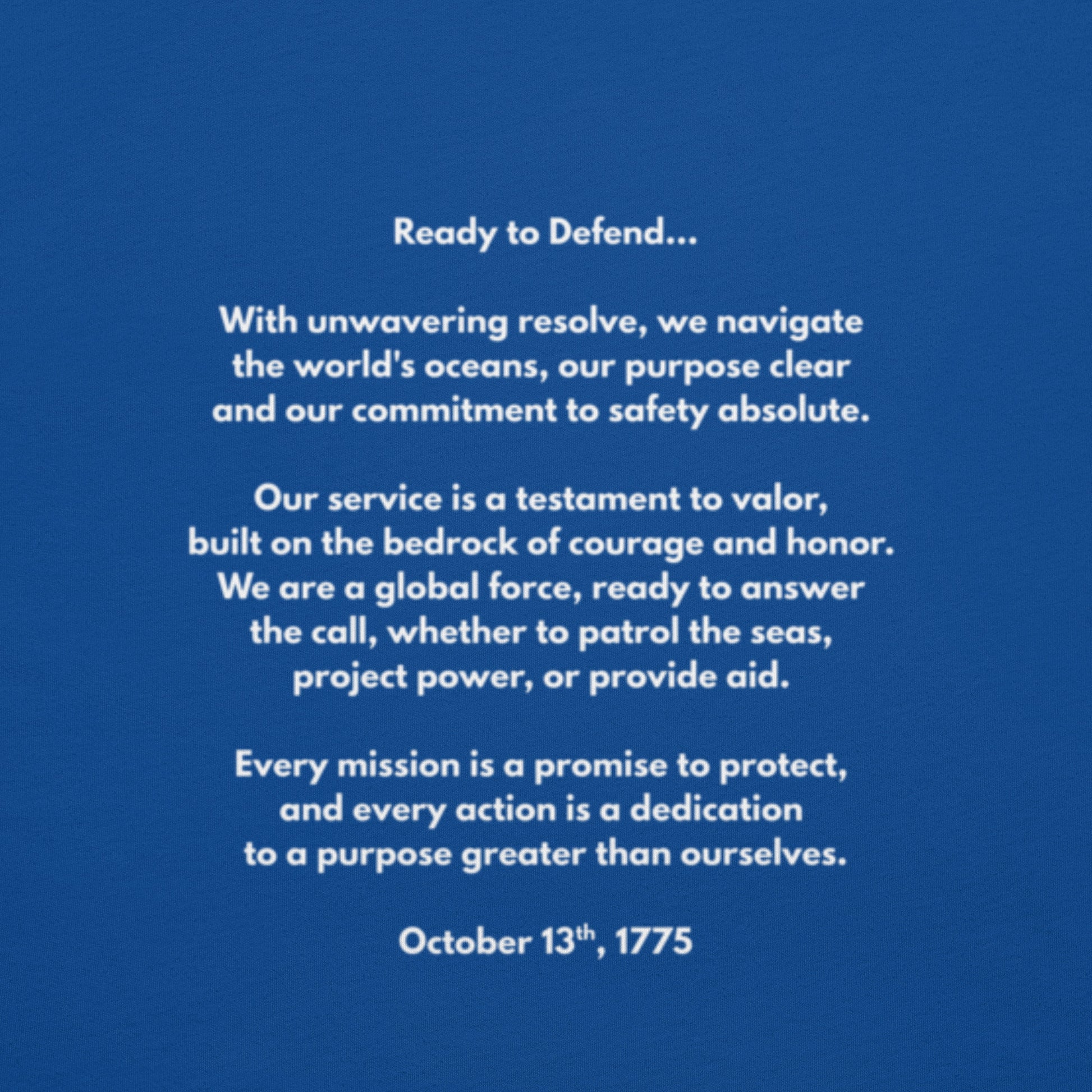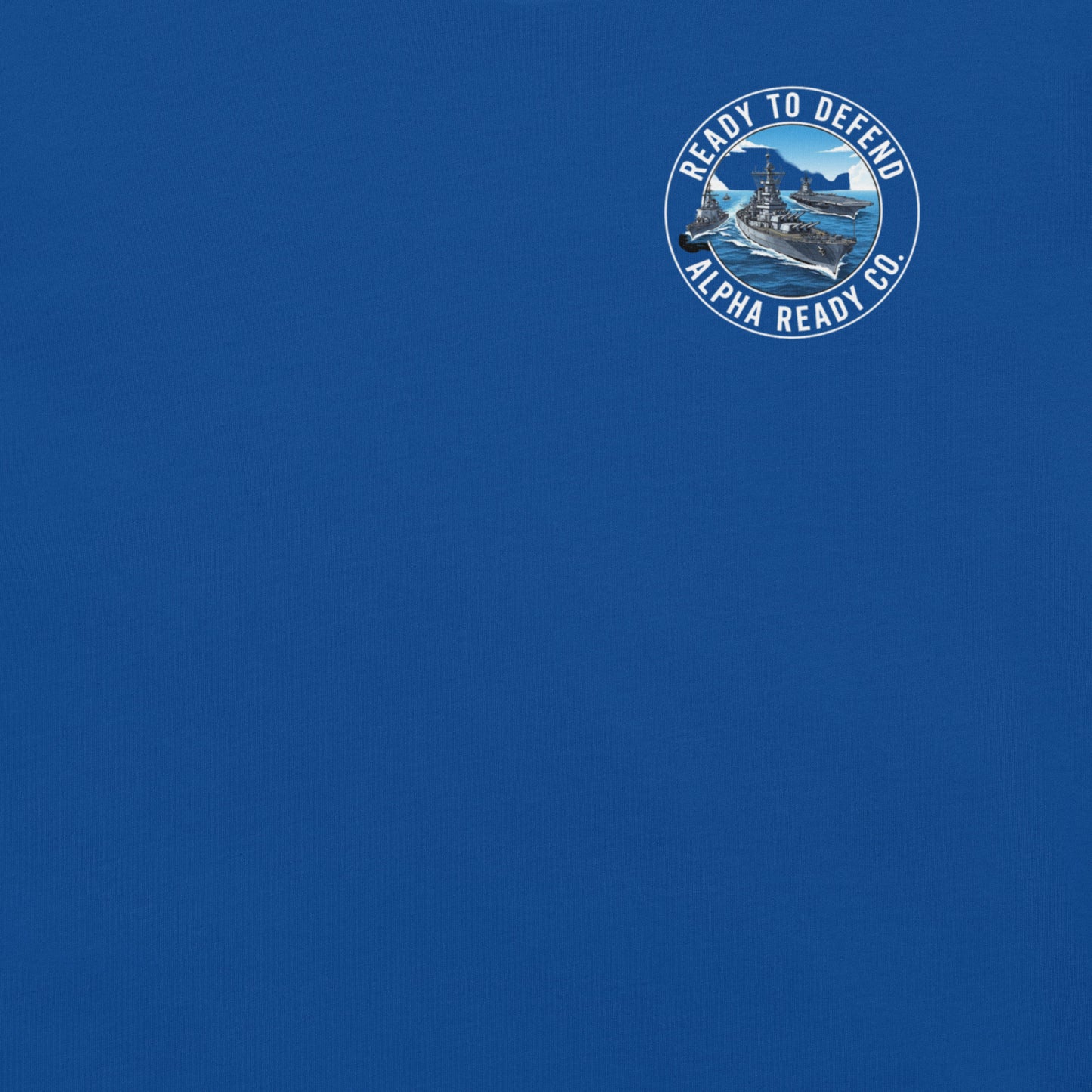 Show your pride in the maritime spirit with our new "Ready to Defend" shirt. On the front, three ships sail beneath the words "Ready to Defend," symbolizing a global presence. The chest logo is a tribute to the dedication and readiness of our nation's sea-bound protectors.