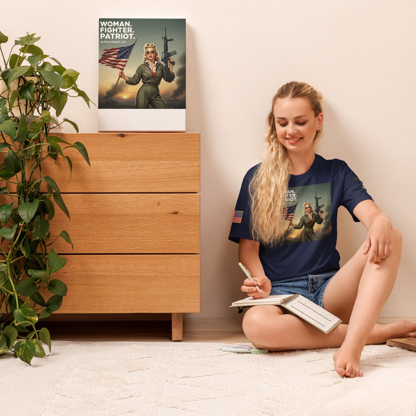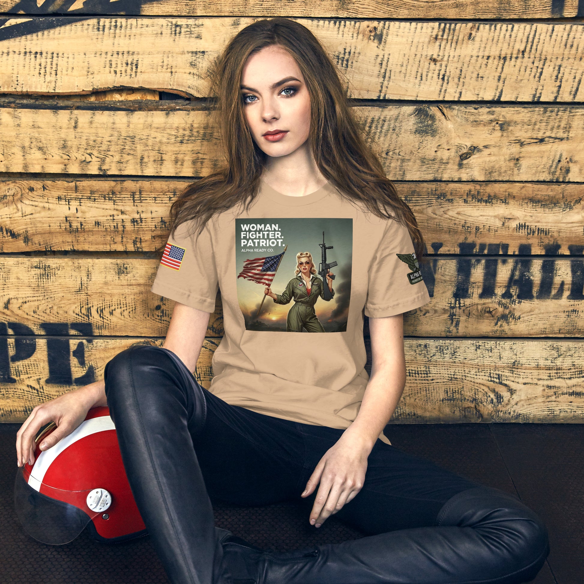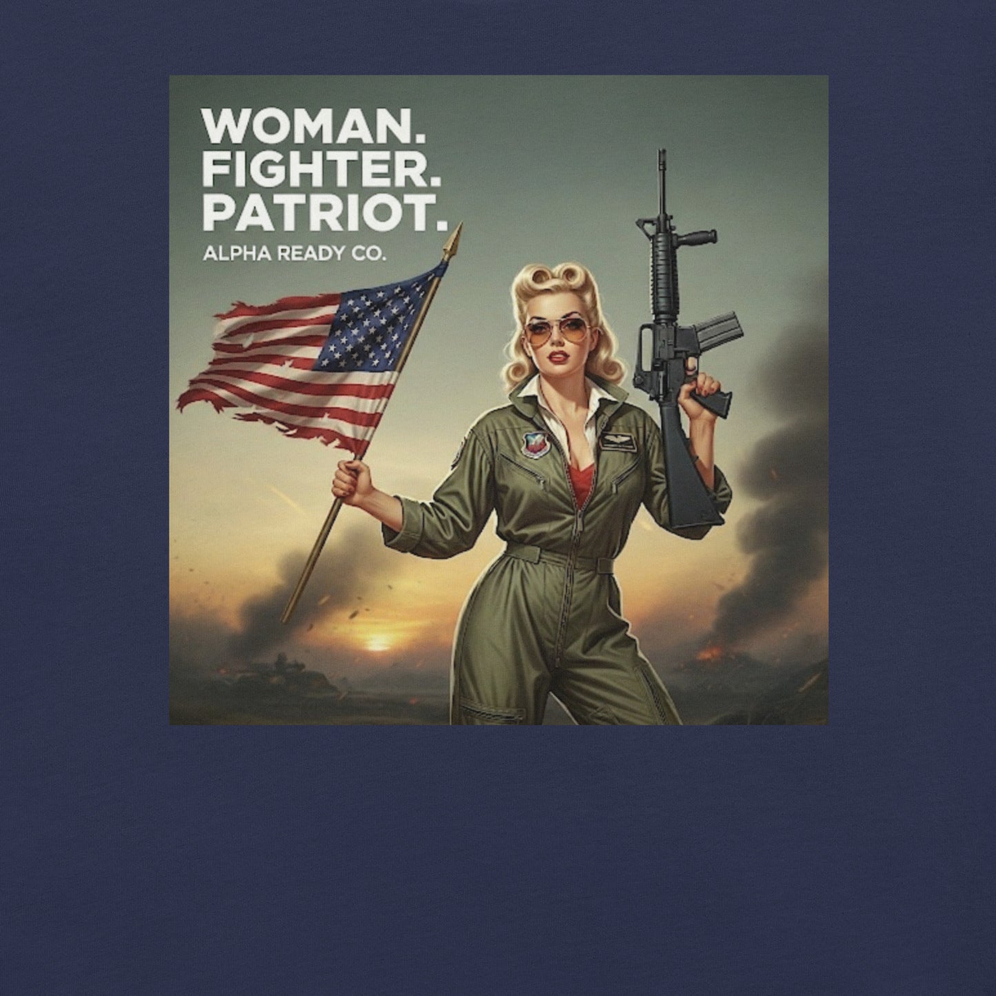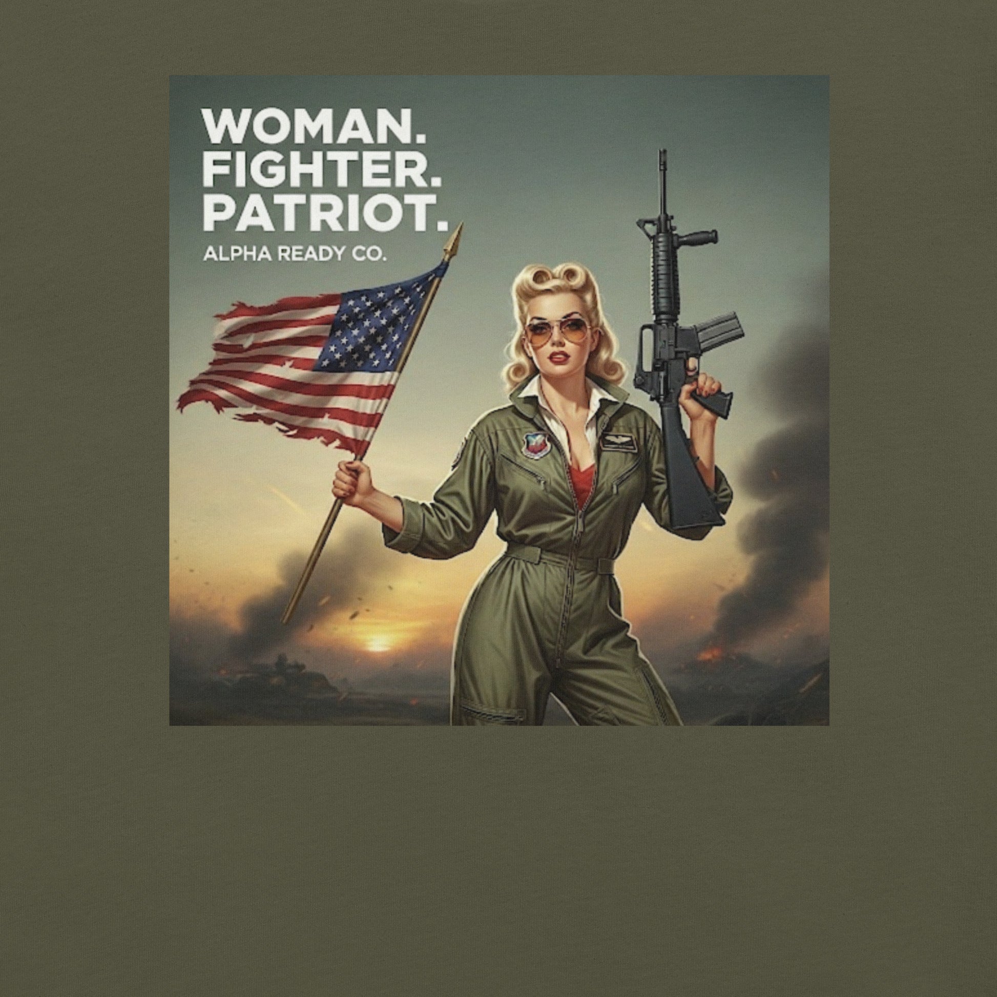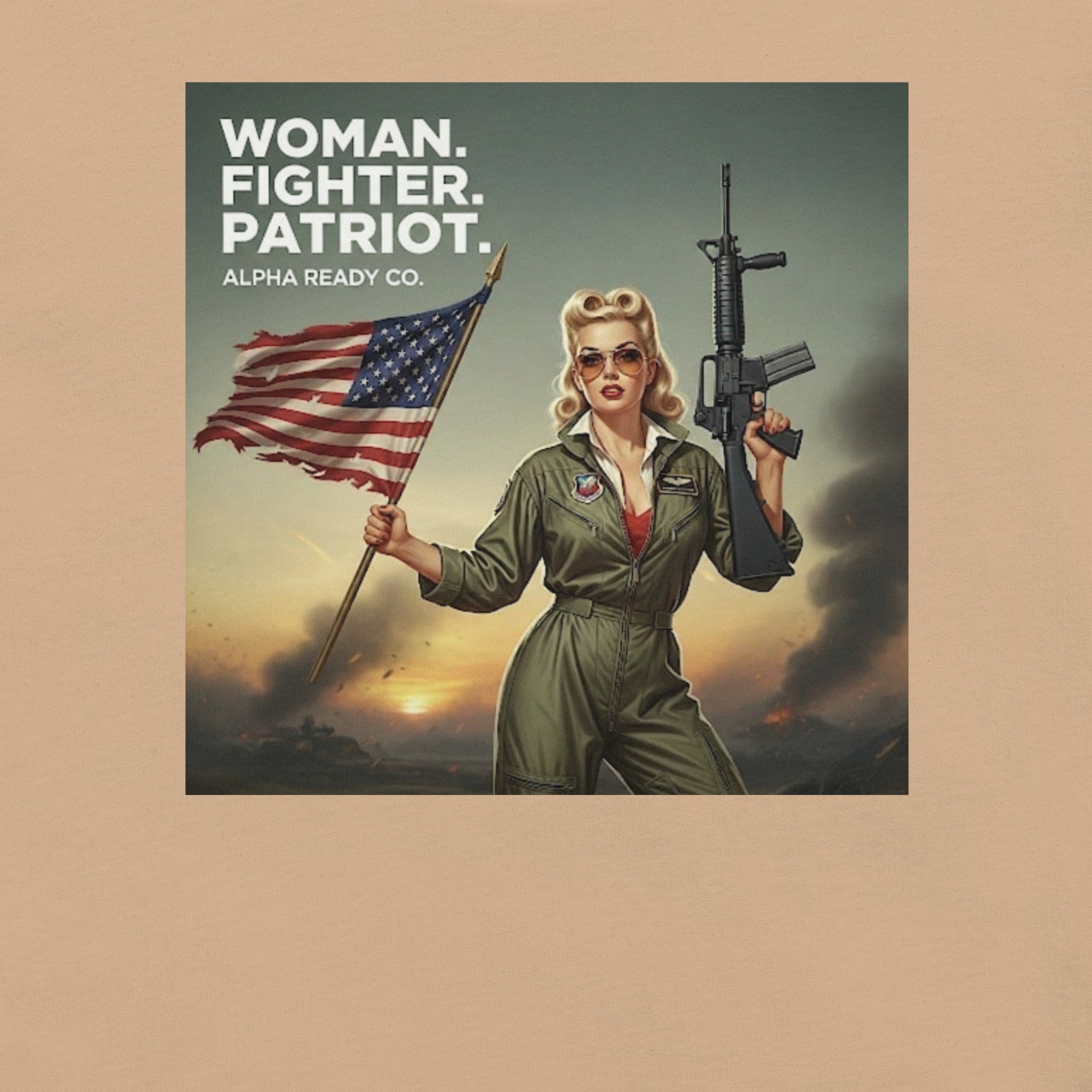 The words "Woman. Fighter. Patriot." stand to the side of the image, a powerful creed for those who live with courage and purpose.