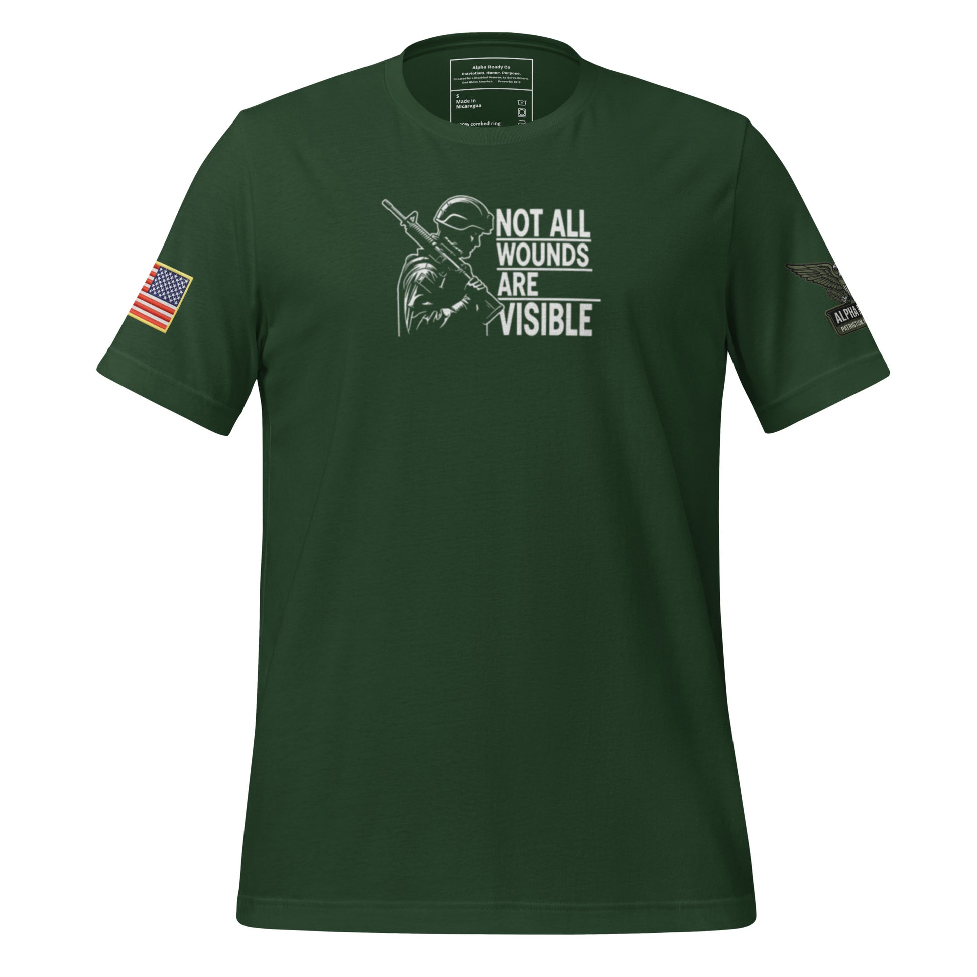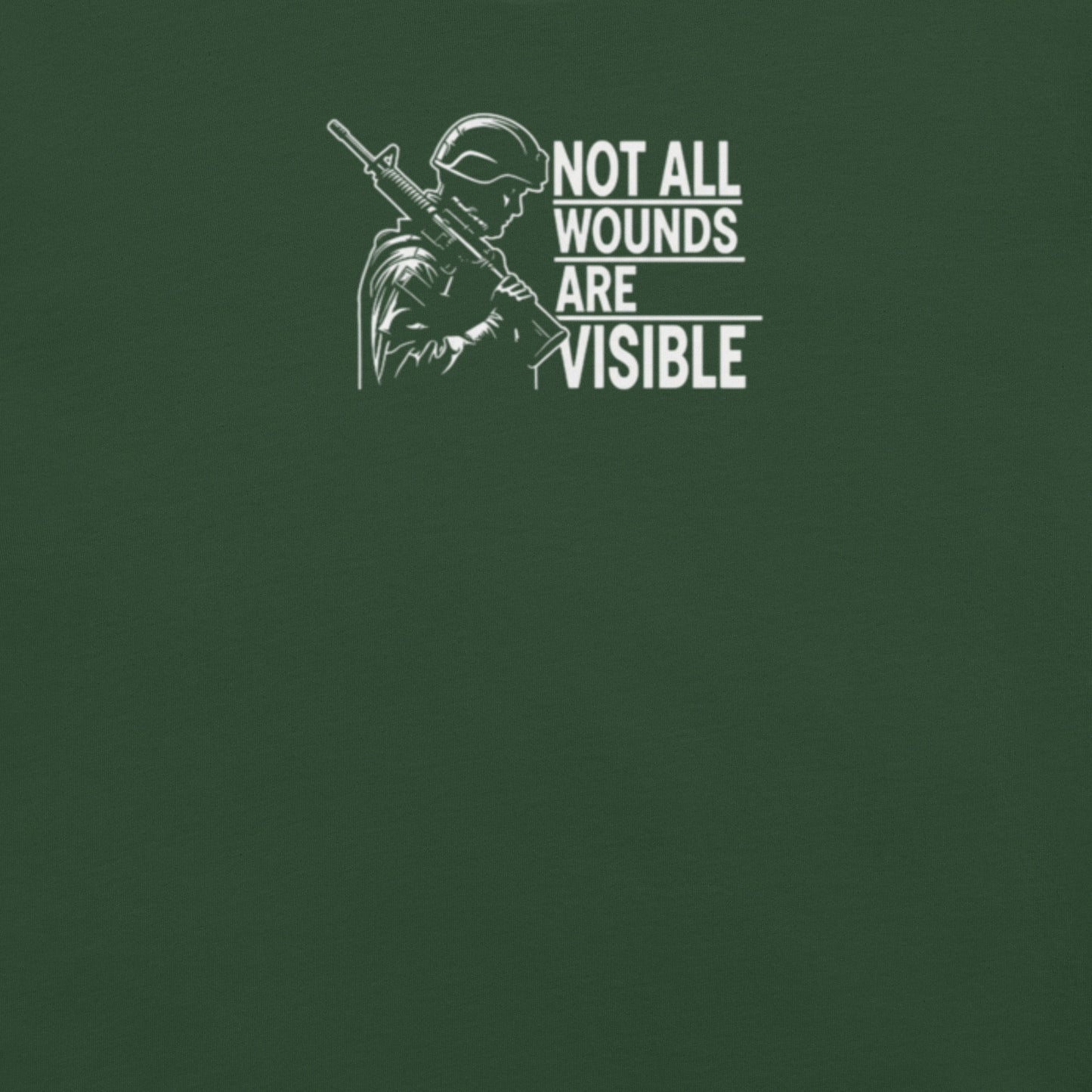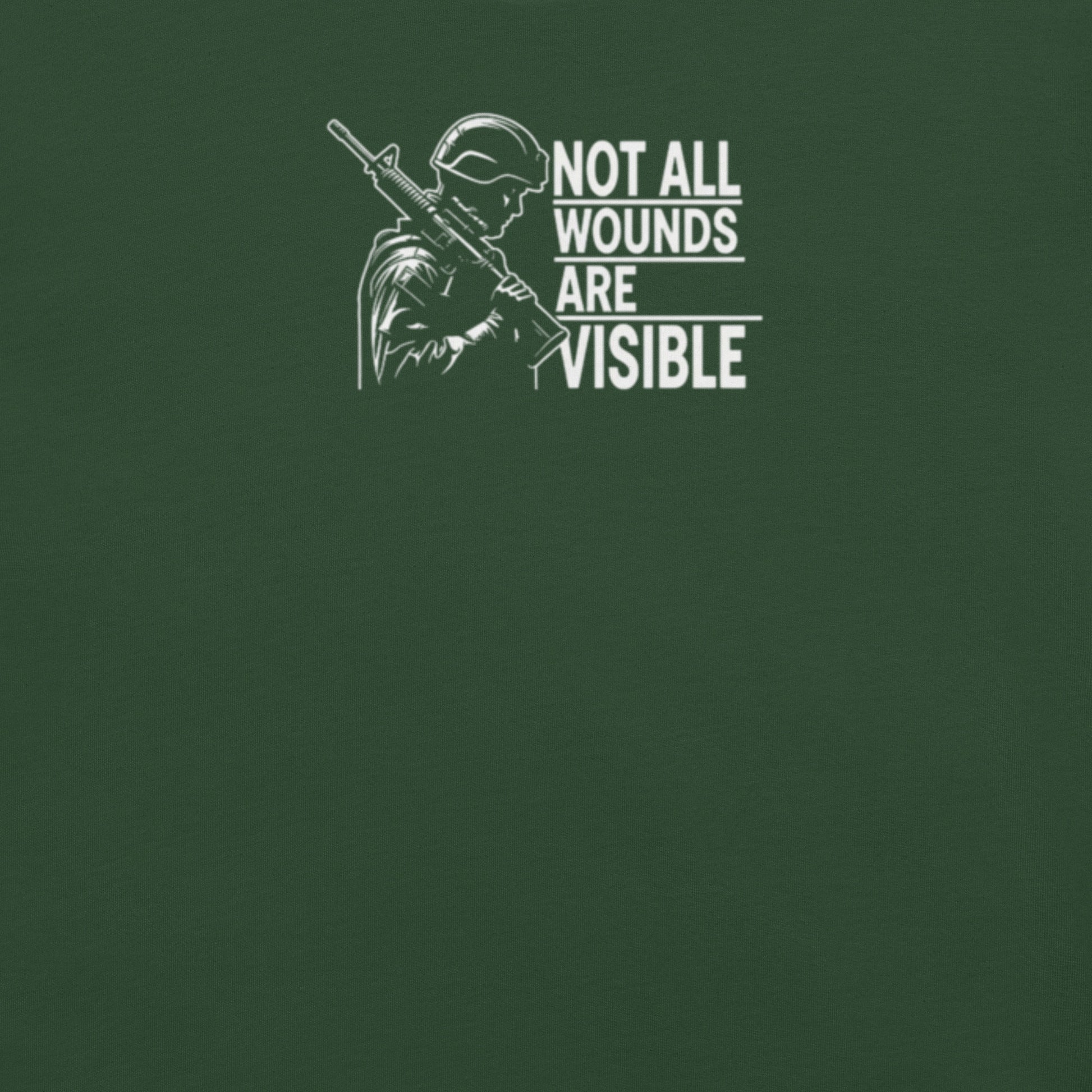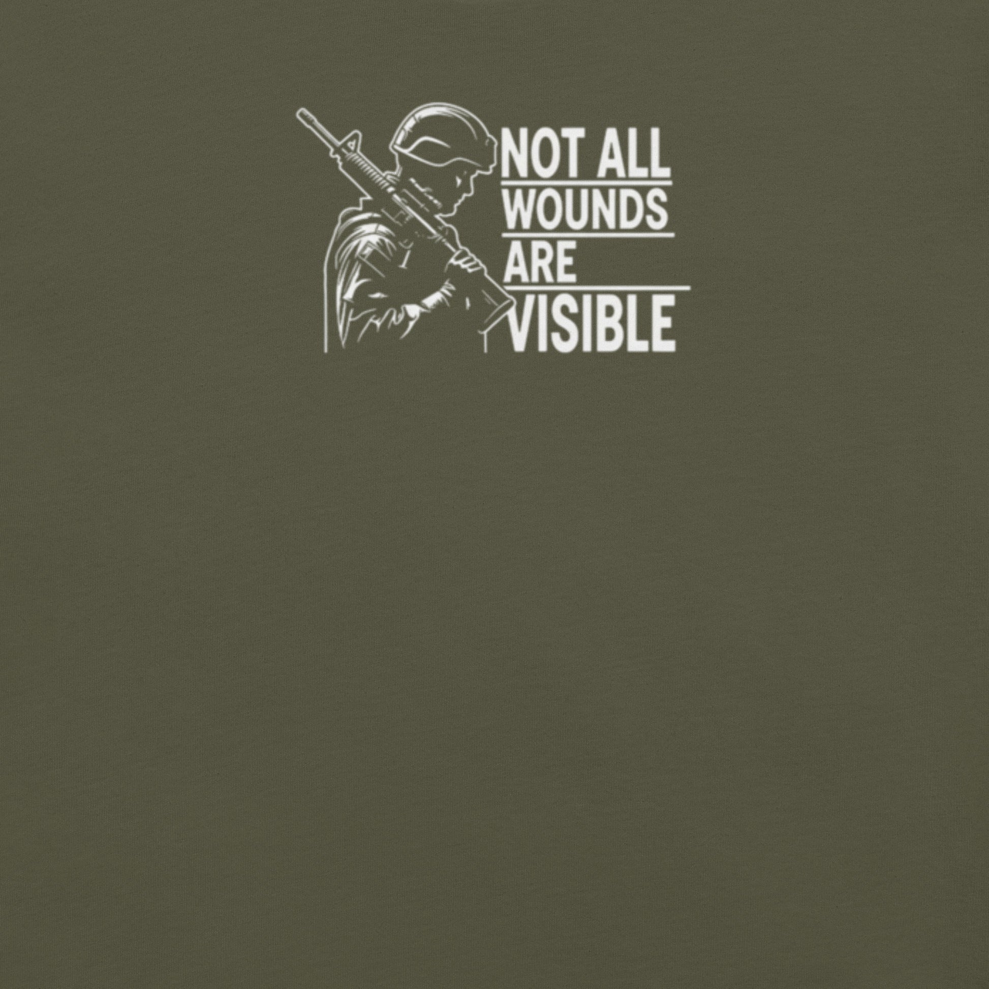 Underneath the image, the profound words “Not all wounds are visible” serve as a message of empathy and awareness. This shirt is for those who understand that courage is not just about what happens on the battlefield, but what is carried in the heart and mind long after.
