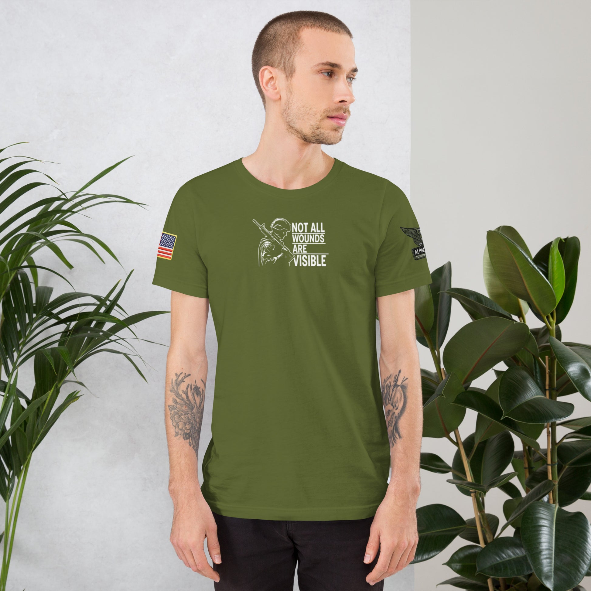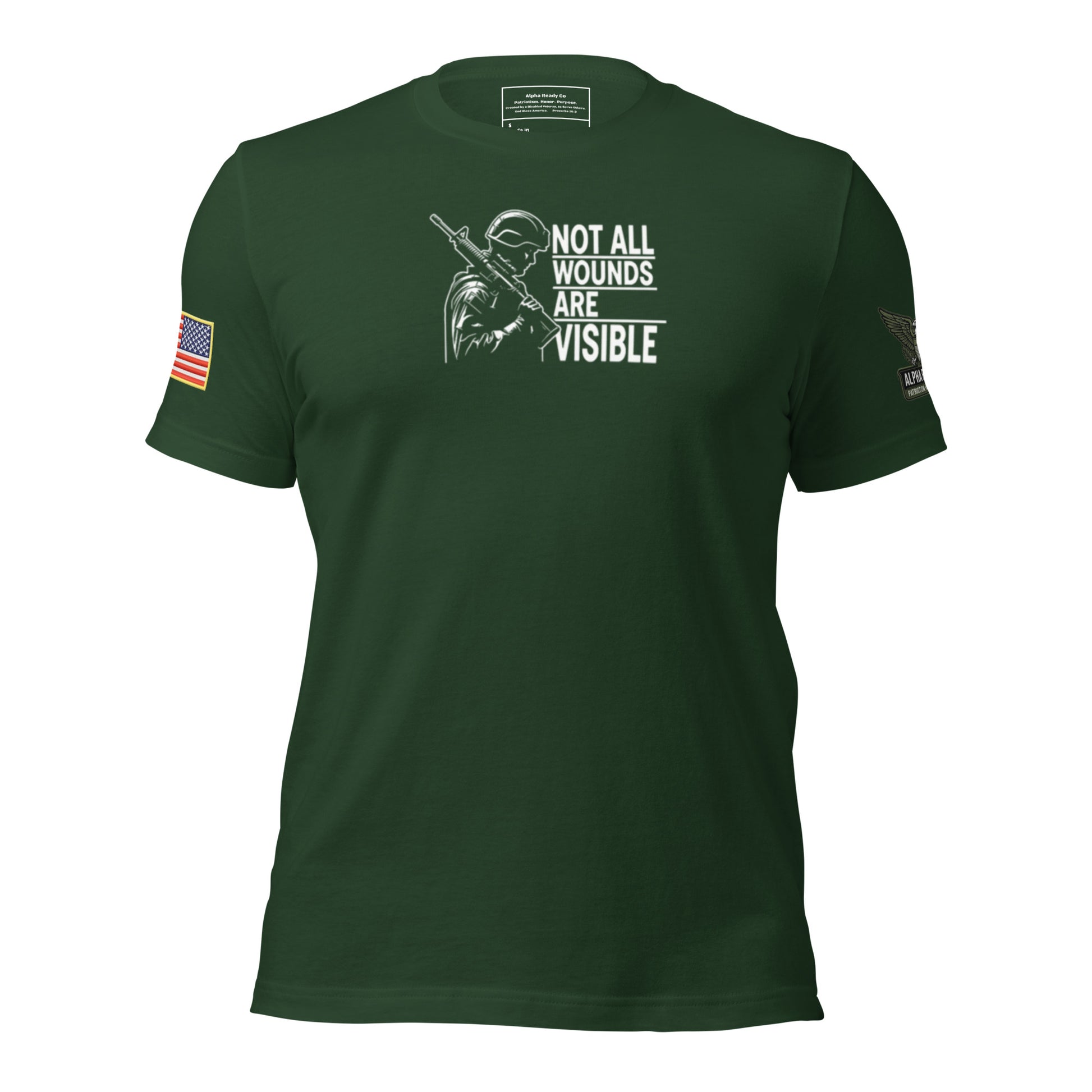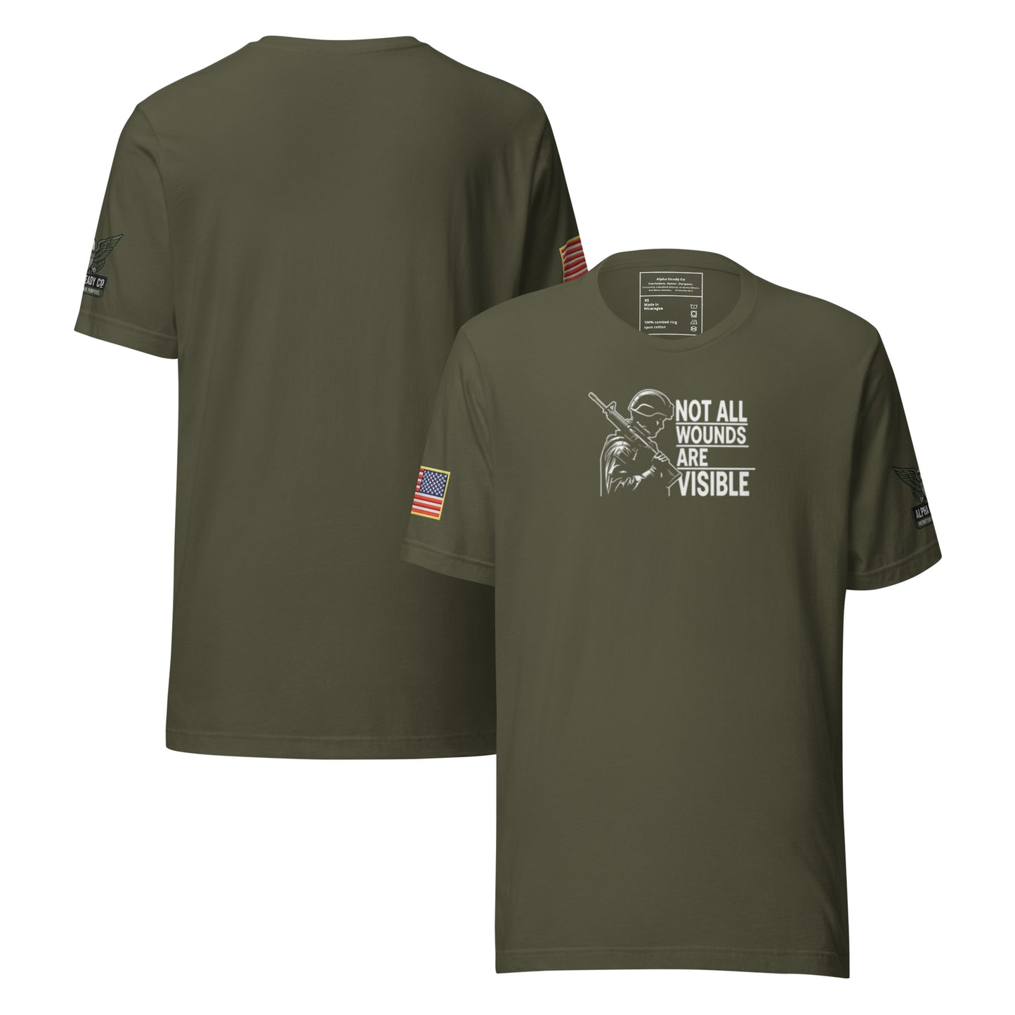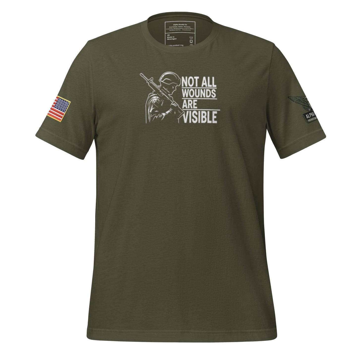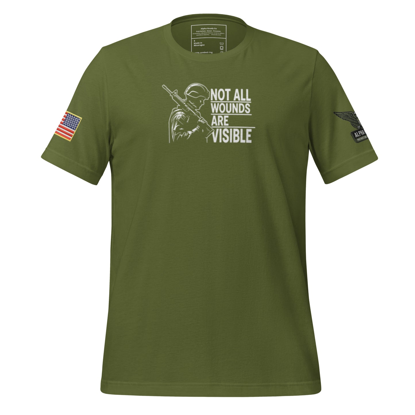 Underneath the image, the profound words “Not all wounds are visible” serve as a message of empathy and awareness. This shirt is for those who understand that courage is not just about what happens on the battlefield, but what is carried in the heart and mind long after.
