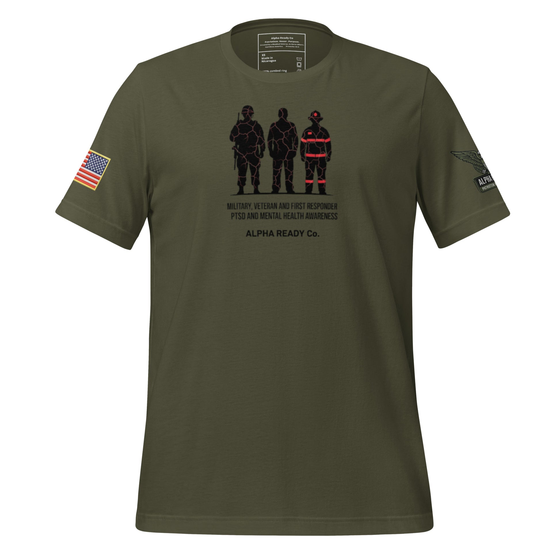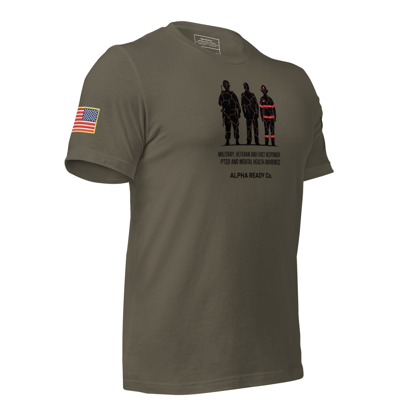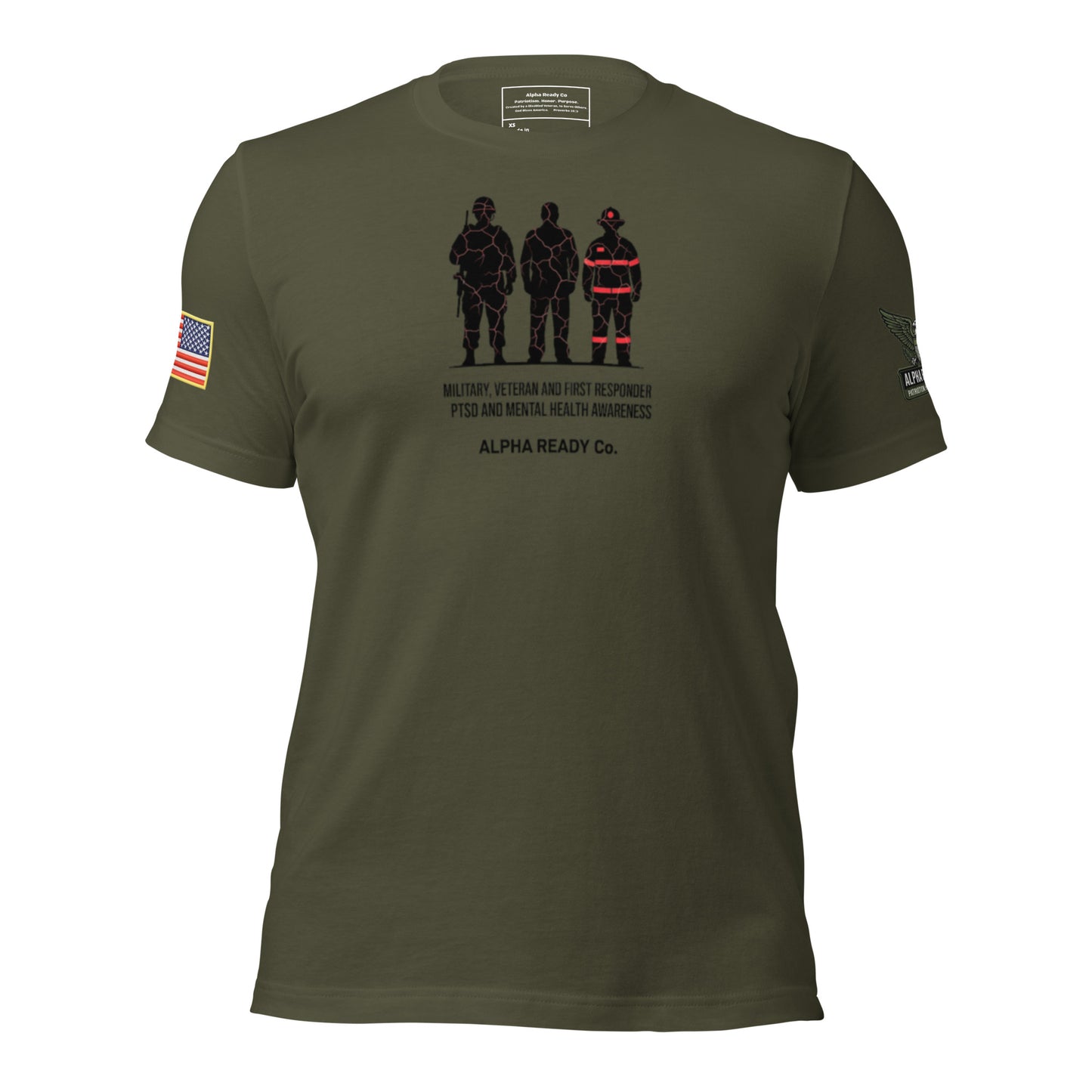 Underneath the imagery, the words "Military, Veteran, First Responder" acknowledge the individuals who carry these burdens, while the message "PTSD and Mental Health Awareness" calls attention to the crucial struggles that take place within. This shirt is a testament to the silent strength and resilience of those who are fighting an unseen battle every day.