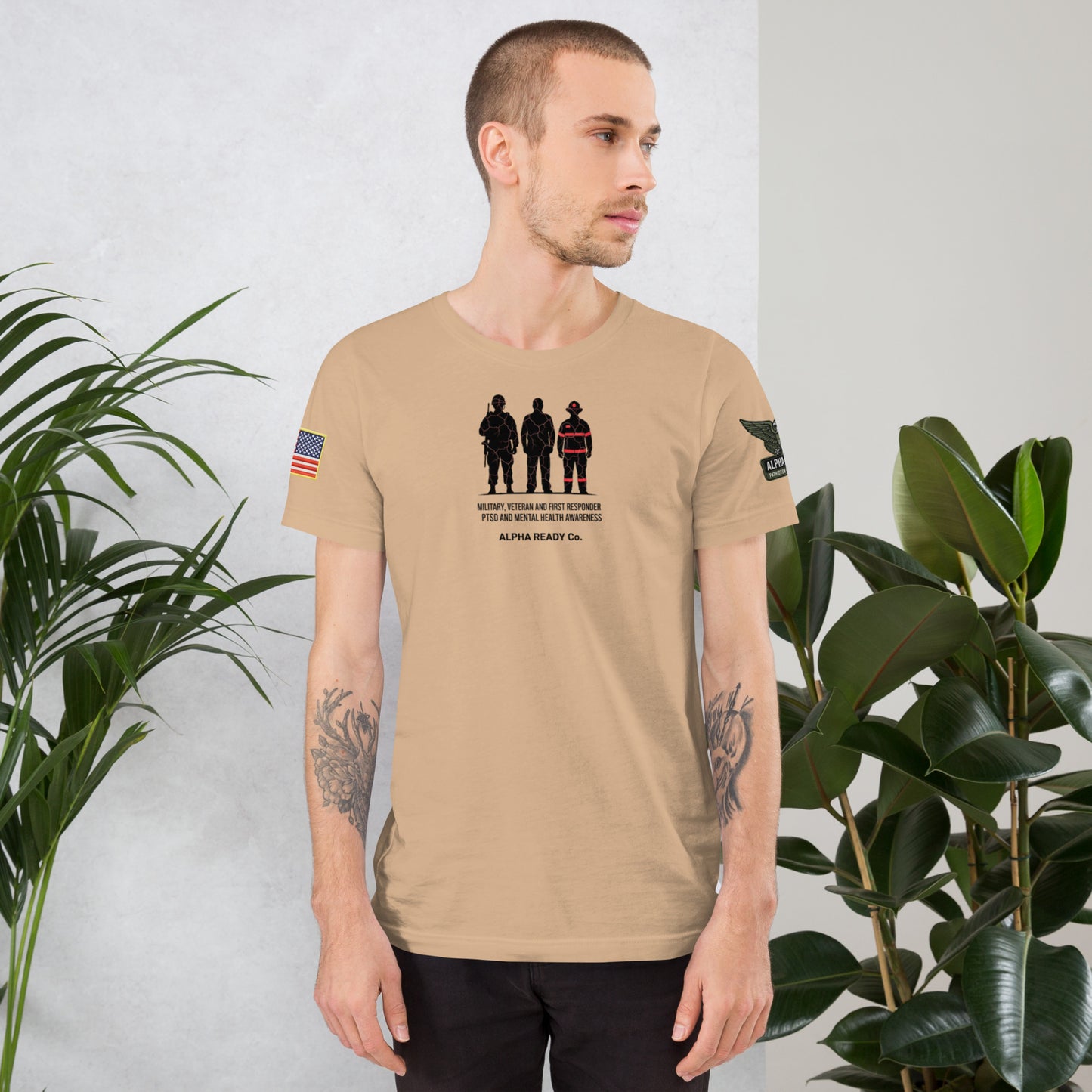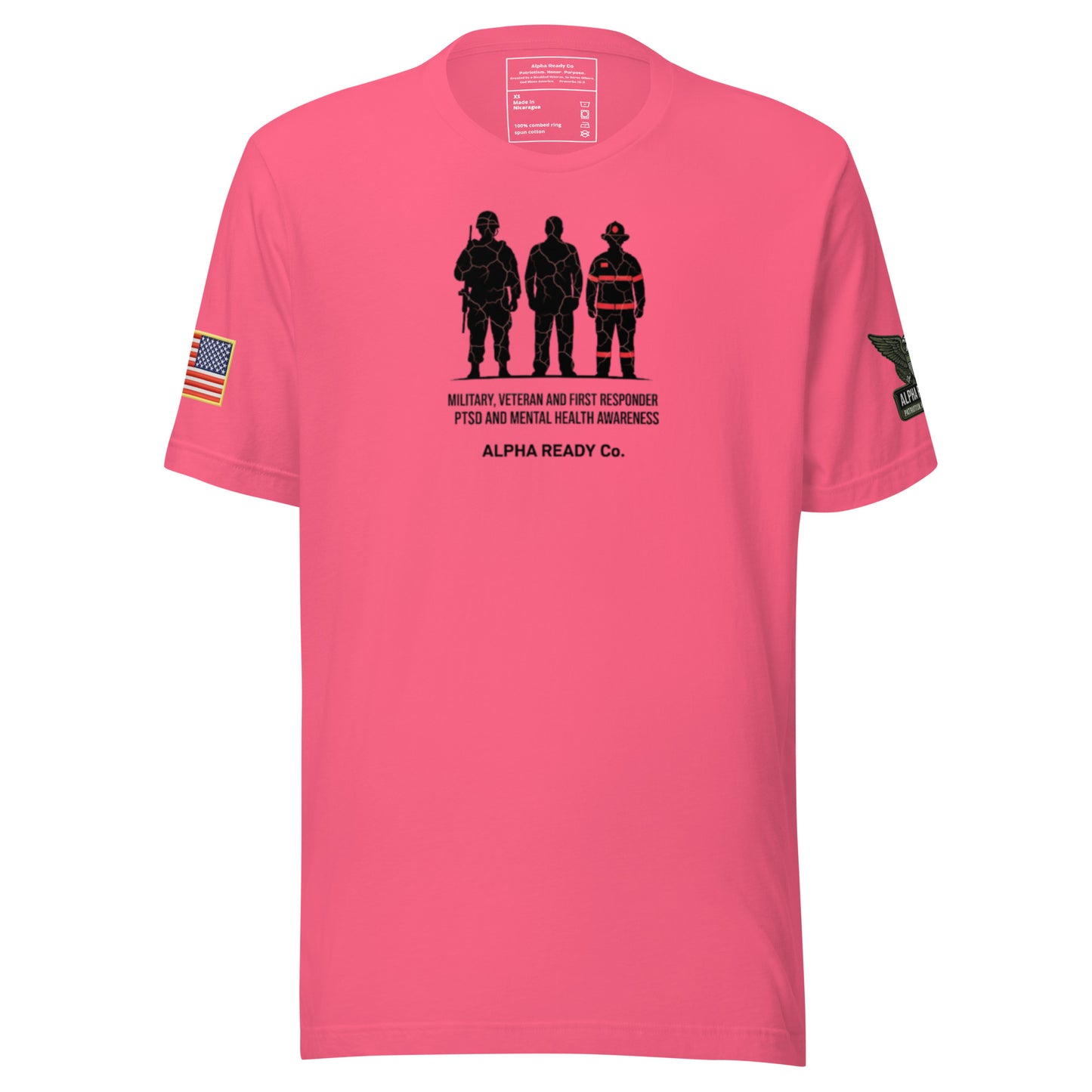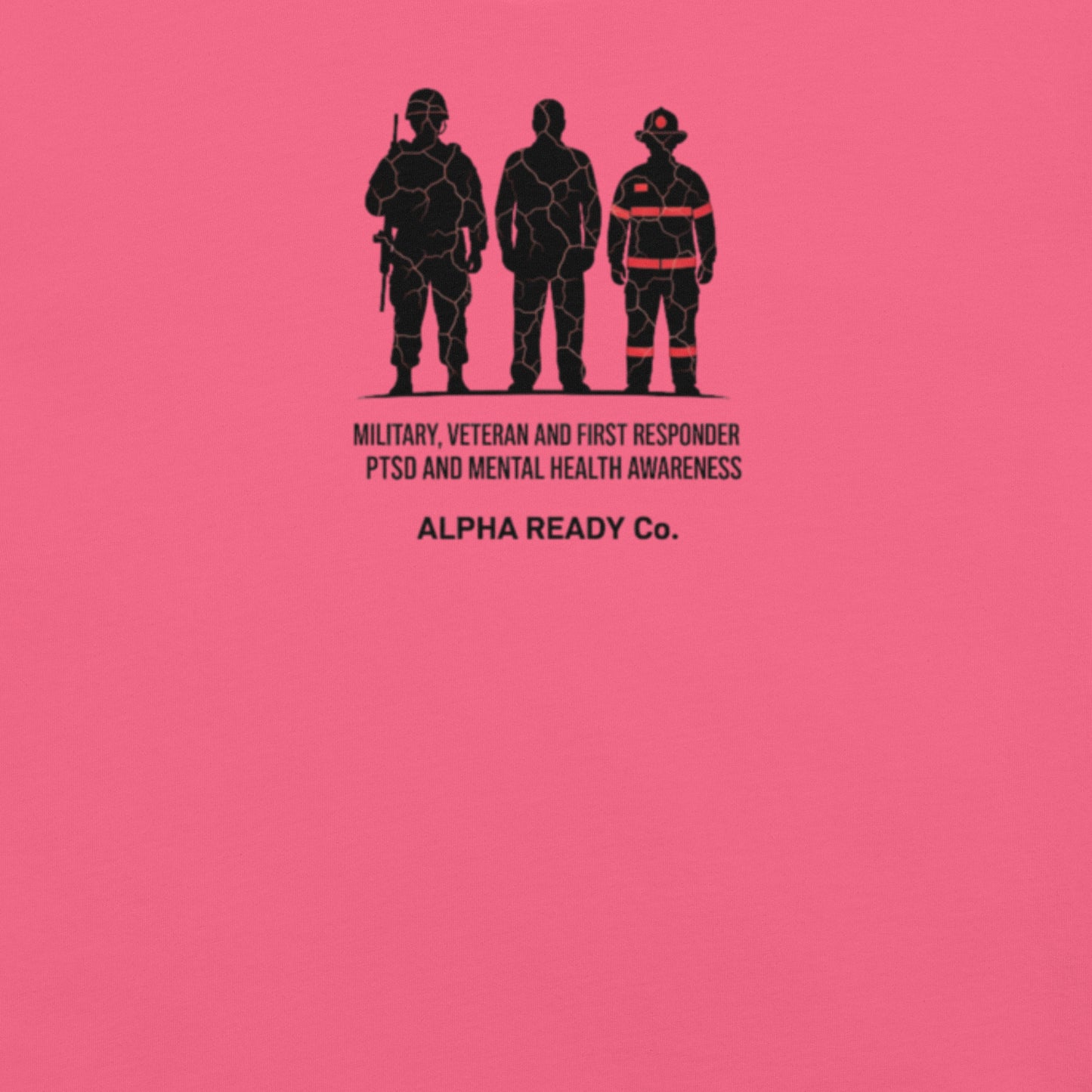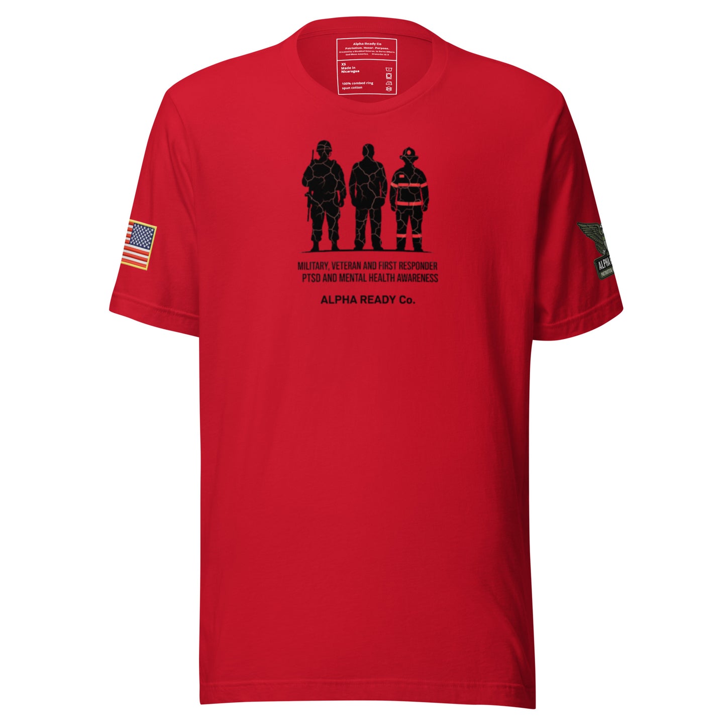 Underneath the imagery, the words "Military, Veteran, First Responder" acknowledge the individuals who carry these burdens, while the message "PTSD and Mental Health Awareness" calls attention to the crucial struggles that take place within. This shirt is a testament to the silent strength and resilience of those who are fighting an unseen battle every day.