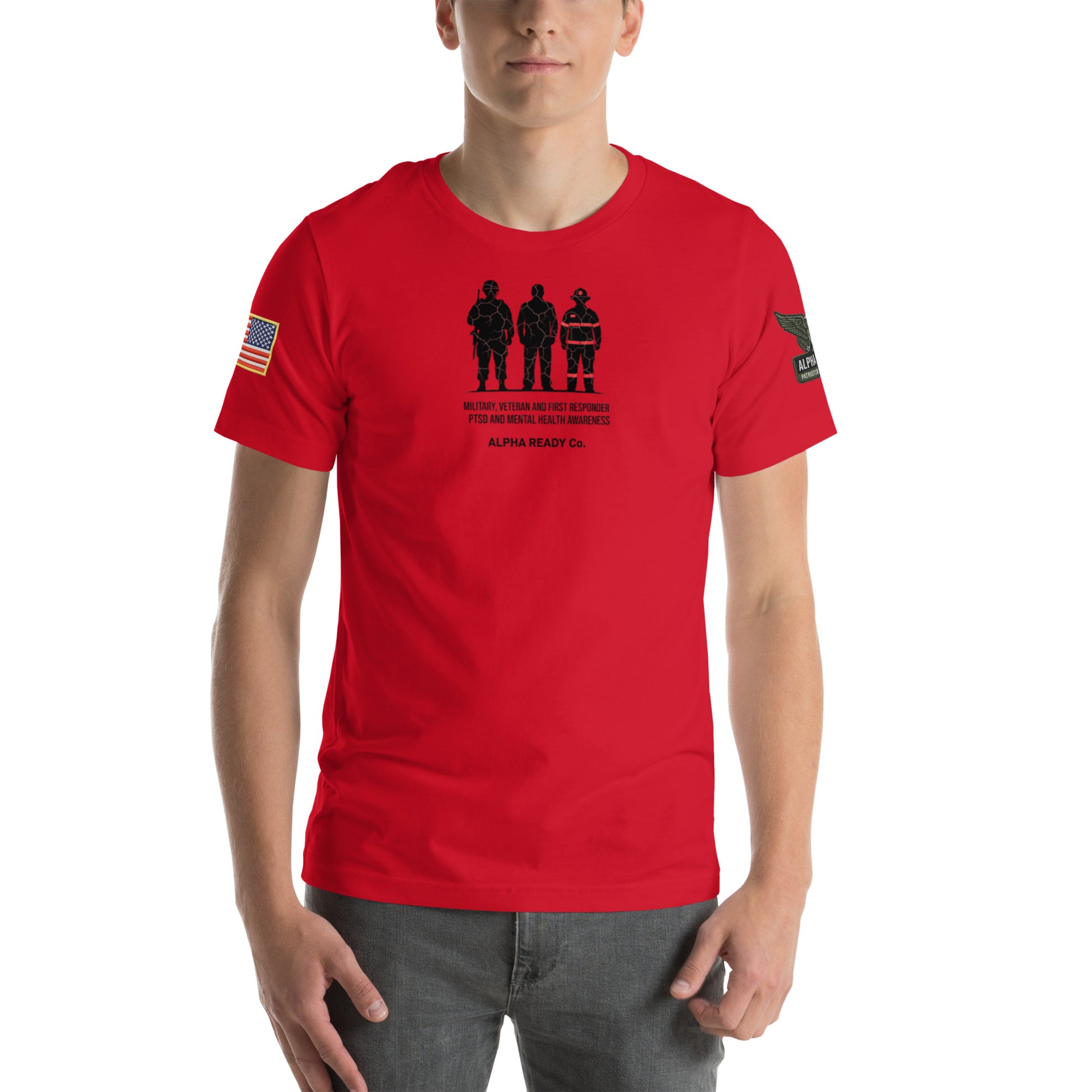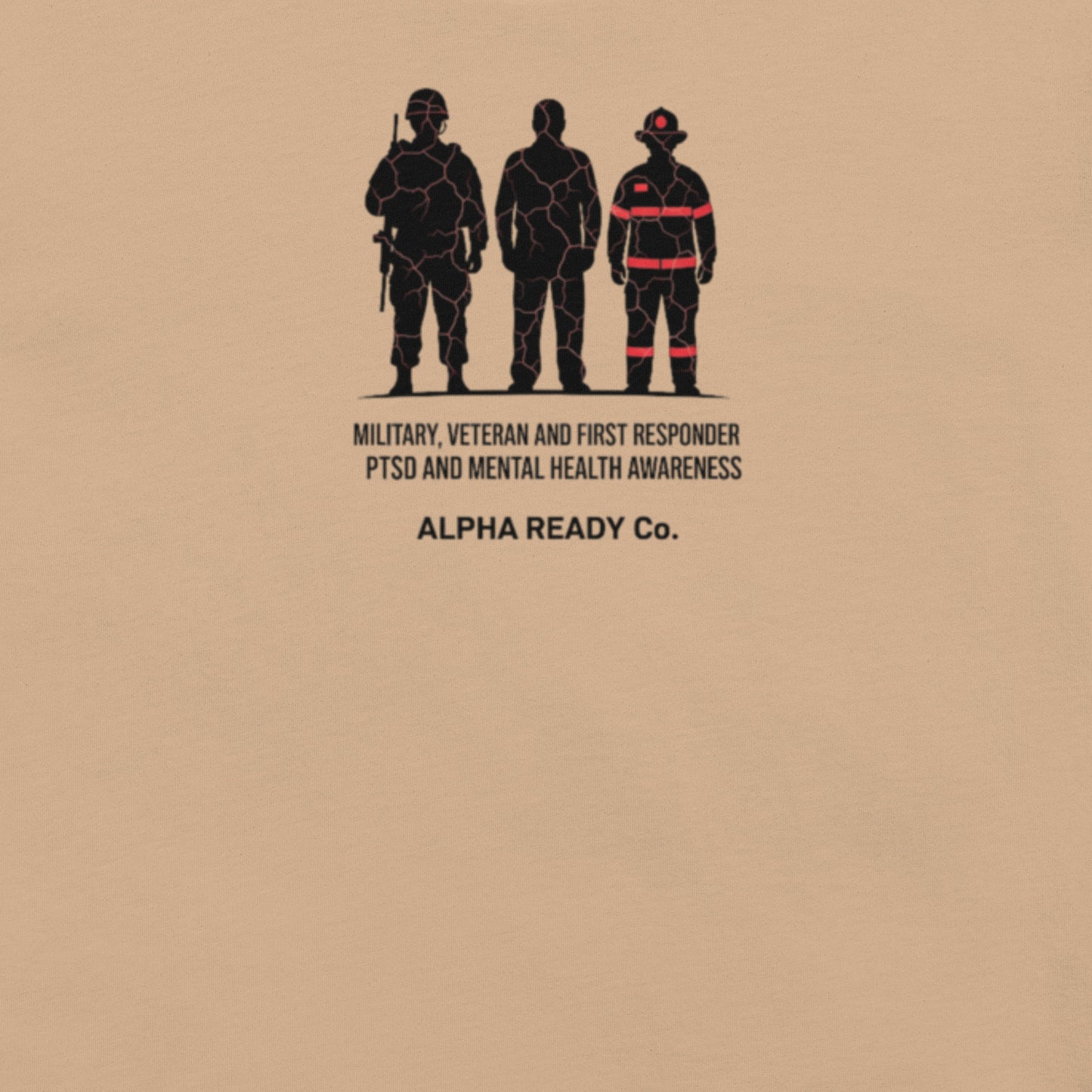 The shirt features the same three figures—a soldier, a cop, and a firefighter. Their bodies are depicted with cracks that symbolize the internal toll of their service—the emotional fractures and burdens that are often invisible to the outside world.
