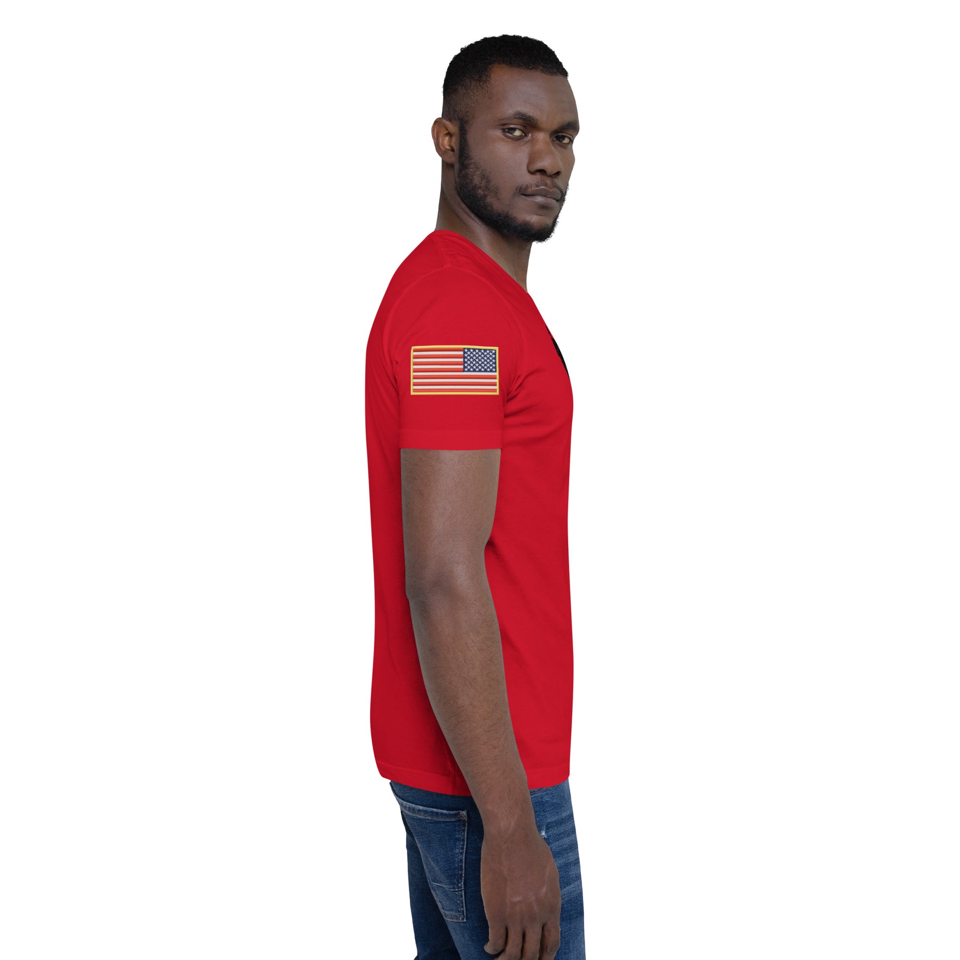 To further amplify its patriotic spirit, the American flag is boldly printed in color on the right sleeve, while our distinctive Alpha Ready Co. logo adorns the left.