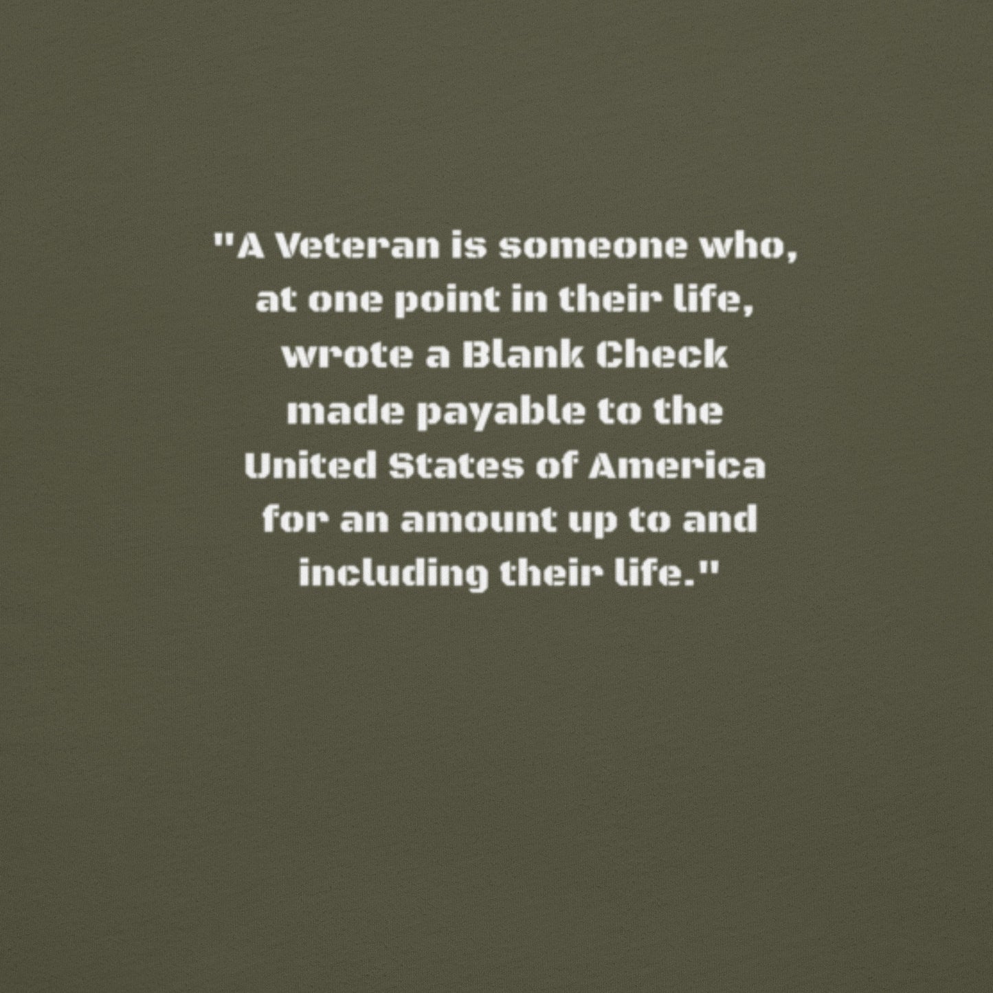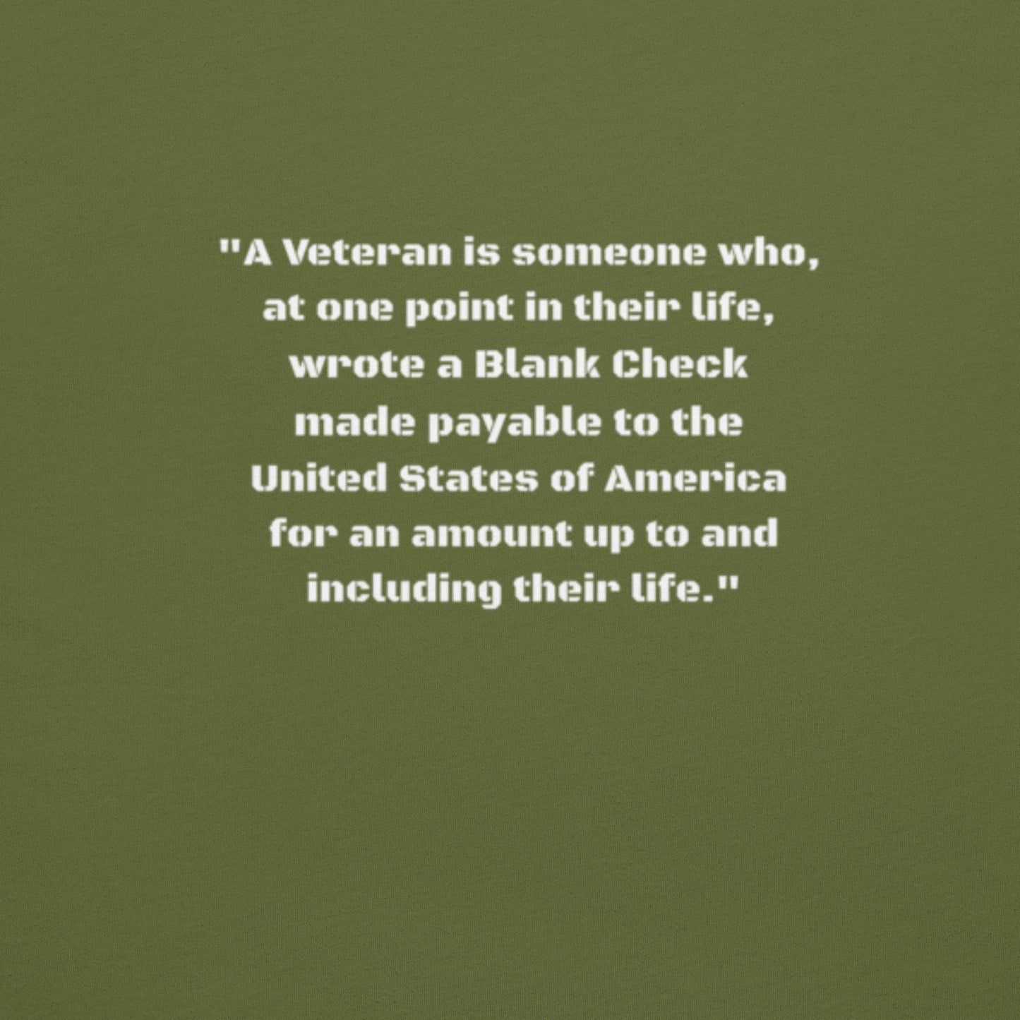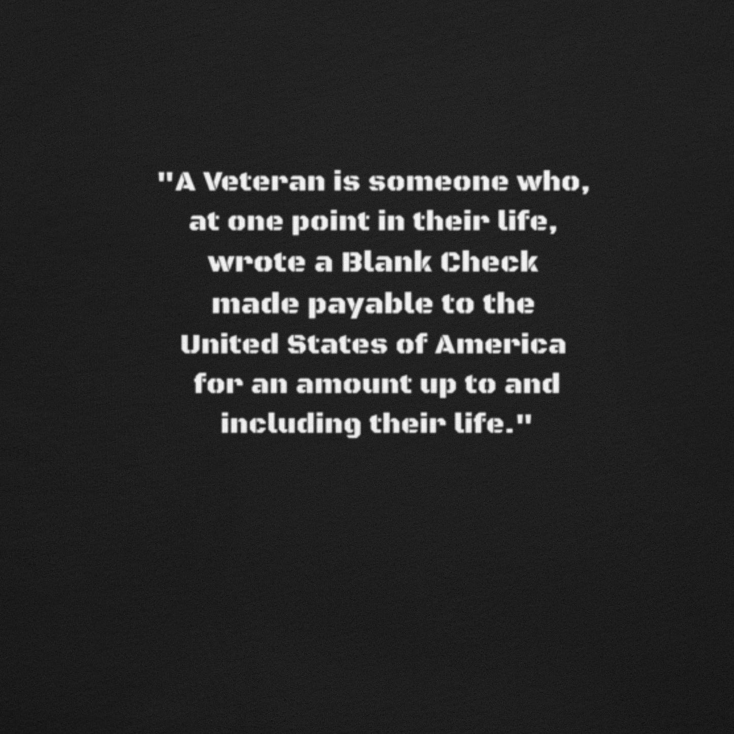 The back features a quote that captures the essence of that sacrifice: "A veteran is someone who, at one point in their life, wrote a Blank Check made payable to the United States of America for an amount up to and including their life." This shirt is a tribute to the ultimate act of service and dedication.