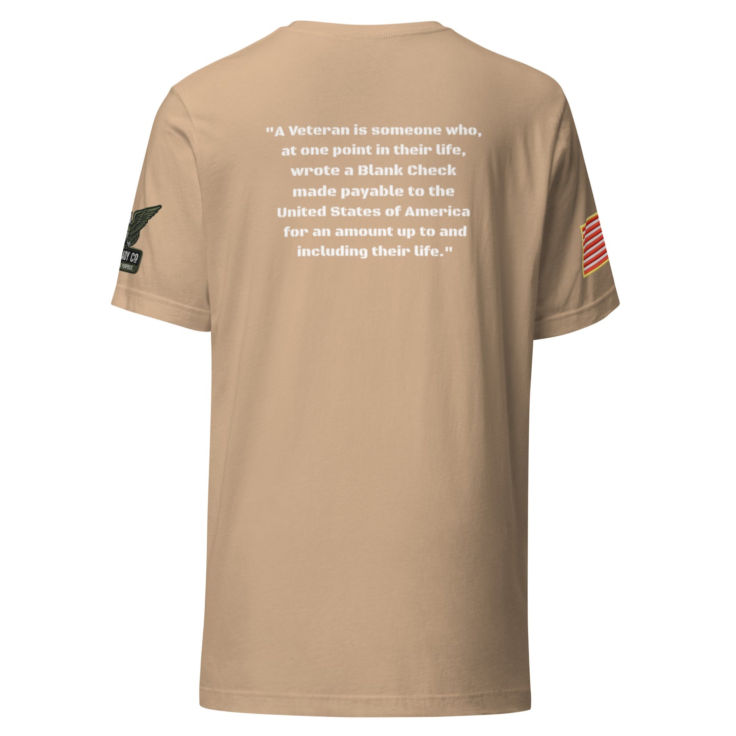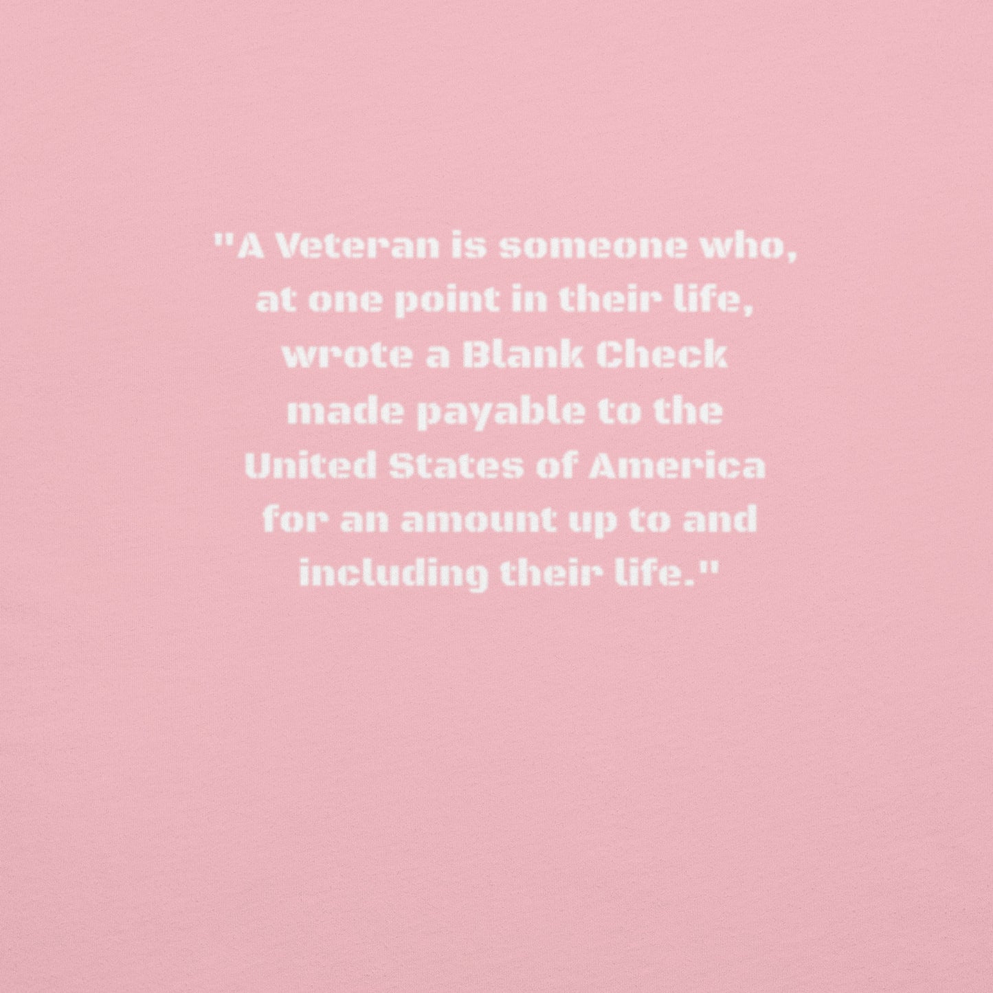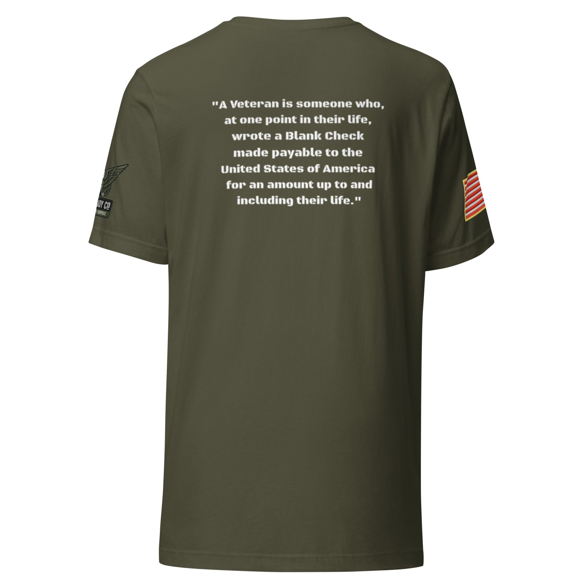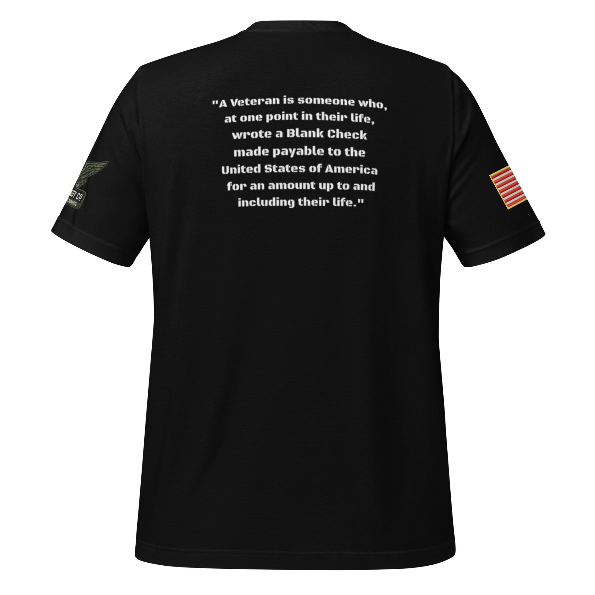 The back features a quote that captures the essence of that sacrifice: "A veteran is someone who, at one point in their life, wrote a Blank Check made payable to the United States of America for an amount up to and including their life." This shirt is a tribute to the ultimate act of service and dedication.