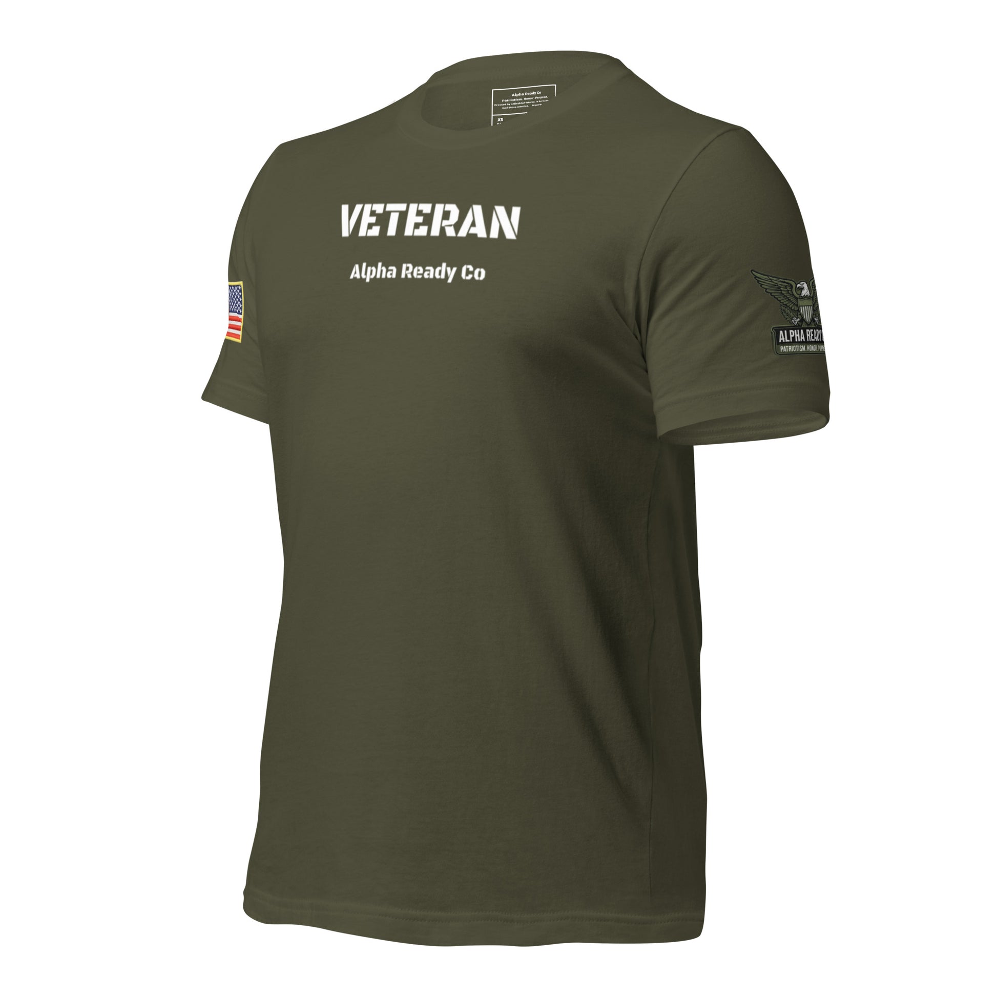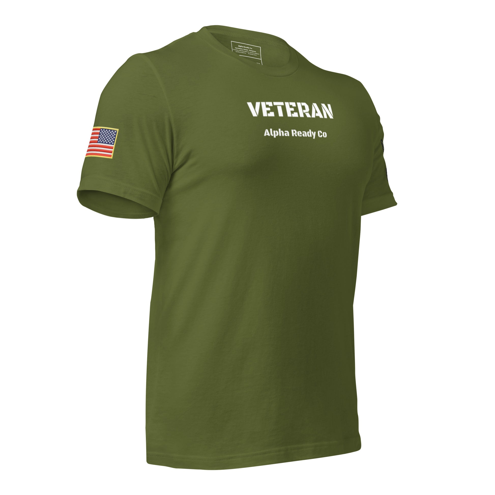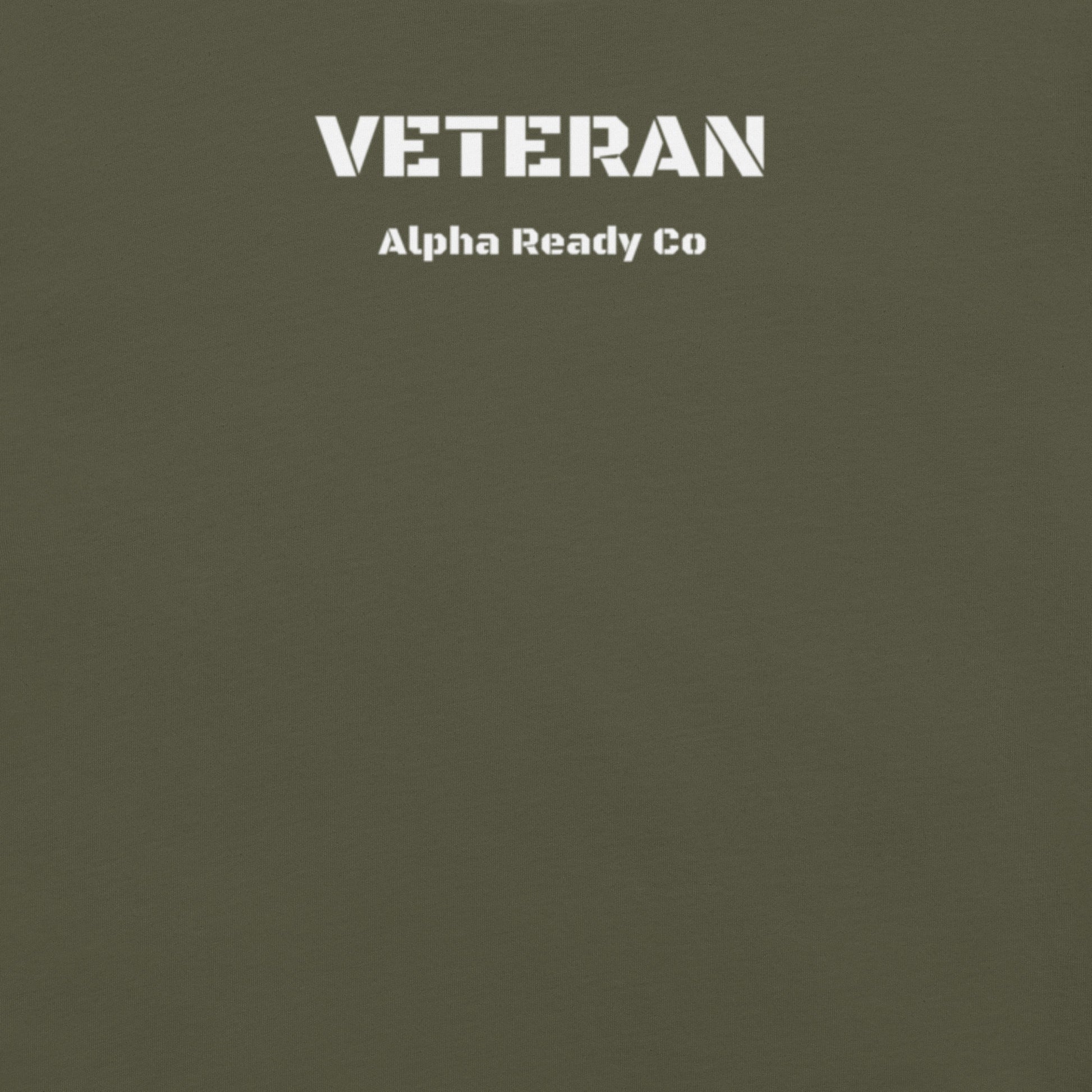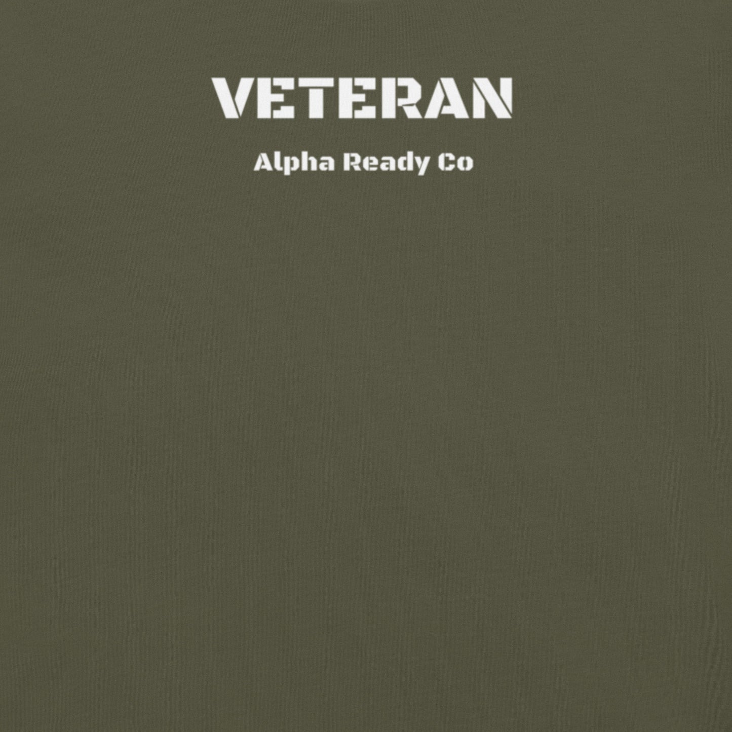 A simple design with a powerful message. This shirt honors the profound commitment of those who have served. On the front, it proudly displays Veteran and our brand, Alpha Ready Co.
