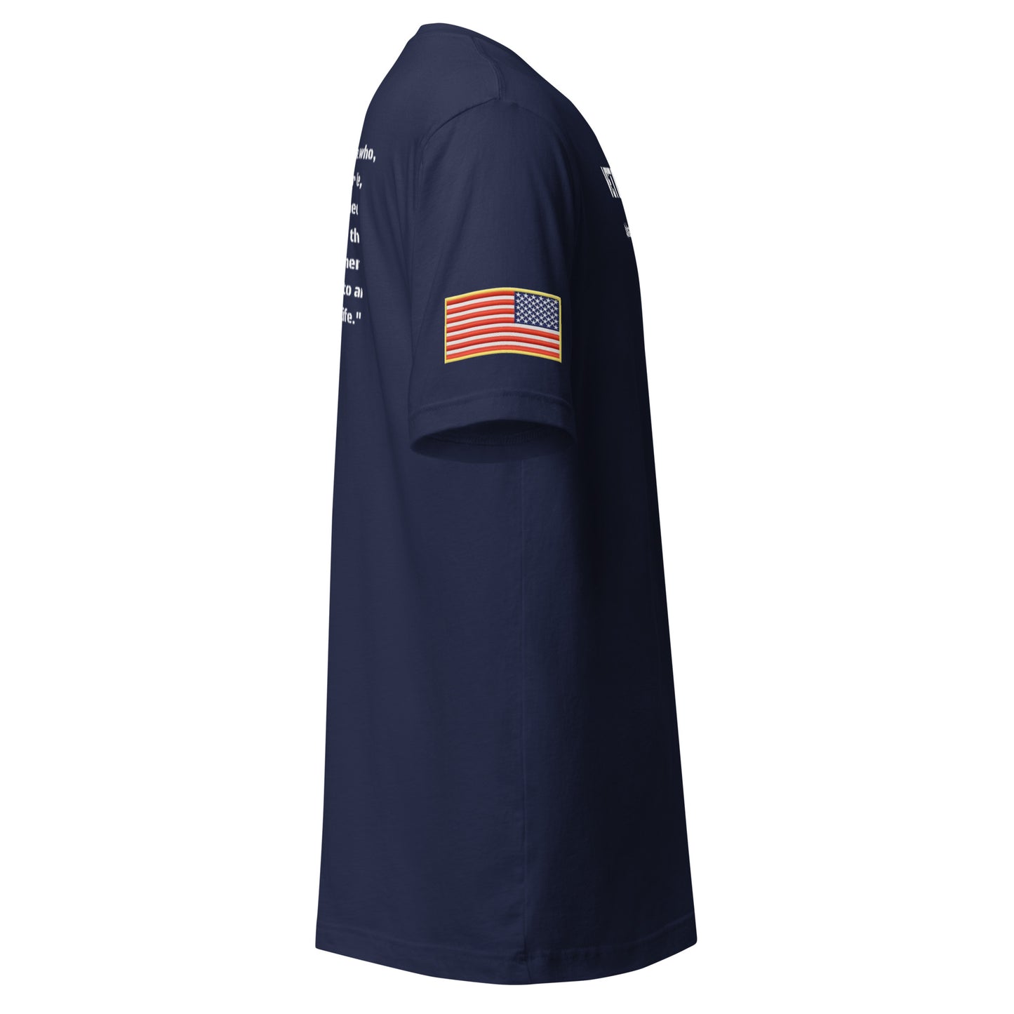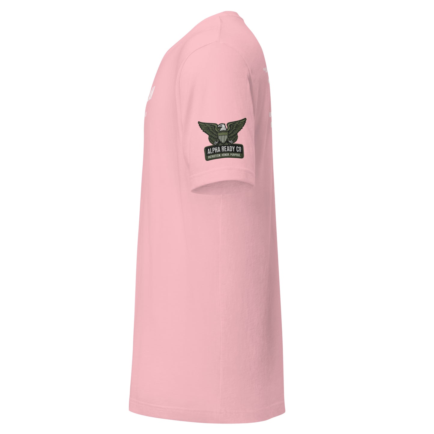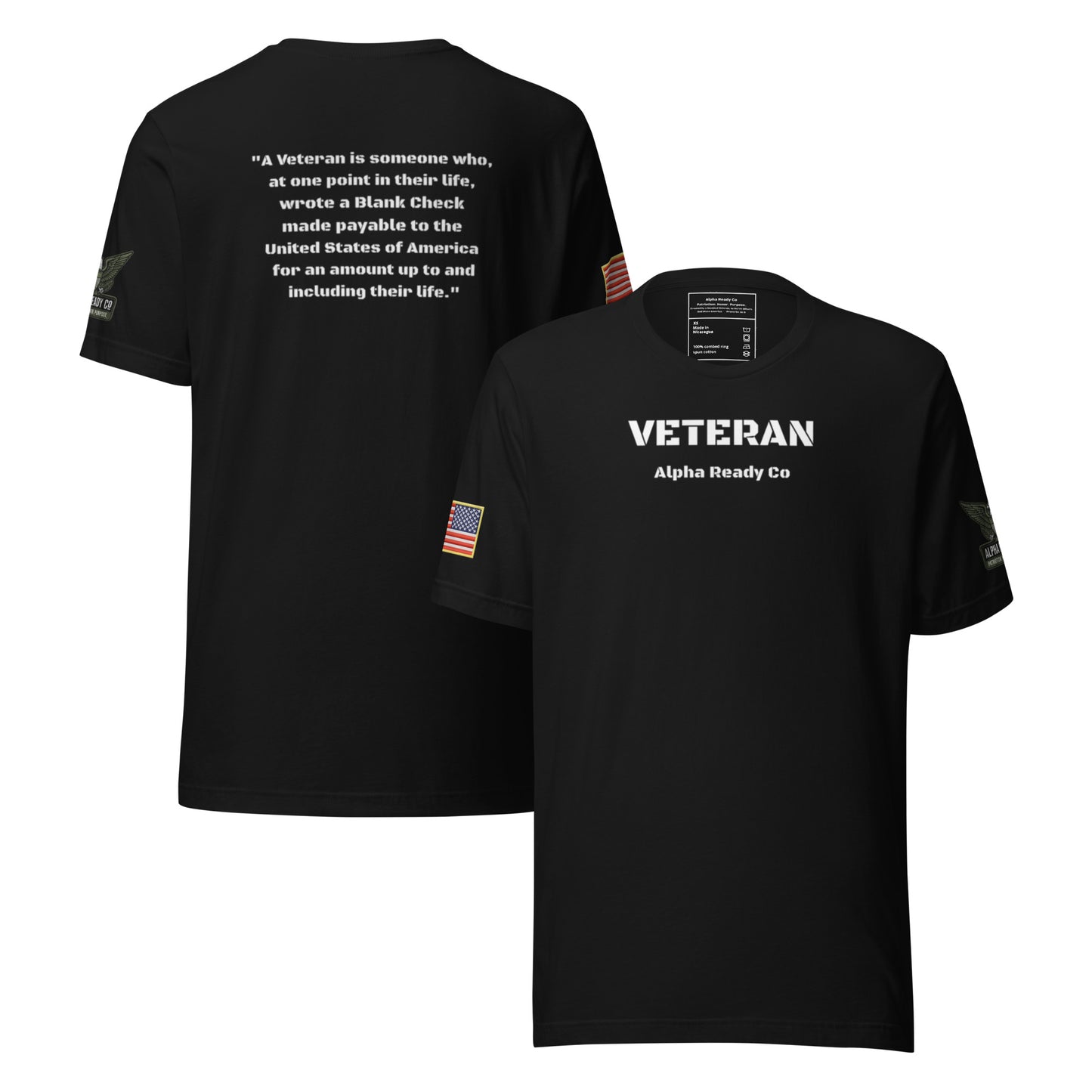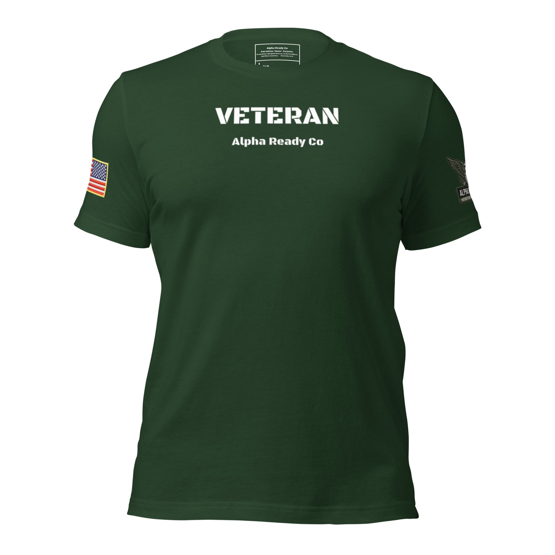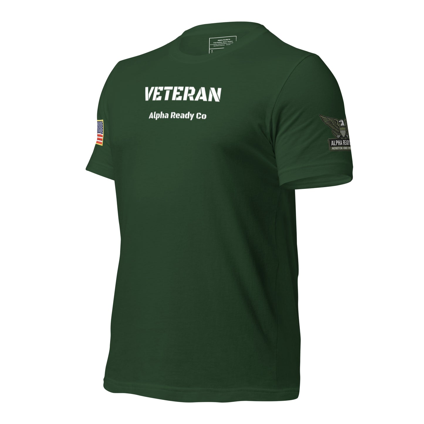 A simple design with a powerful message. This shirt honors the profound commitment of those who have served. On the front, it proudly displays Veteran and our brand, Alpha Ready Co.